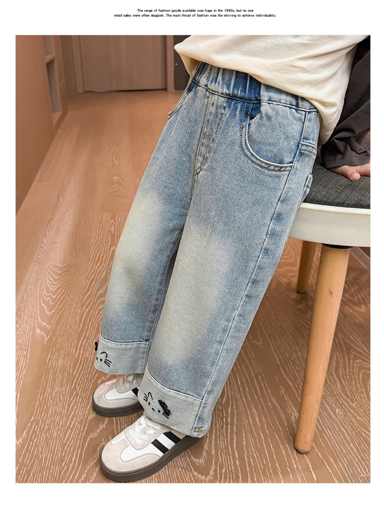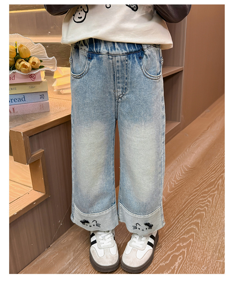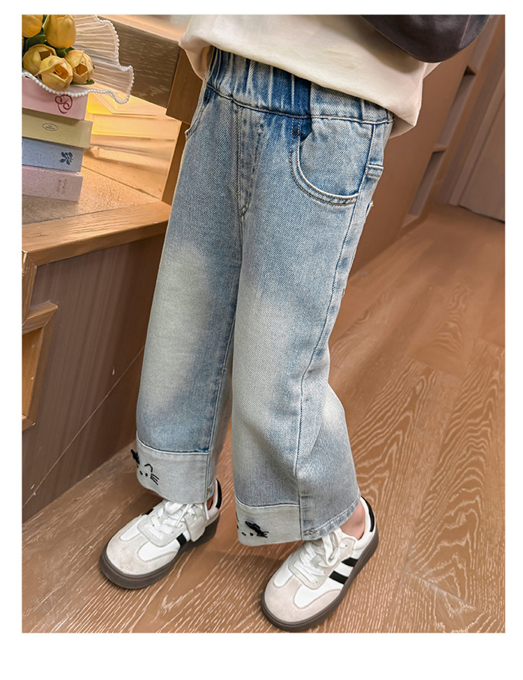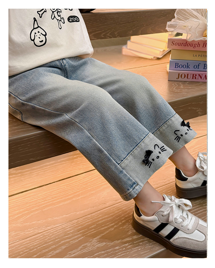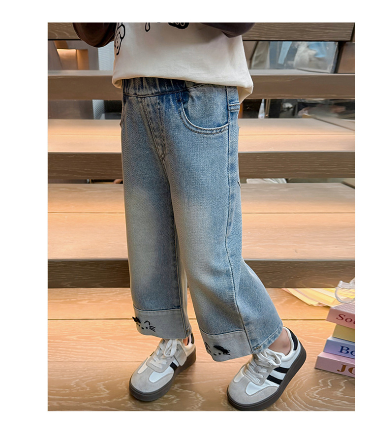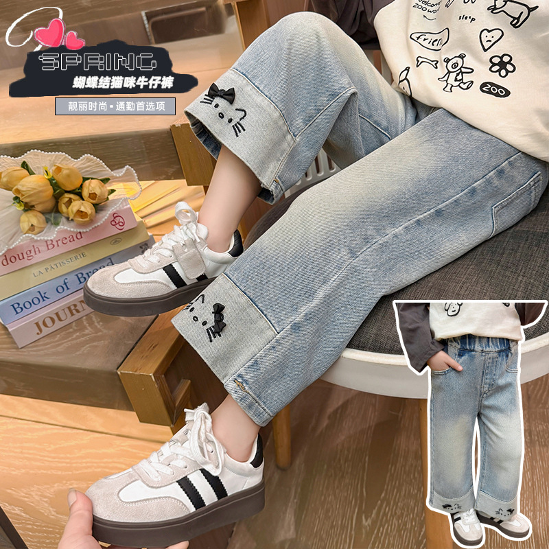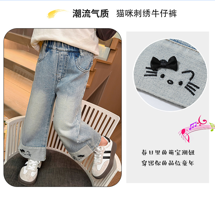 여자 키티 청바지 봄과 가을 2025 새로운 패션 어린 소녀 세련된 바지 중소 어린이 스트레이트 다리 바지스토어 가기
