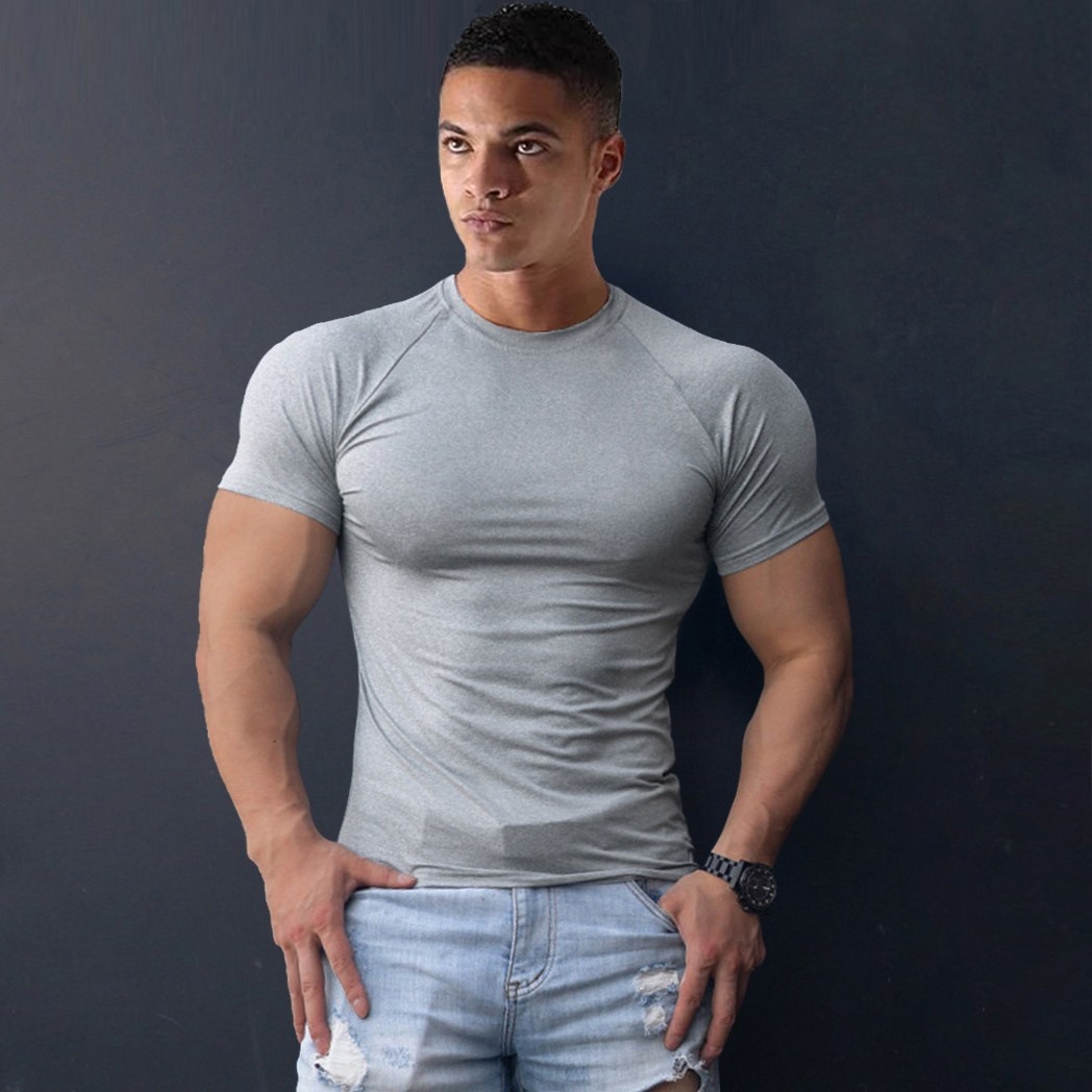 국경을 넘는 새로운 근육 스포츠 티셔츠 남성용 라운드 넥 피트니스 반팔 탄성 슬림 핏 퀵 드라이 트레이닝 피트니스 의류