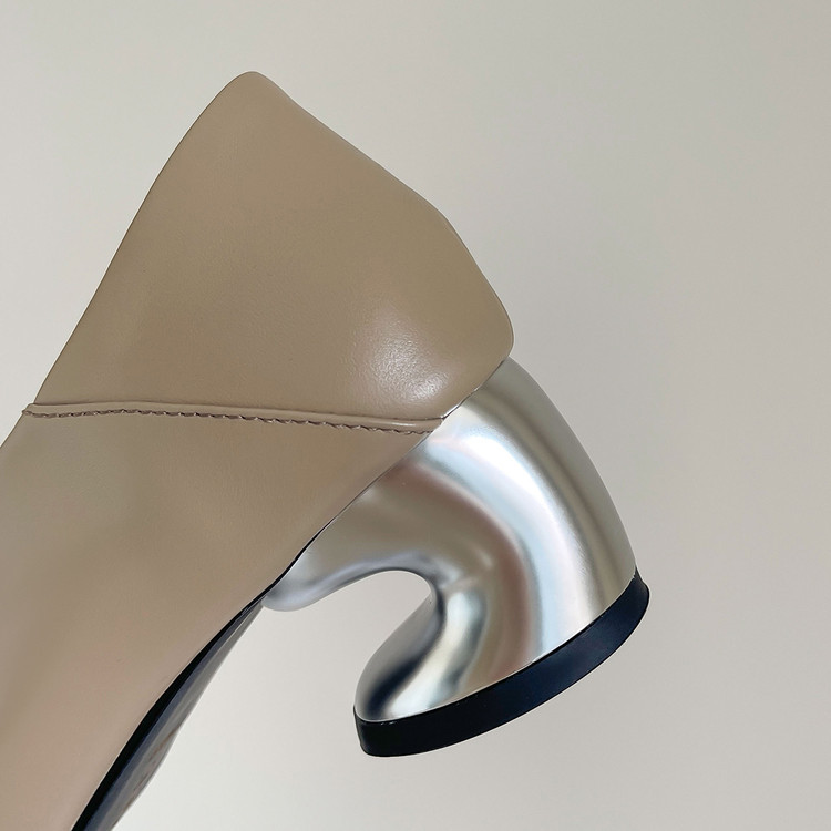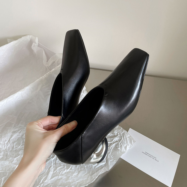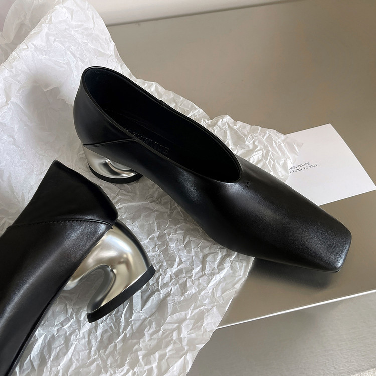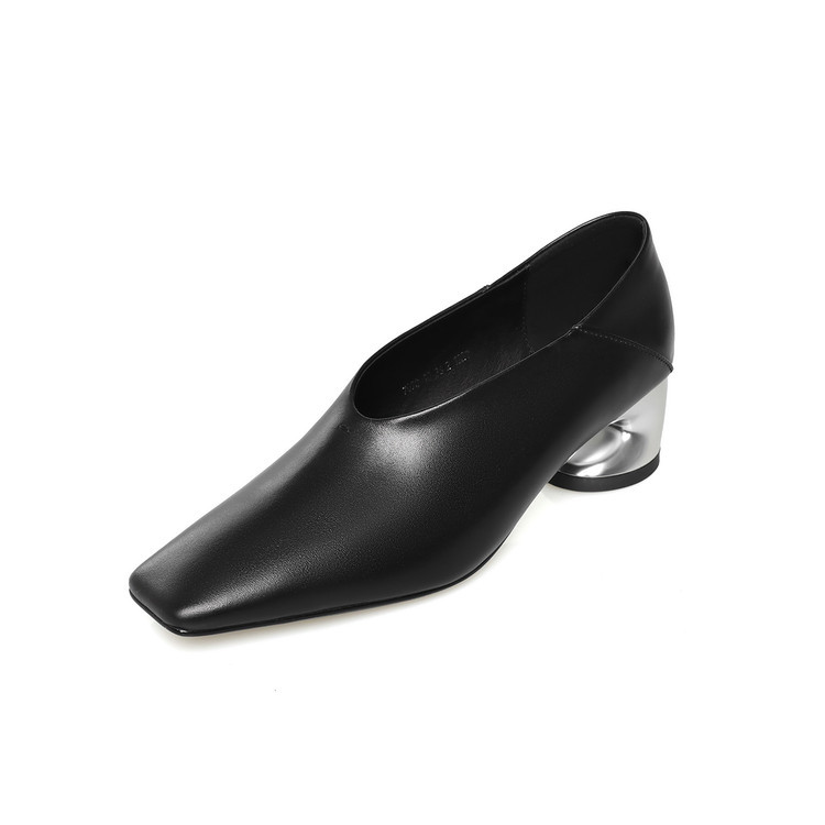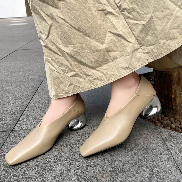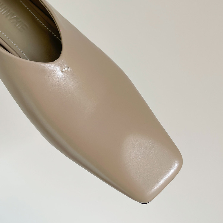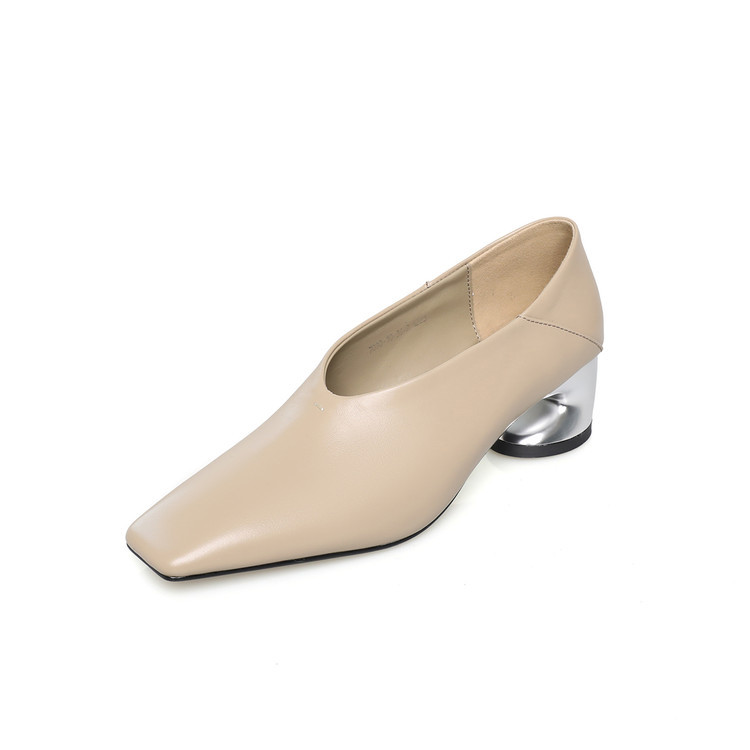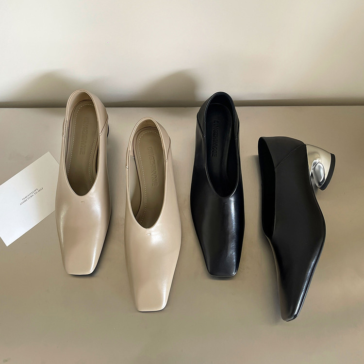 매우 간단한 부드러운 가죽 V-입 진한 베이지 밀크 신발 여성용 소 가죽 로우 입 싱글 신발 스퀘어 토 플랫 슈즈 로우 힐 마녀 신발