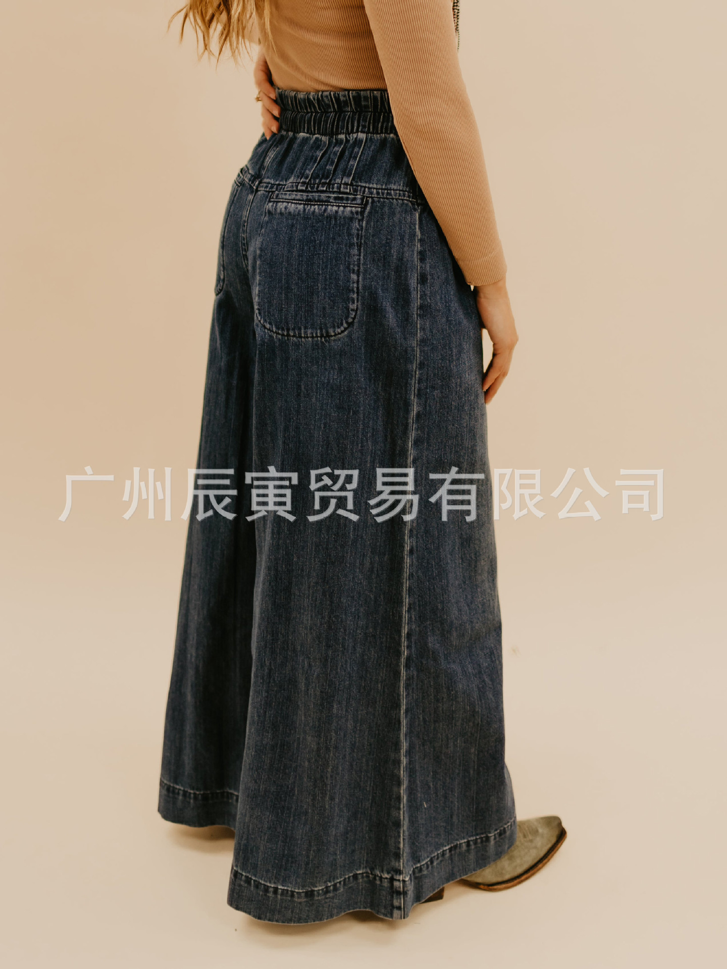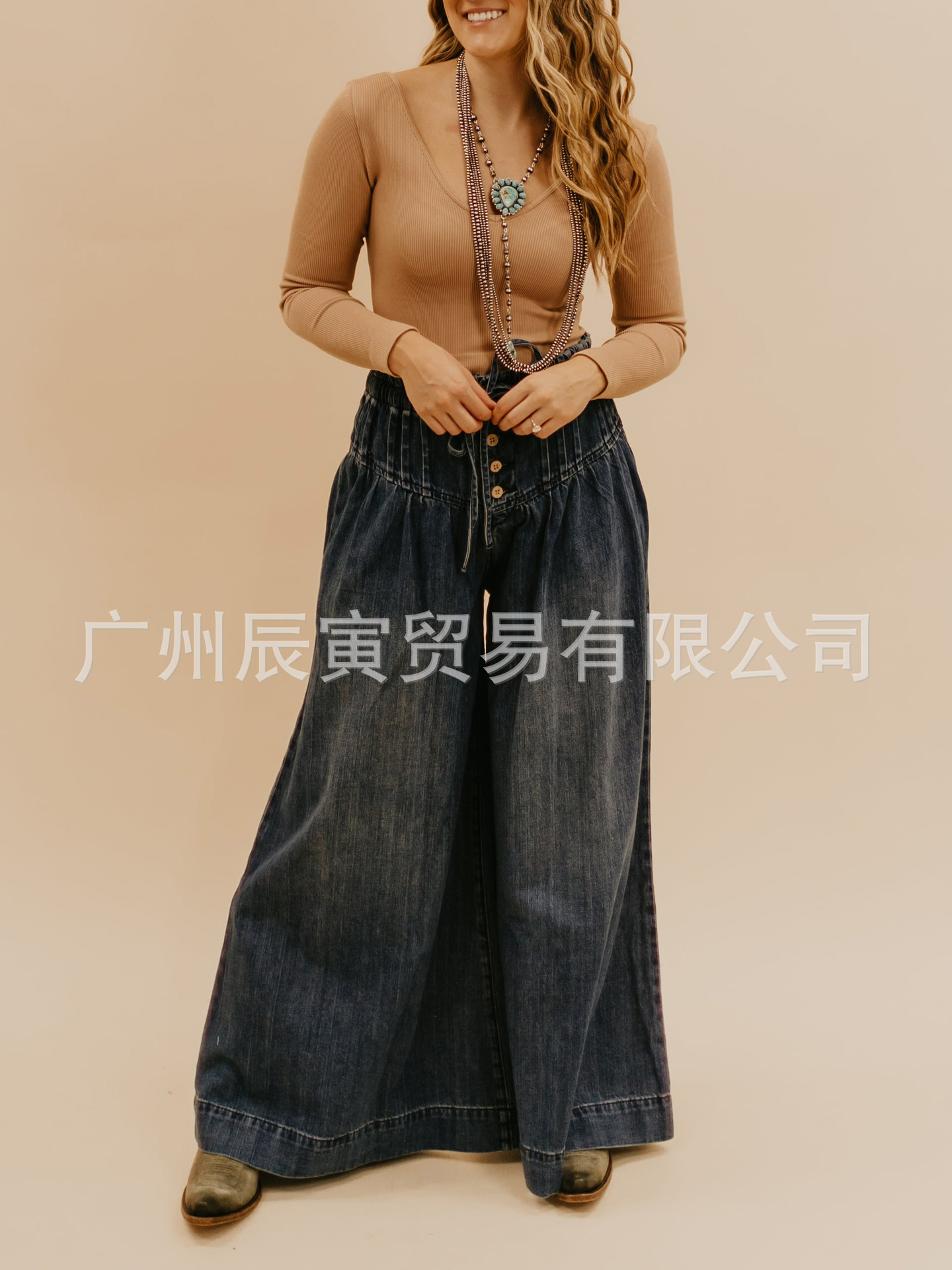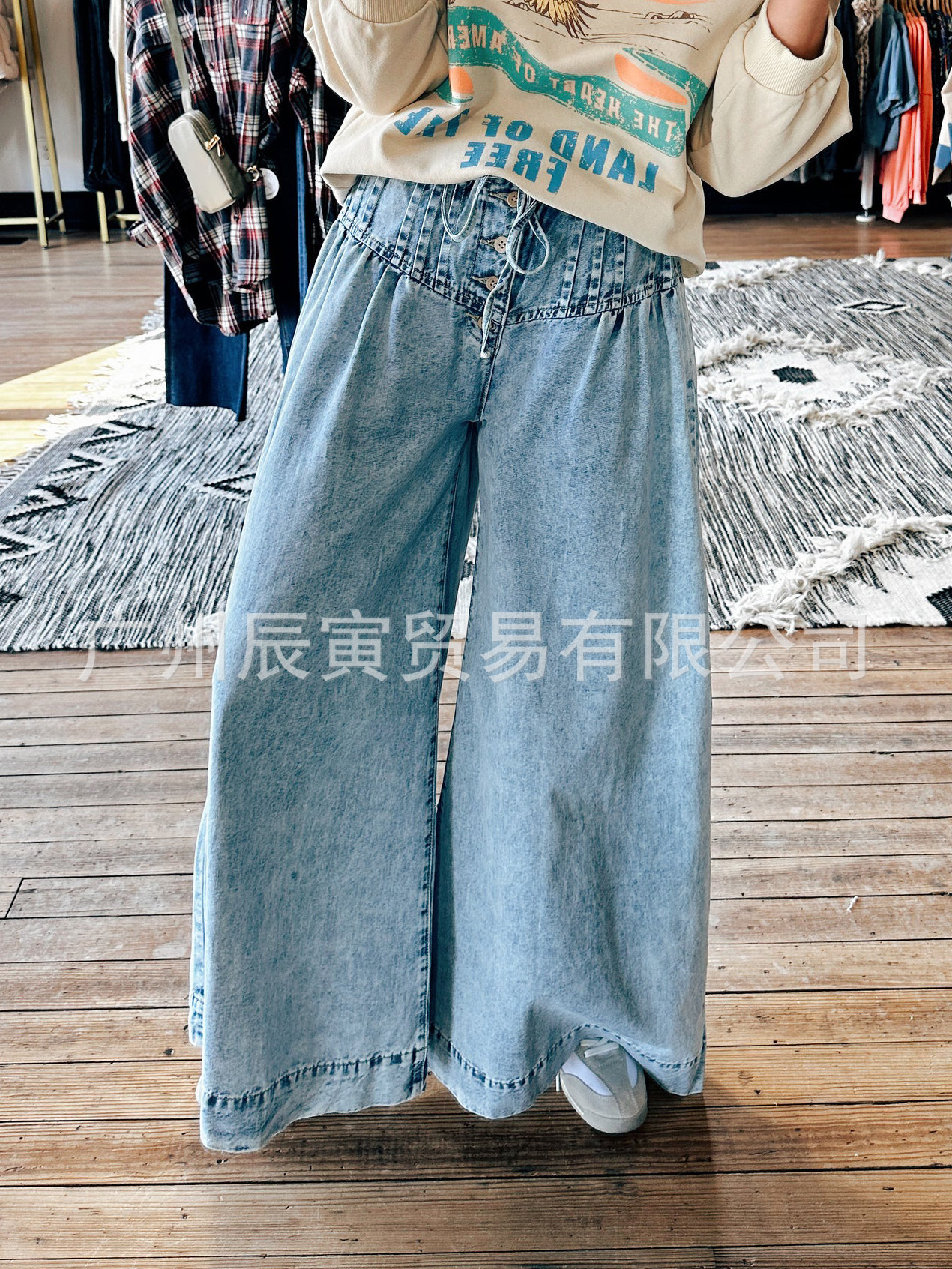 Ins 새로운 유럽 및 미국 여성 면화 바지 레트로 틈새 타이트 허리 효소 워시 와이드 다리 청바지스토어 가기