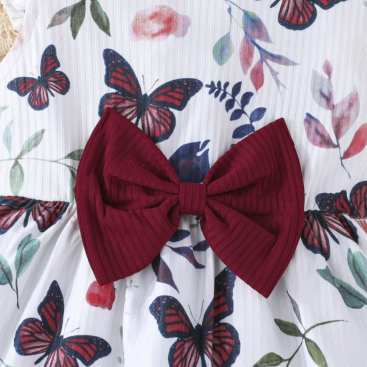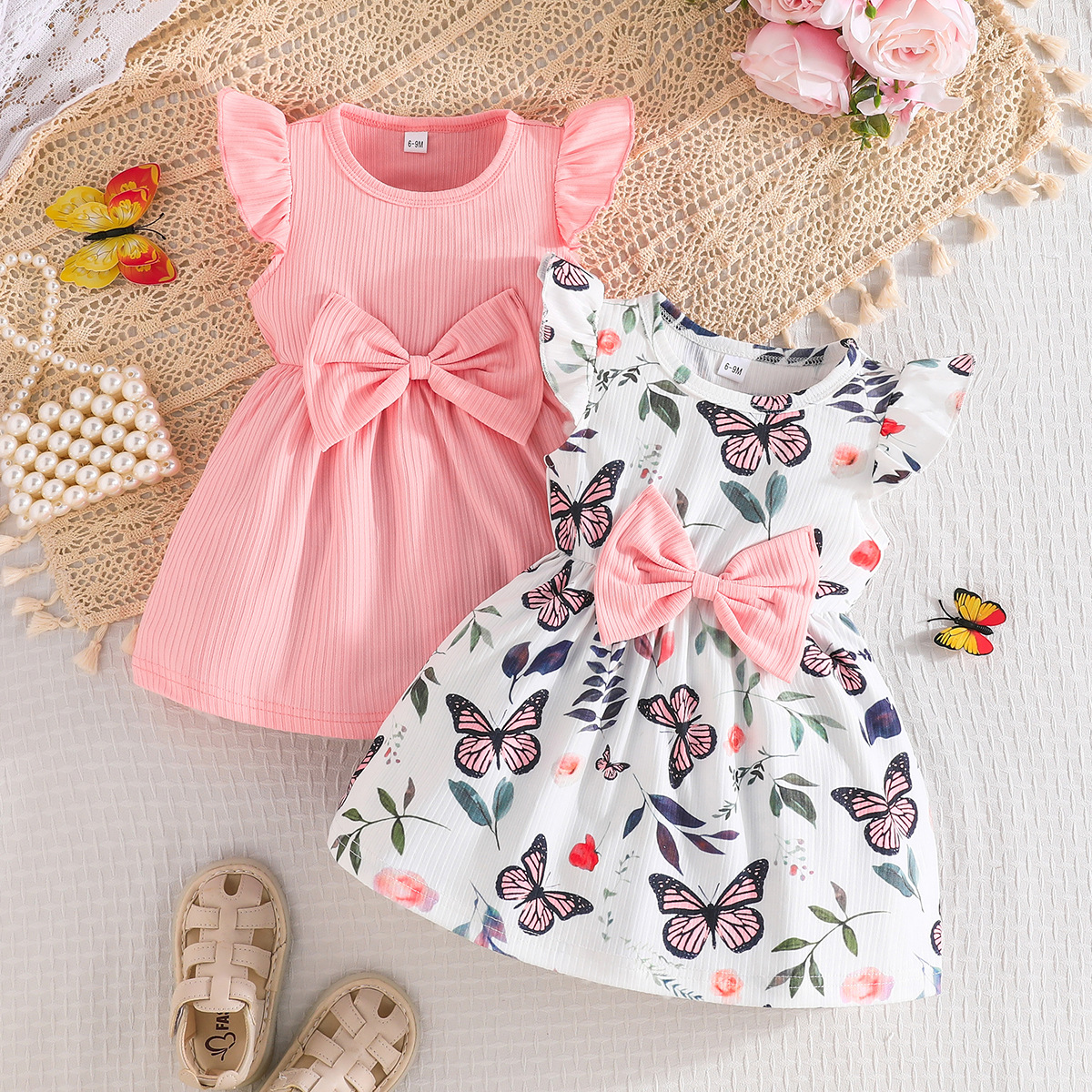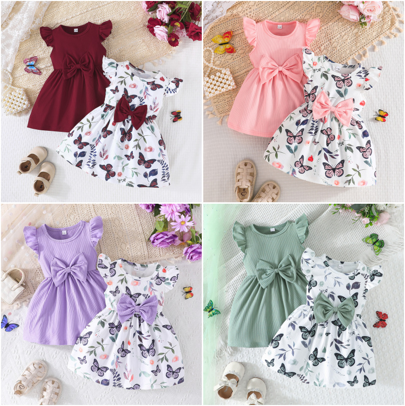 국경 2025 귀여운 아기 소녀 여름 새로운 나비 패턴 원피스 단색 원피스 2 조각 조합