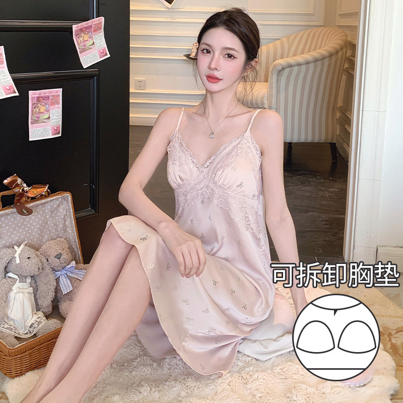 • 단조 실크 잠옷 - 핑크 리본 스타일