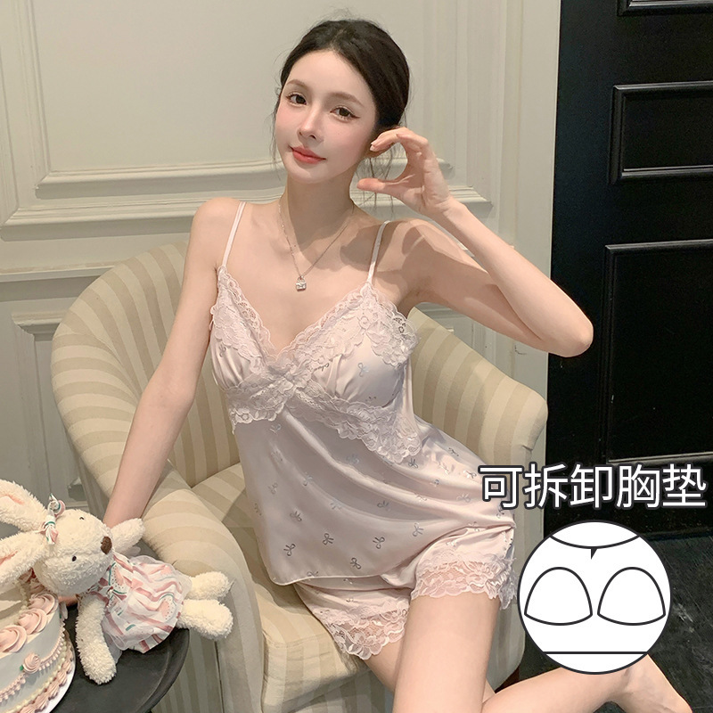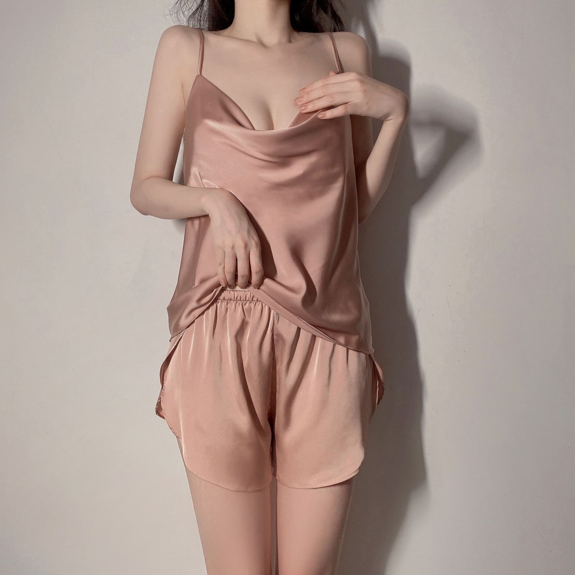 섹시한 플러스 사이즈 잠옷 여자 가슴 패드 여름 아이스 실크 카미솔 반바지 투피스 느슨한 홈 의류 세트스토어 가기