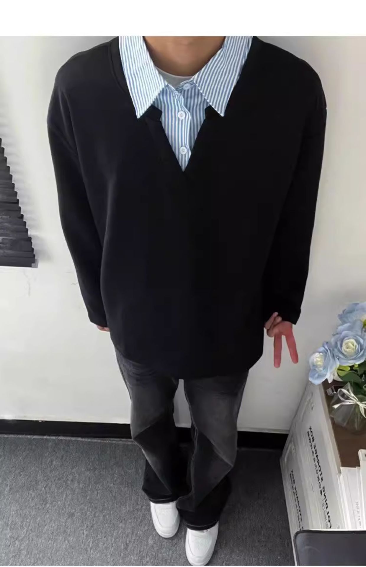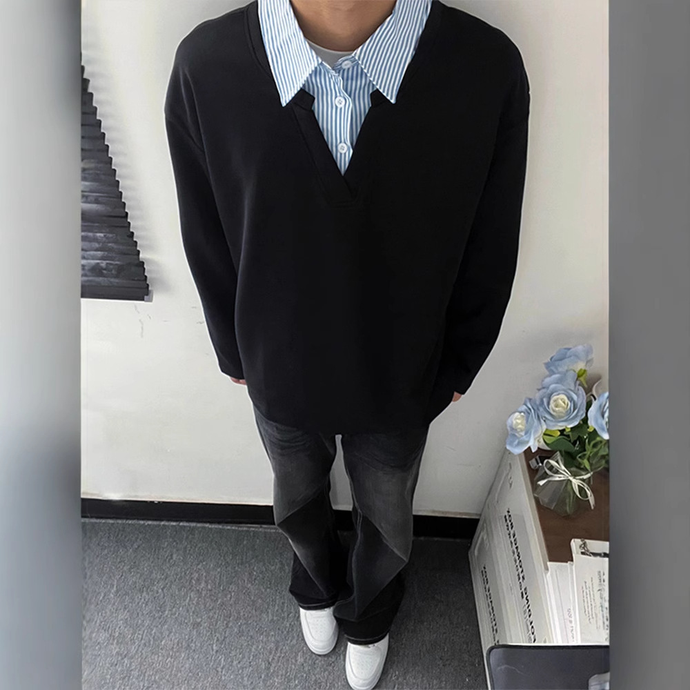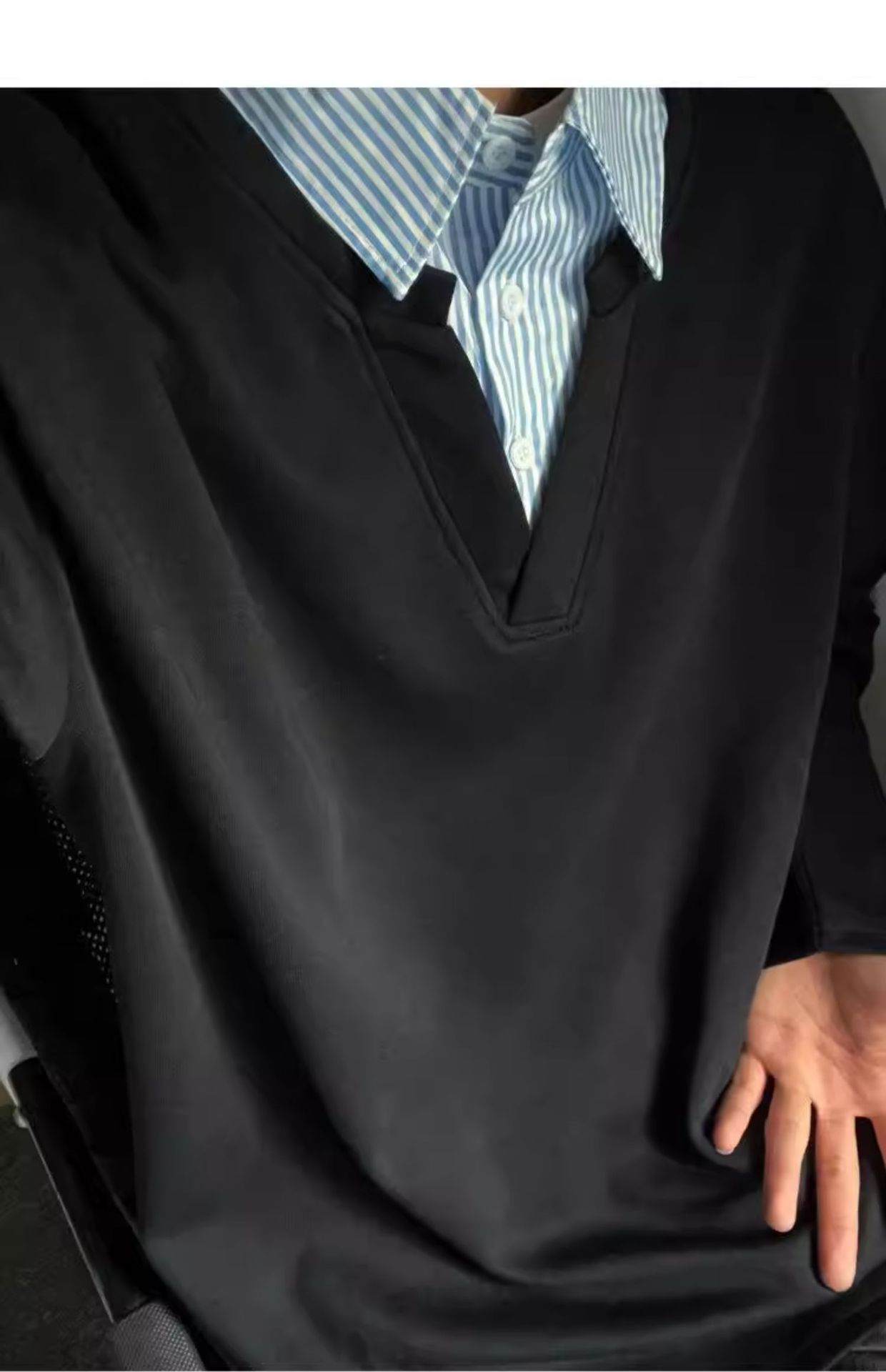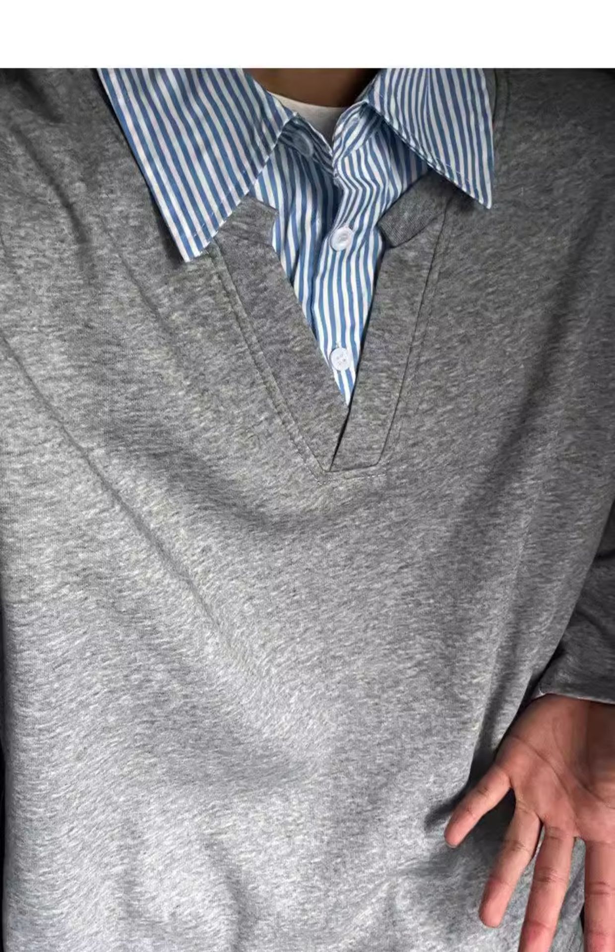 가짜 투피스 셔츠 칼라 스웨트 셔츠 남성 봄과 가을 트렌디 브랜드 틈새 디자인 센스 아메리칸 스트라이프 스티칭 헤비 긴팔 티셔츠