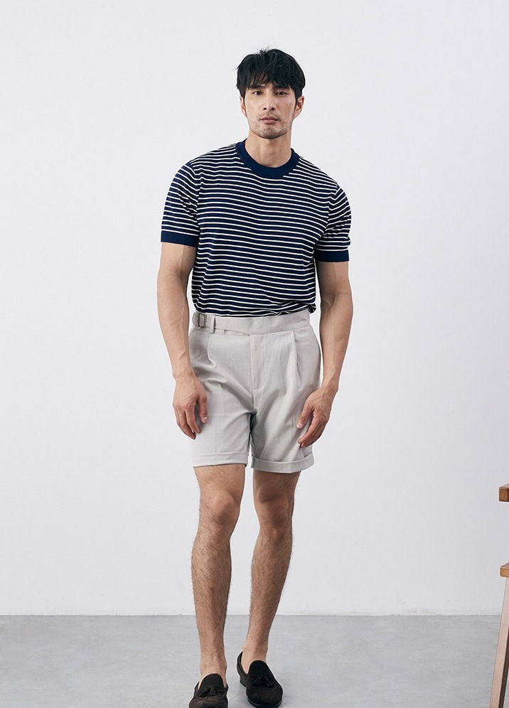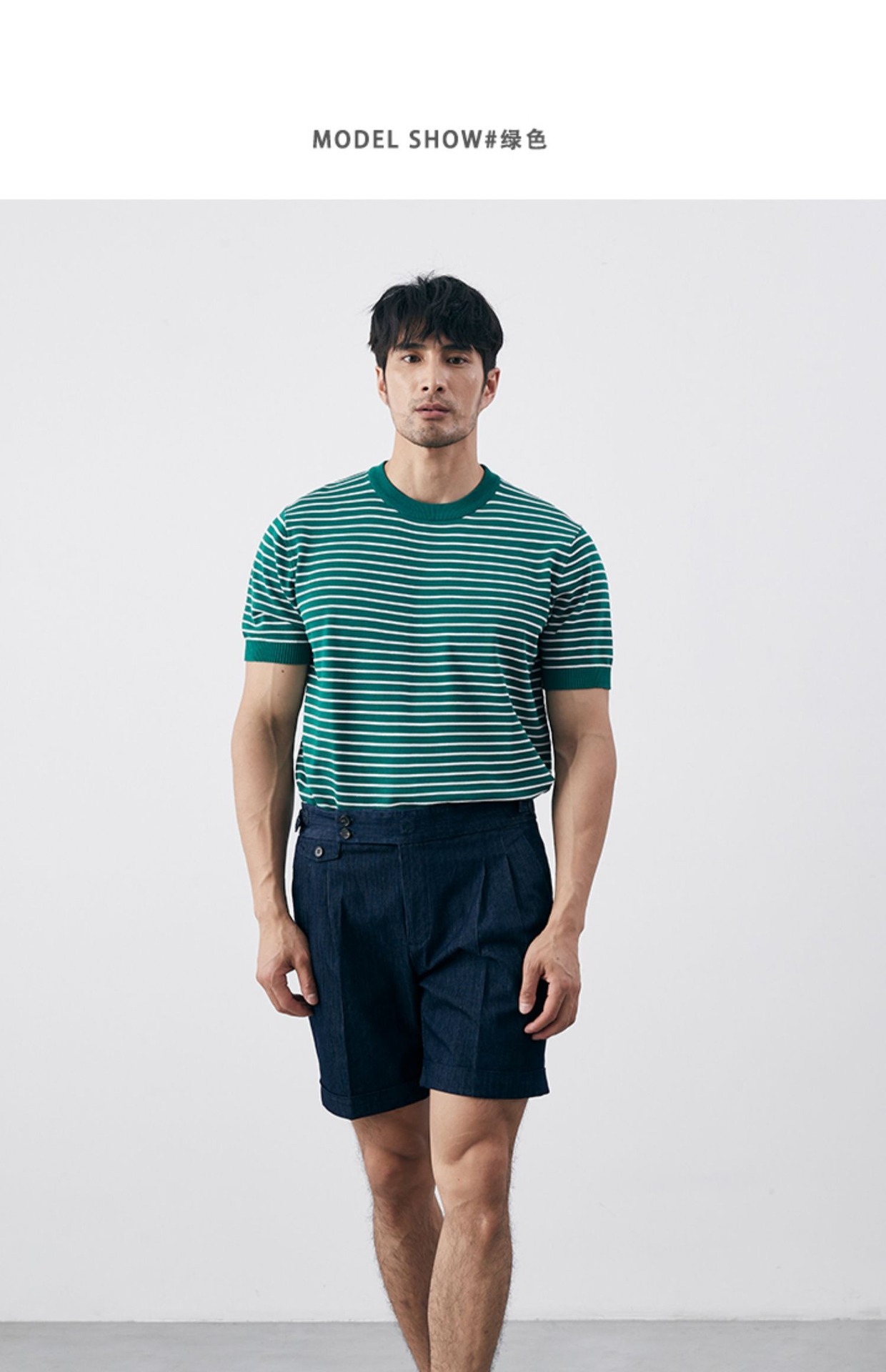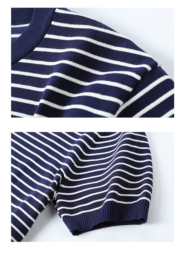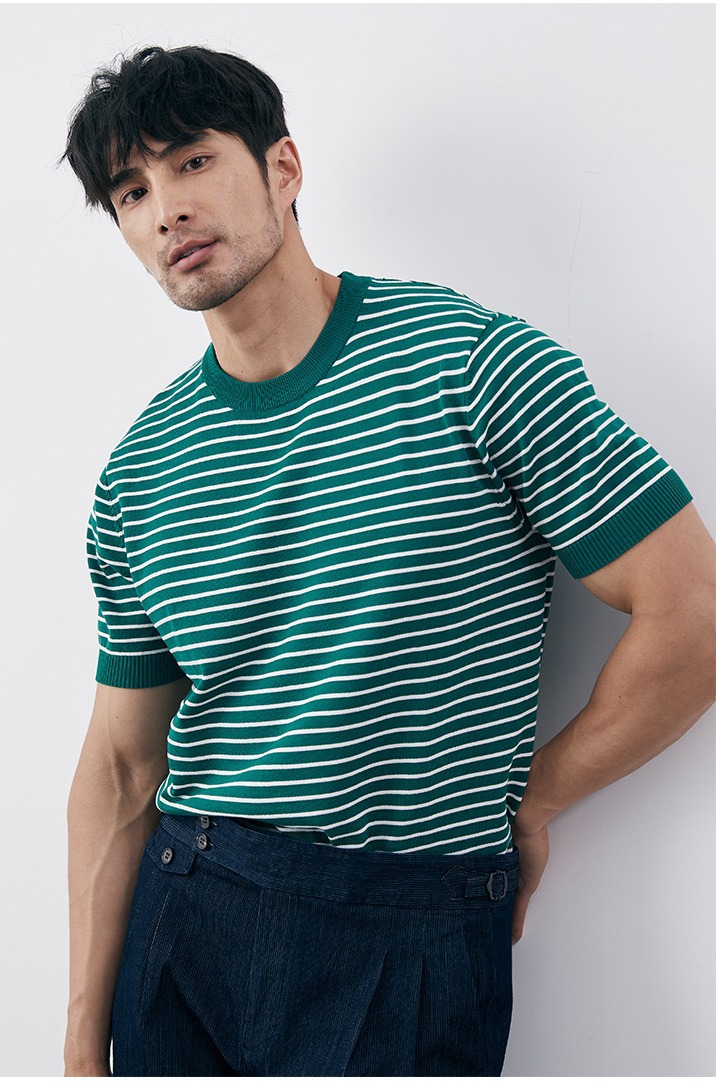 여름 남성 감각 캐주얼 스트라이프 크루 넥 니트 티셔츠 비 다림질 슬림 핏 그린 반팔 트렌디 크로스 테두리 도매스토어 가기