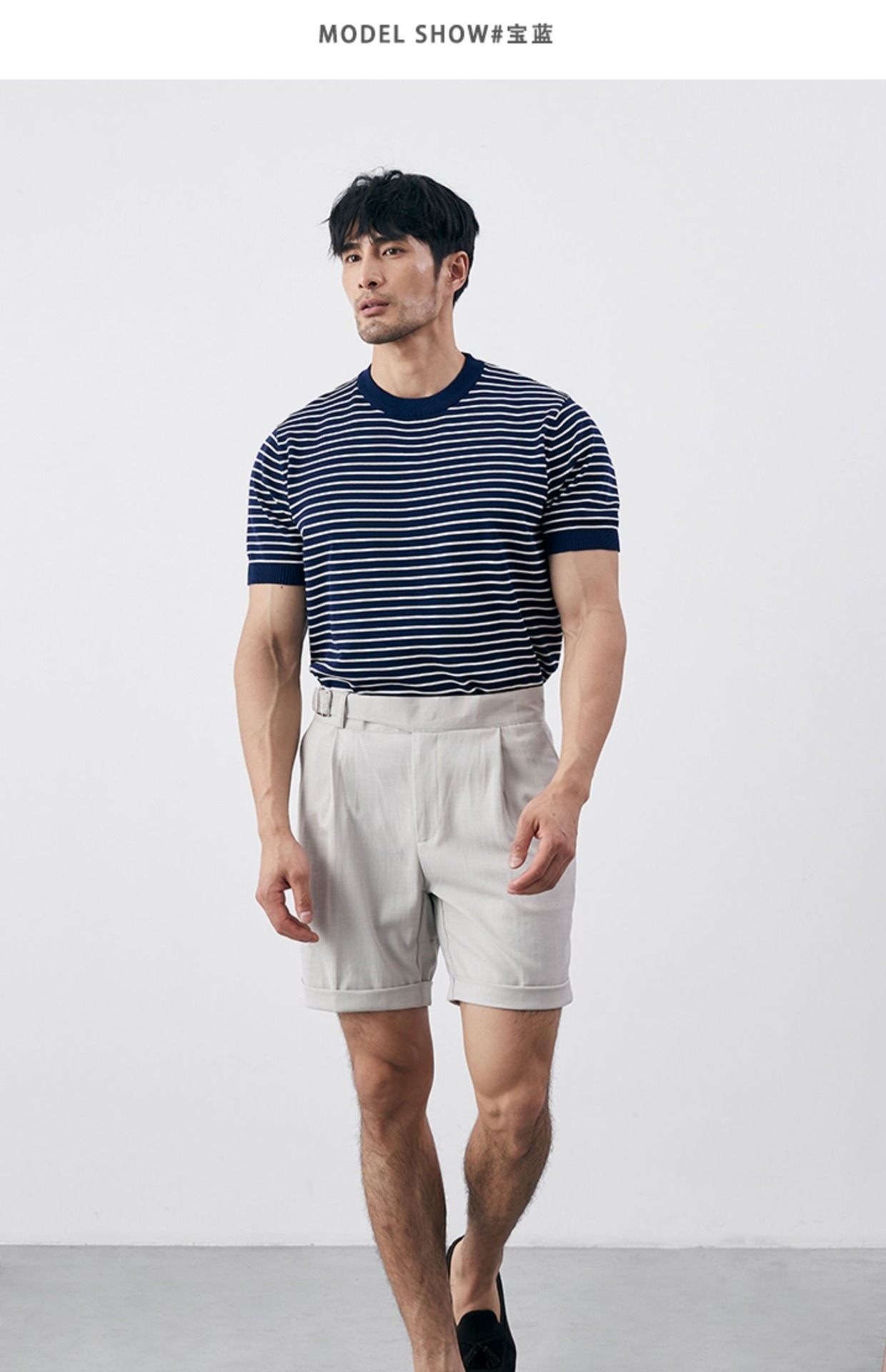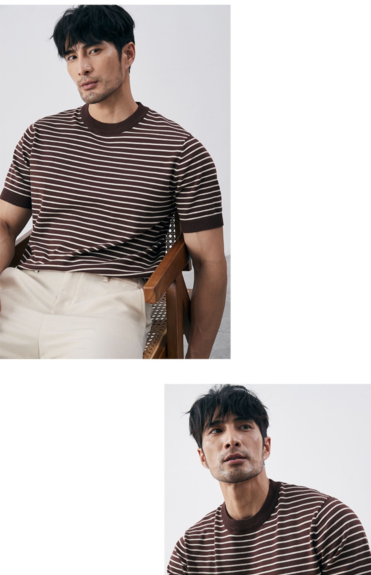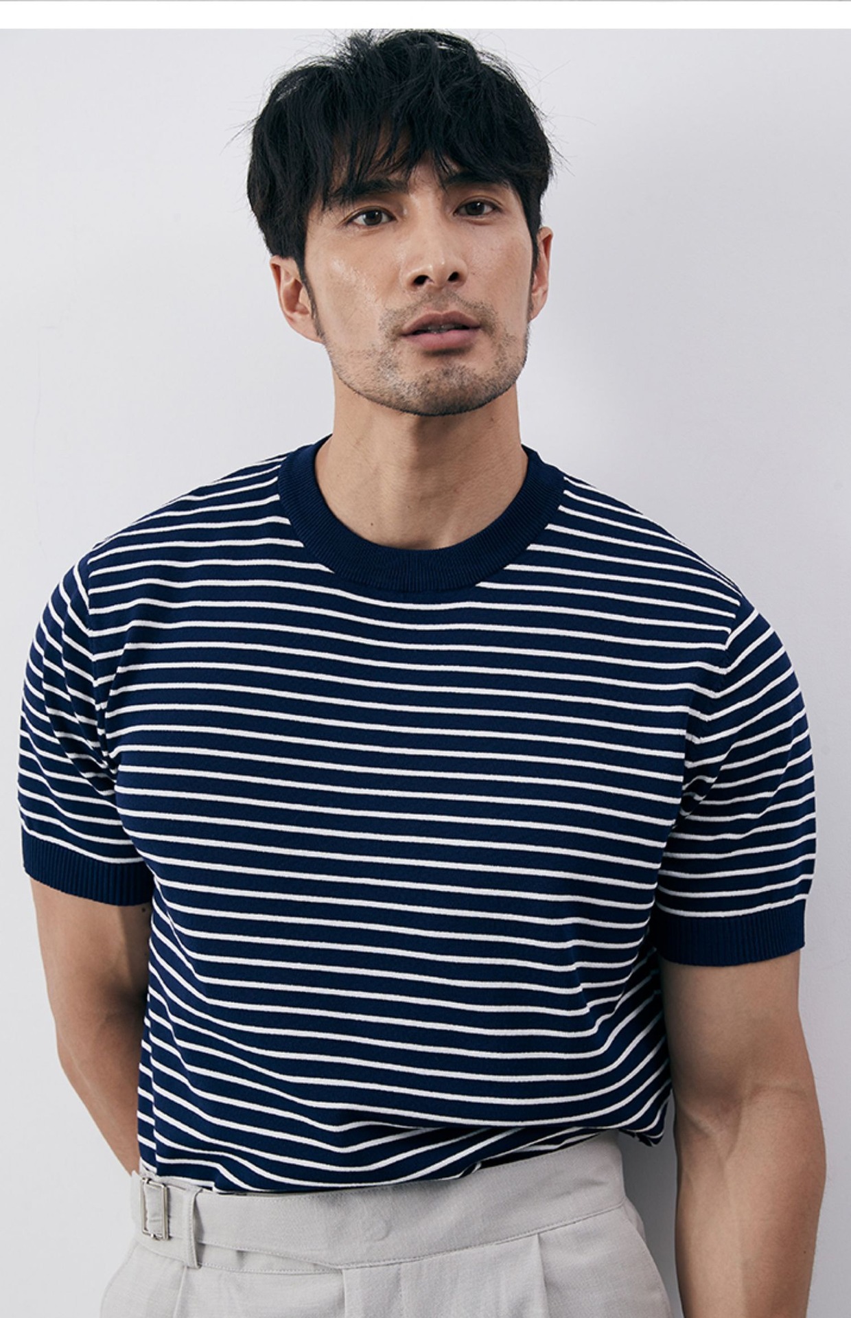 여름 남성 감각 캐주얼 스트라이프 크루 넥 니트 티셔츠 비 다림질 슬림 핏 그린 반팔 트렌디 크로스 테두리 도매스토어 가기