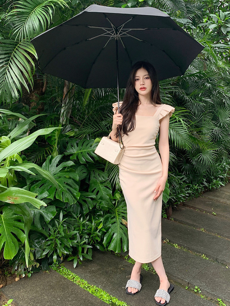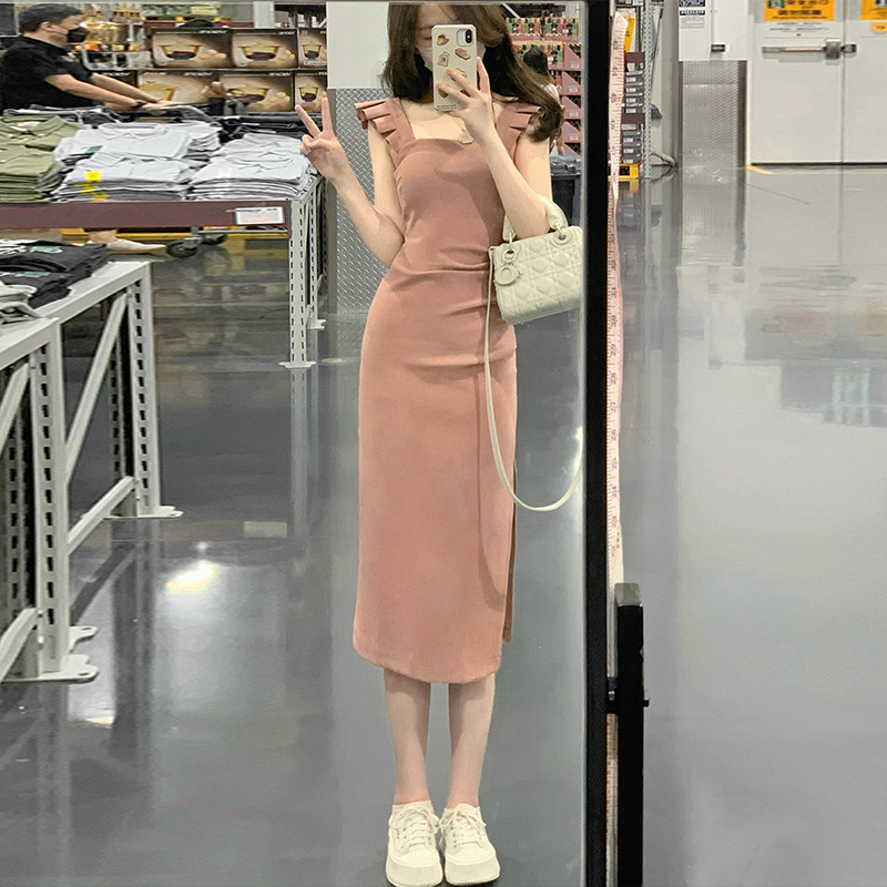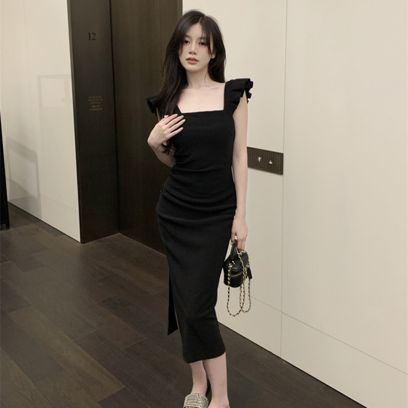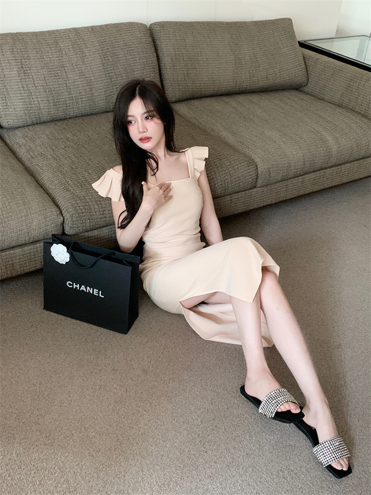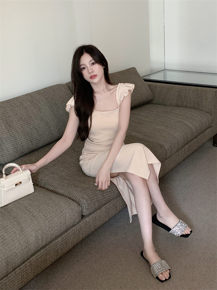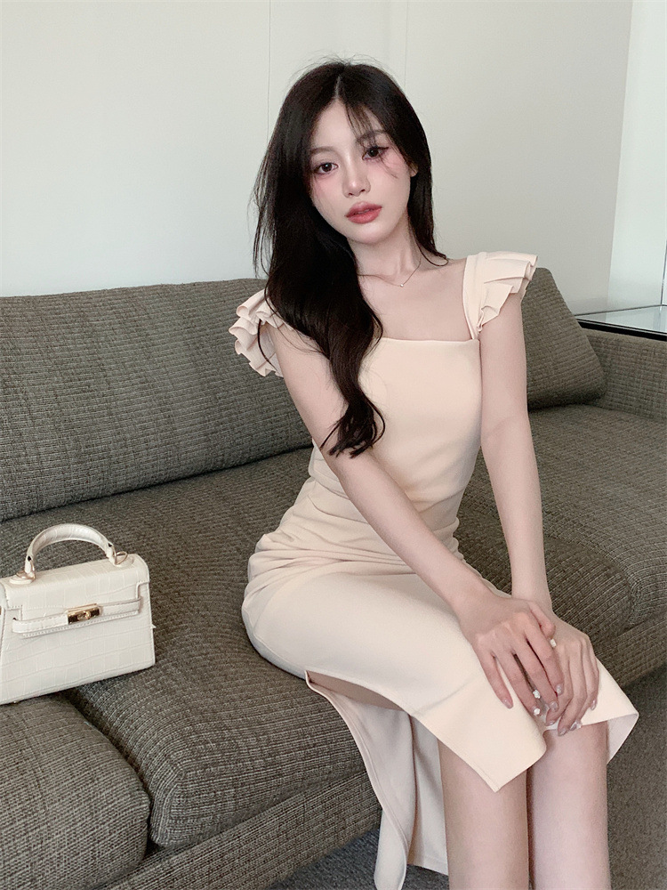 프랑스 스타일 작은 비행 소매 분할 치마 여름 새로운 순수한 욕망 스타일 슬리밍 엉덩이 원피스 원피스 여성 원피스