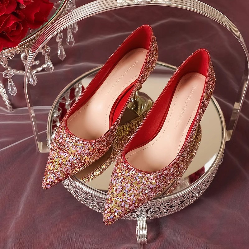 우아한 빨간 결혼식 신발 신부 신발 Xiuhe 웨딩 원피스 새로운 스틸레토 힐 프랑스 웨딩 신발 하이힐 신부 들러리 신발 싱글 신발스토어 가기