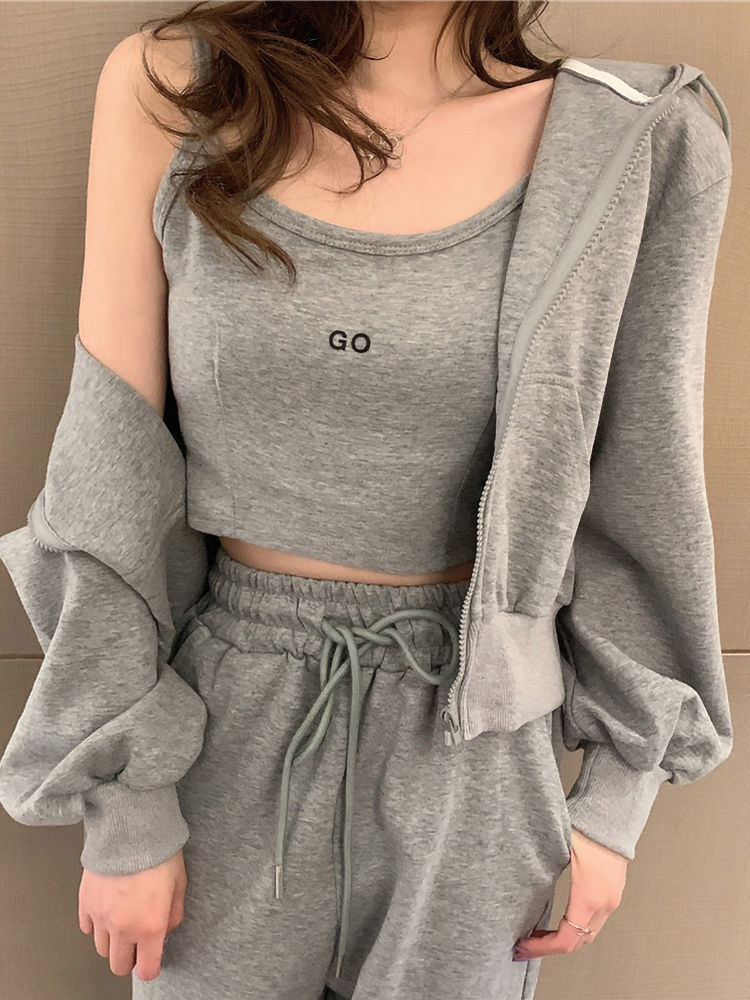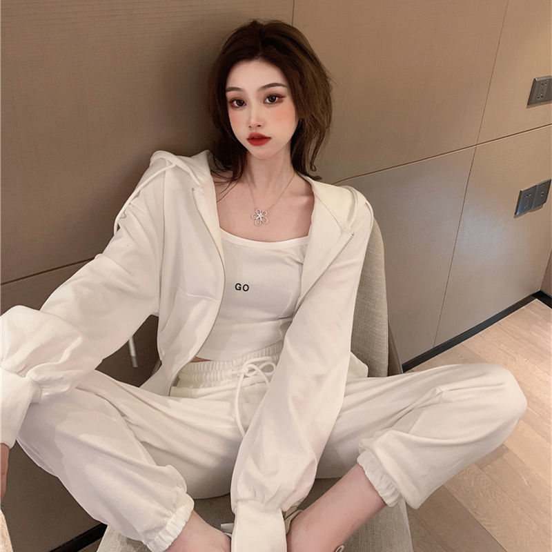 초가을 캐주얼 스포츠웨어 세트 여성의 봄과 가을 2024 유행 연령 감소 프라이드 스트리트 피트니스 발 바지 3 피스 세트