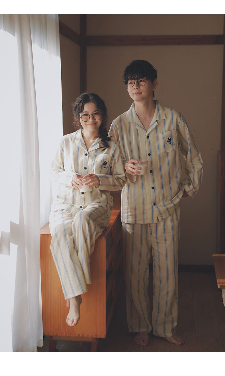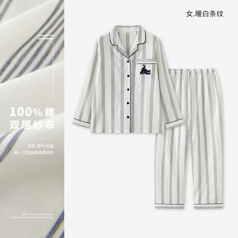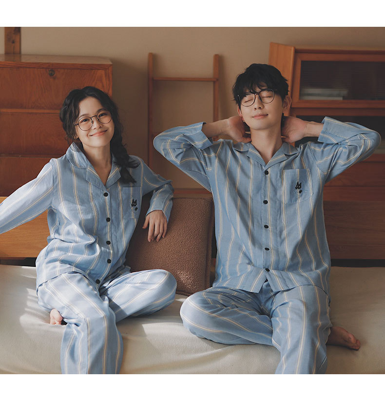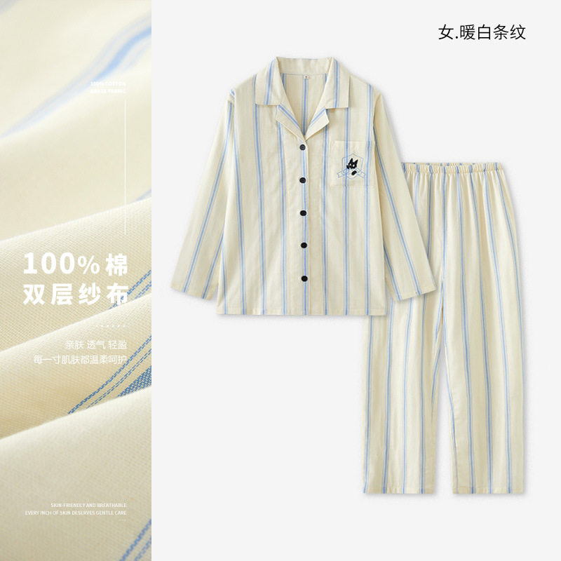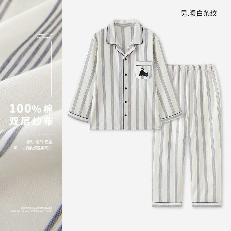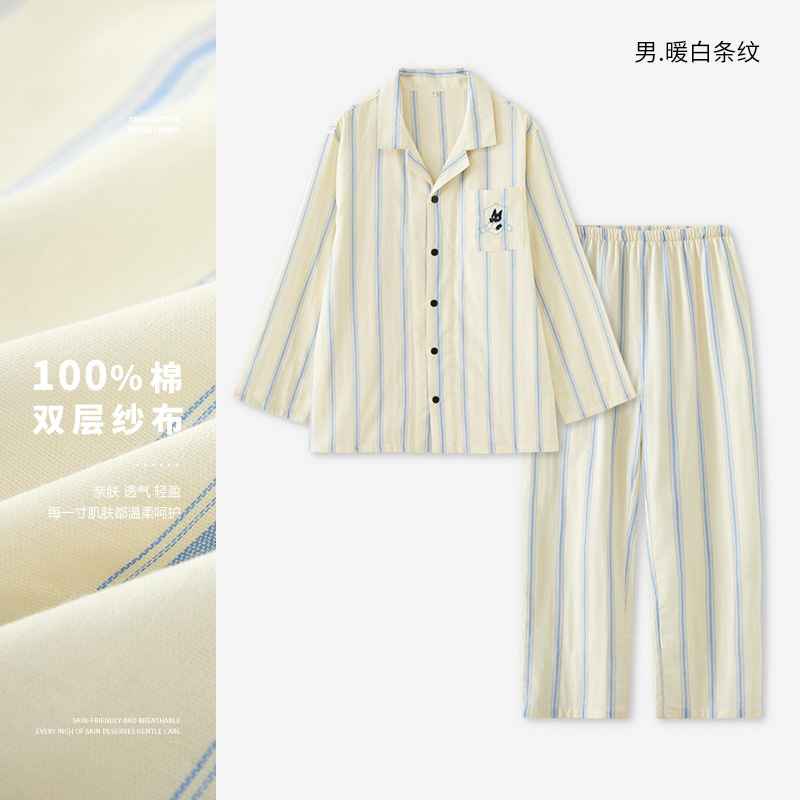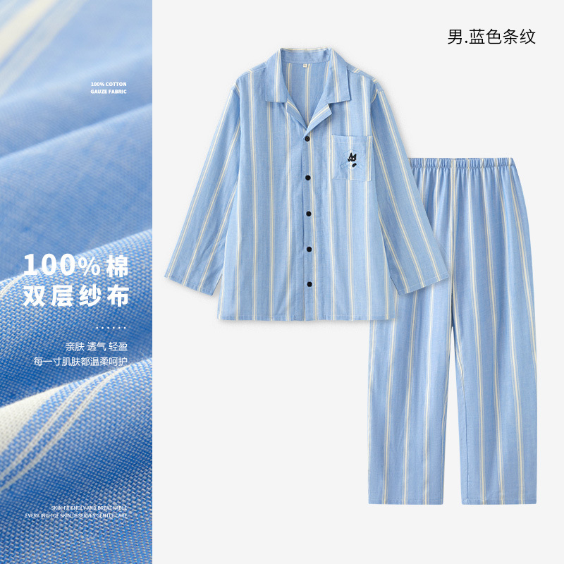 맑고 편안한 커플 잠옷 남성용 봄 가을 긴팔 세트 여성용 순면 거즈 홈웨어 여름스토어 가기