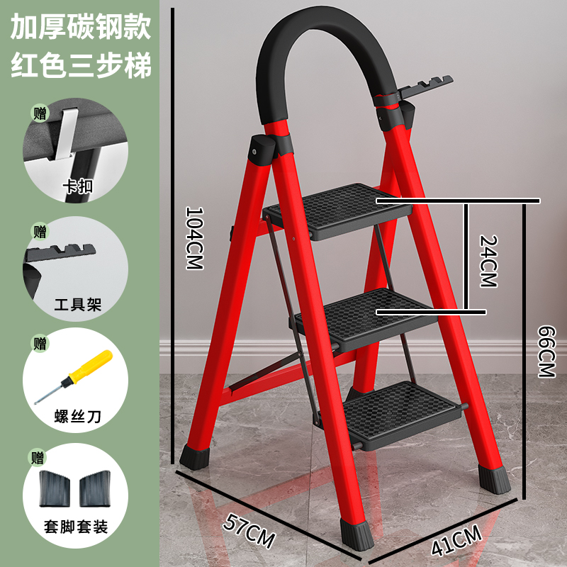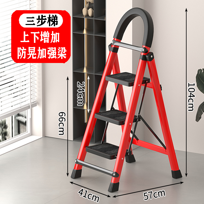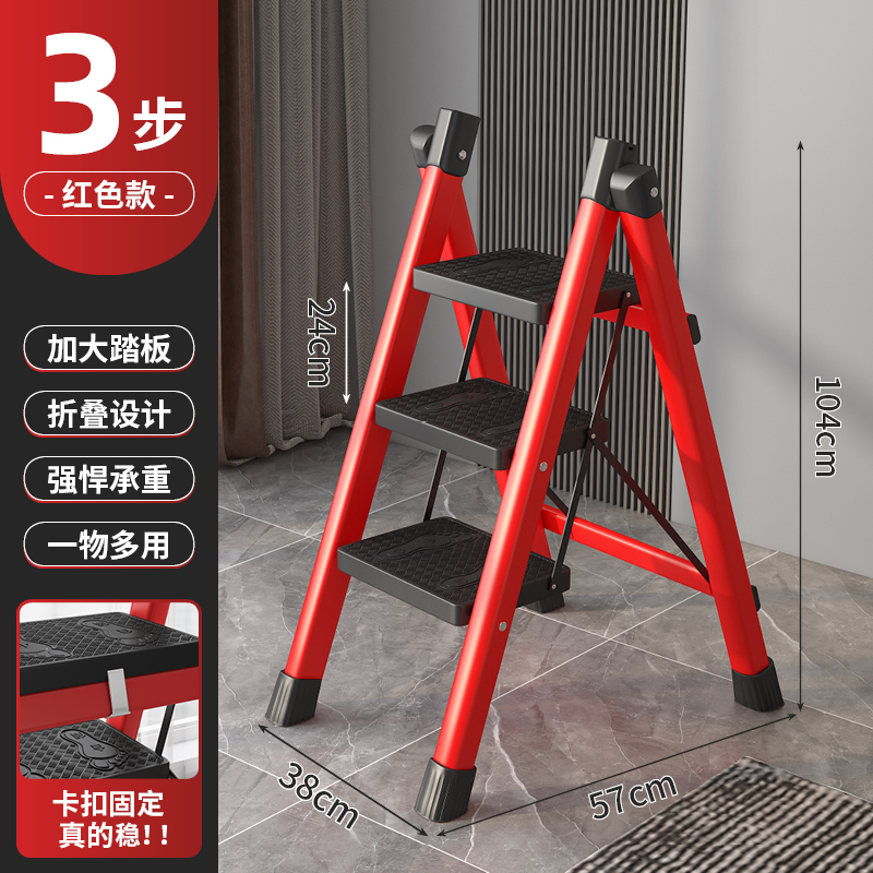 • [53% 선택] 두꺼운 빨간색 3단 사다리 [강화 리브 버클 페달 + 풀 페달 이중 강화 흔들림 방지 빔] - 단면 사다리