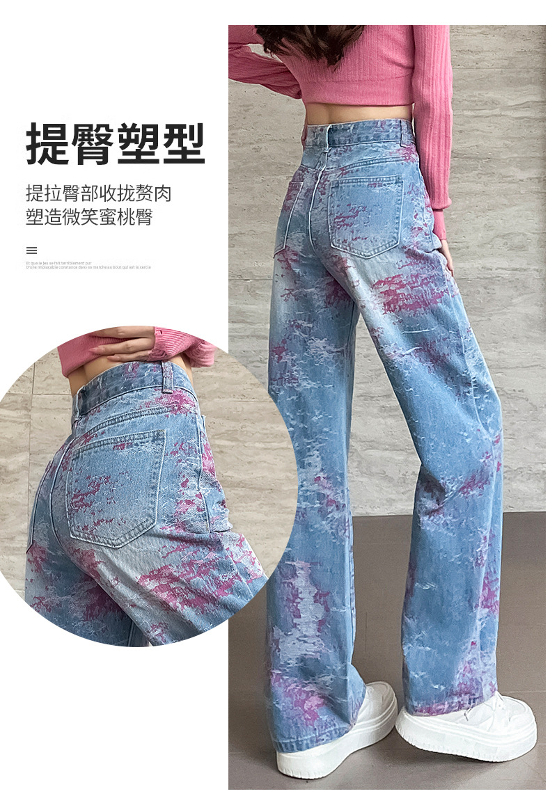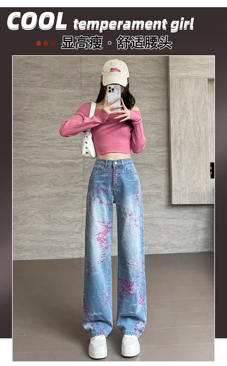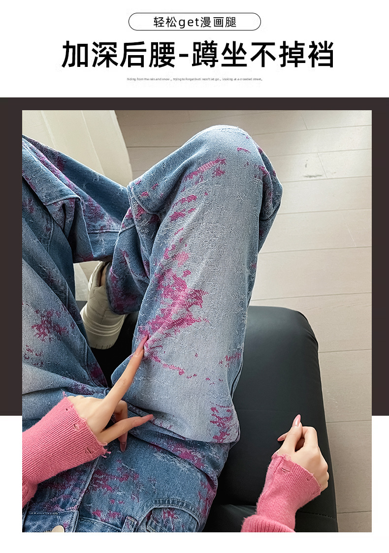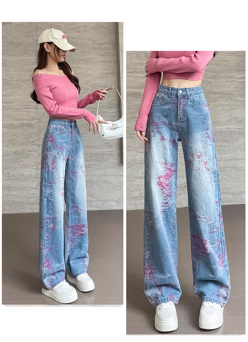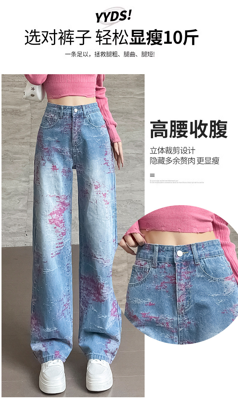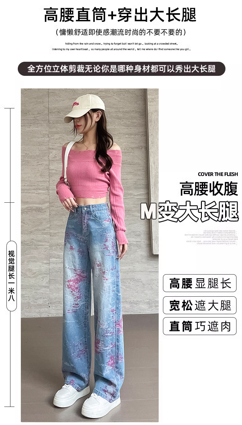 봄 0128 2025 스트레이트 다리 넓은 다리 청바지 핑크 보라색 대비 높은 허리 살로 느슨한 데님 여성 바지스토어 가기