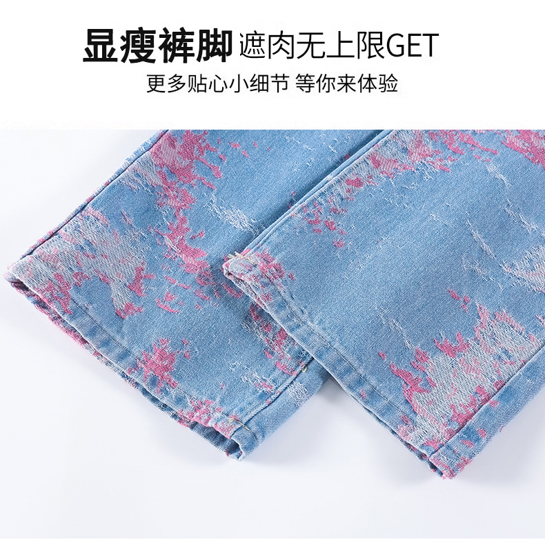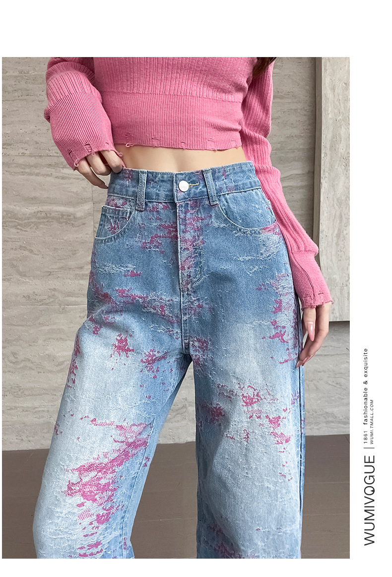 봄 0128 2025 스트레이트 다리 넓은 다리 청바지 핑크 보라색 대비 높은 허리 살로 느슨한 데님 여성 바지