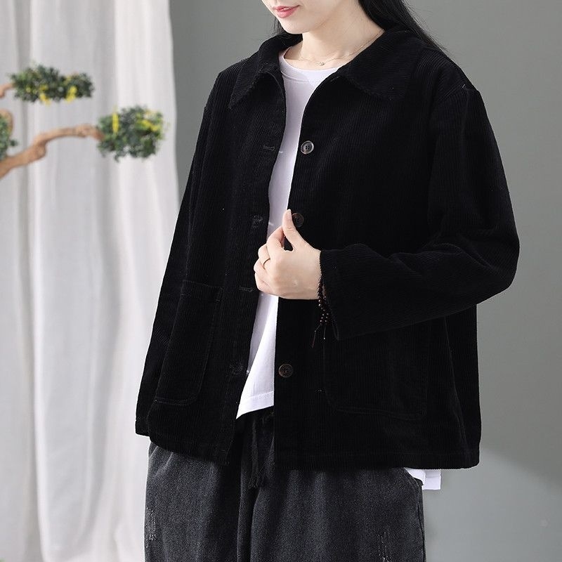 빈티지 옷깃 코듀로이 코트 여성 예술적 느슨한 올 매치 쇼트 재킷 봄과 가을 긴팔 벨벳 카디건 탑