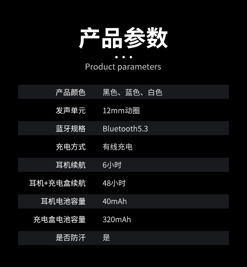 耳机*2、充电仓*1、充电线*1、说明书*1 、包装盒*1