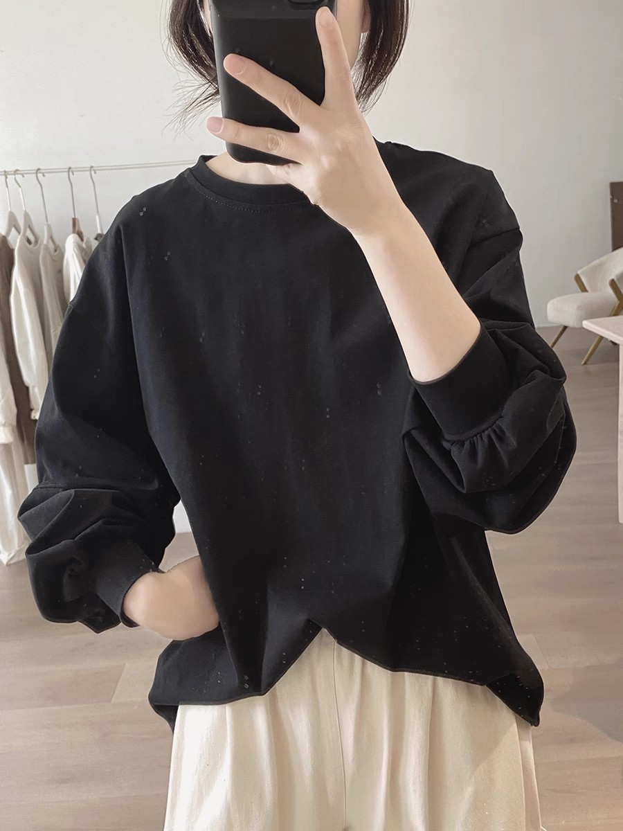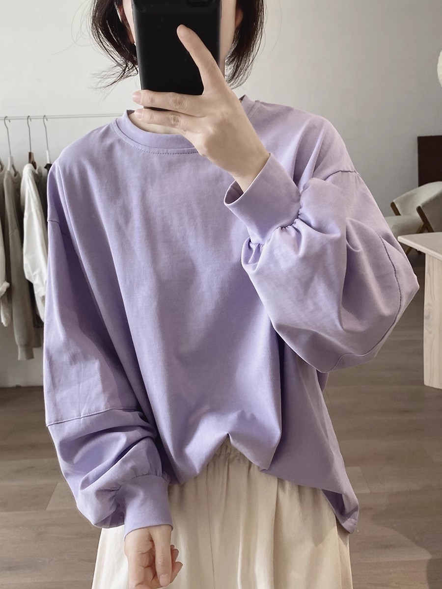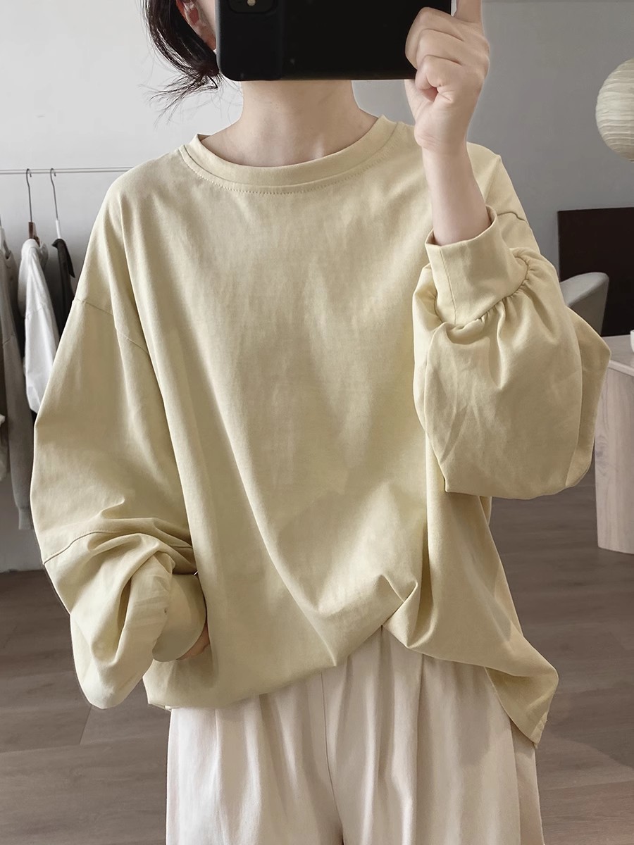 랜턴 슬리브 티셔츠 여성용 봄과 가을 새로운 느슨한 플러스 사이즈 슬리밍 한국 간단한 틈새 디자인 센스 솔리드 컬러 탑스토어 가기
