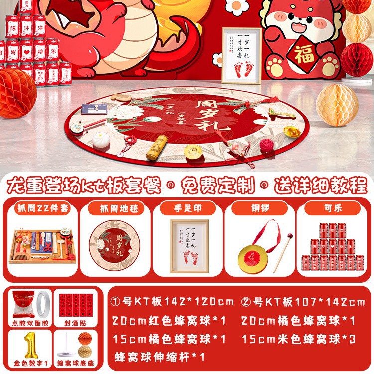 • 드래곤 리디언 kt 보드 패키지 + 표준 주간 캐치 18개 + 중국 스타일 1세 선물 카펫 + 1세 선물 손 및 발자국 + 황금 숫자 풍선 1개 + 1세 코카콜라 15캔