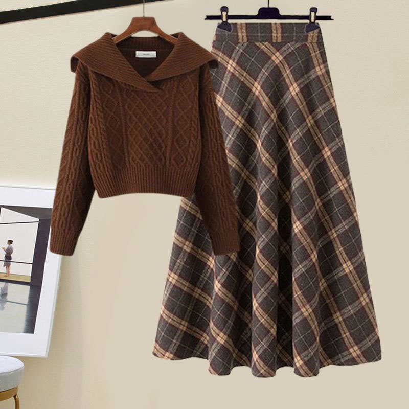 여성을 위한 가을 겨울 의상 세트 2024 새로운 스타일 라펠 니트 스웨터 기질 체크 무늬 스커트 투피스 슈트
