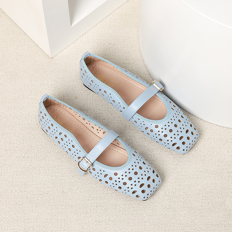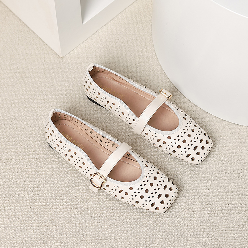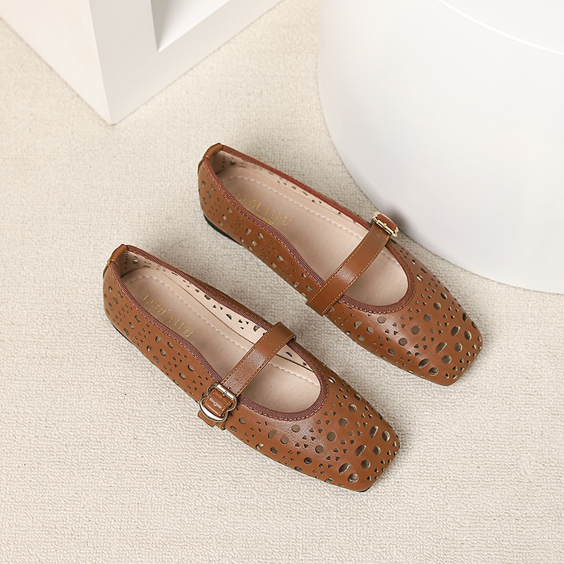 국경 간 봄과 여름 새로운 발레 중공 캐주얼 가죽 신발 여성 광장 머리 얕은 입 편안한 복고풍 스타일 싱글 레이어 신발 AliExpress