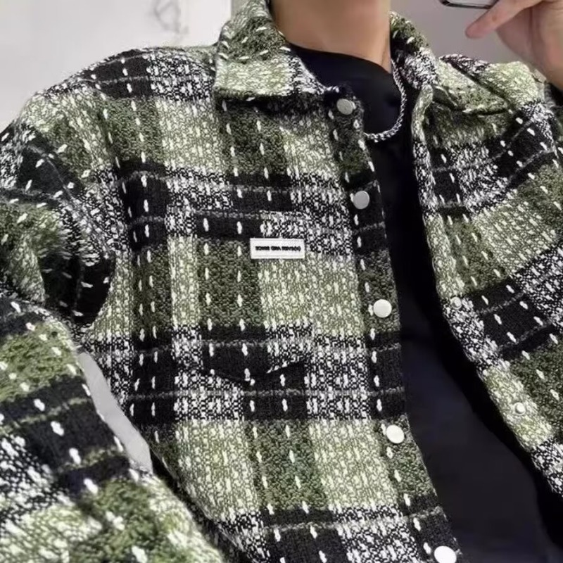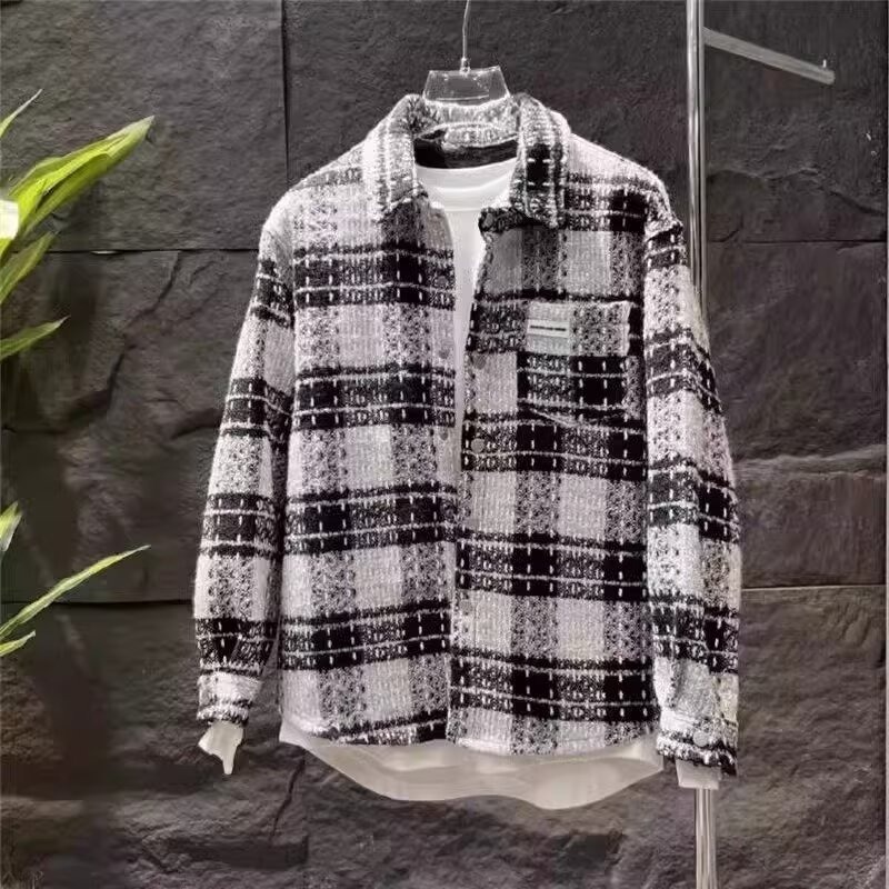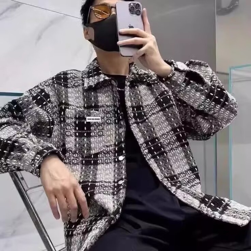 샤넬 스타일 격자 자켓 남성용 가을 빈티지 옷깃 긴팔 셔츠 커플의 트렌디 한 브랜드 올 매치 루즈 재킷