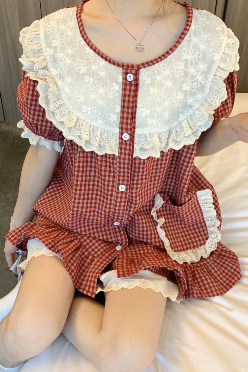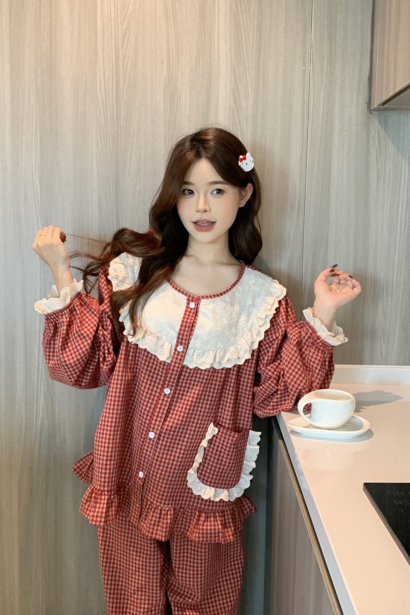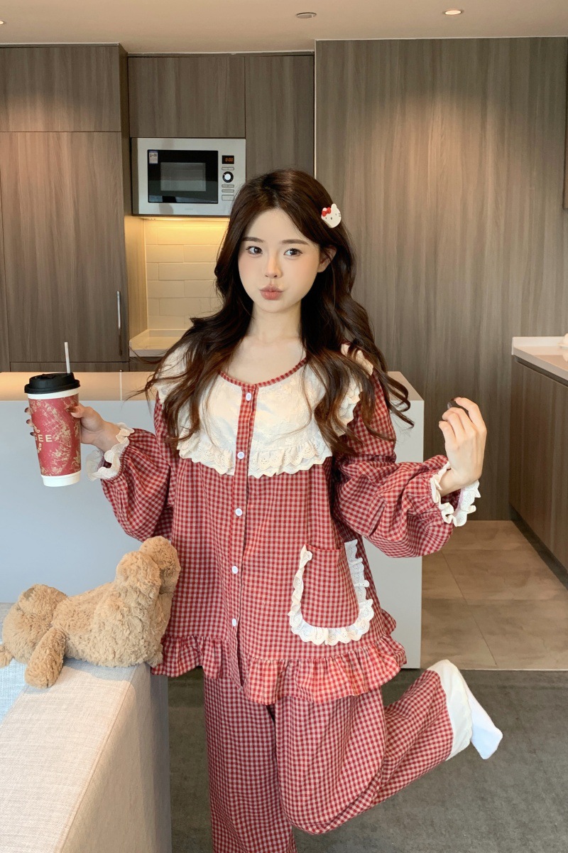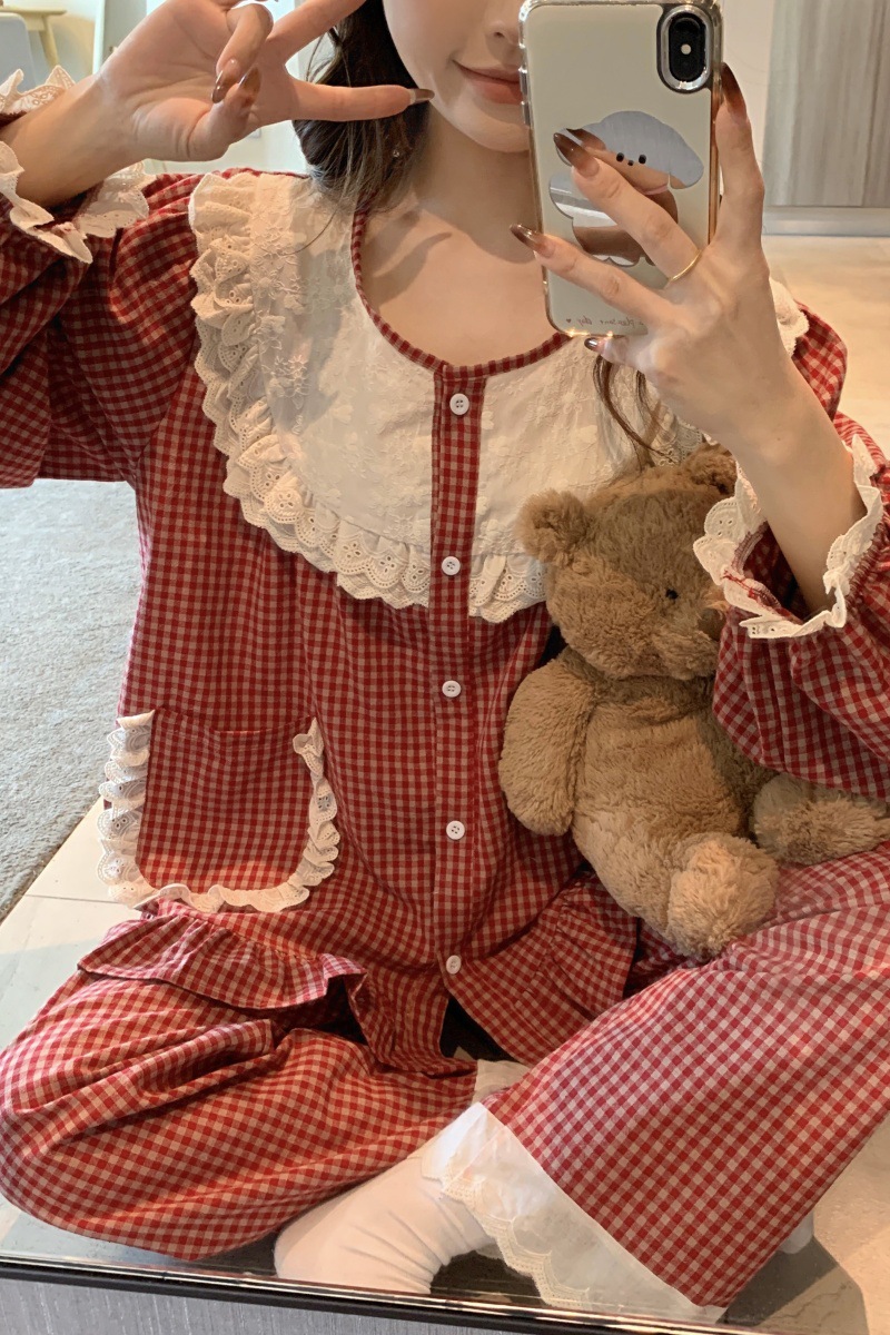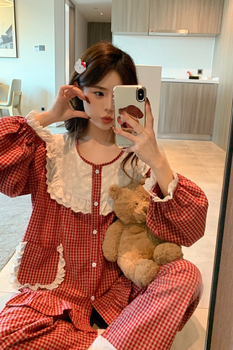 국경 전용 여성 한국식 달콤한 공주 스타일 작은 붉은 격자 대비 자수 중공업 레이스 긴 소매 홈 의류 세트