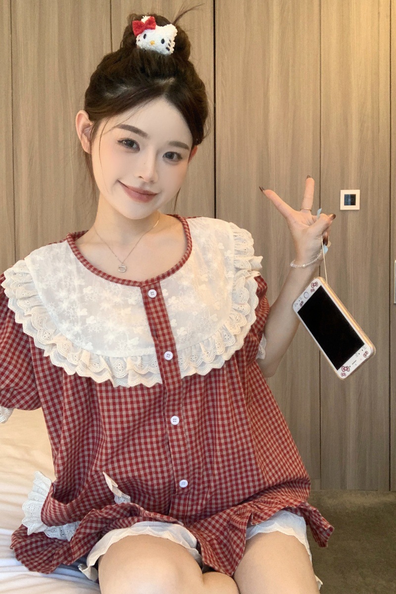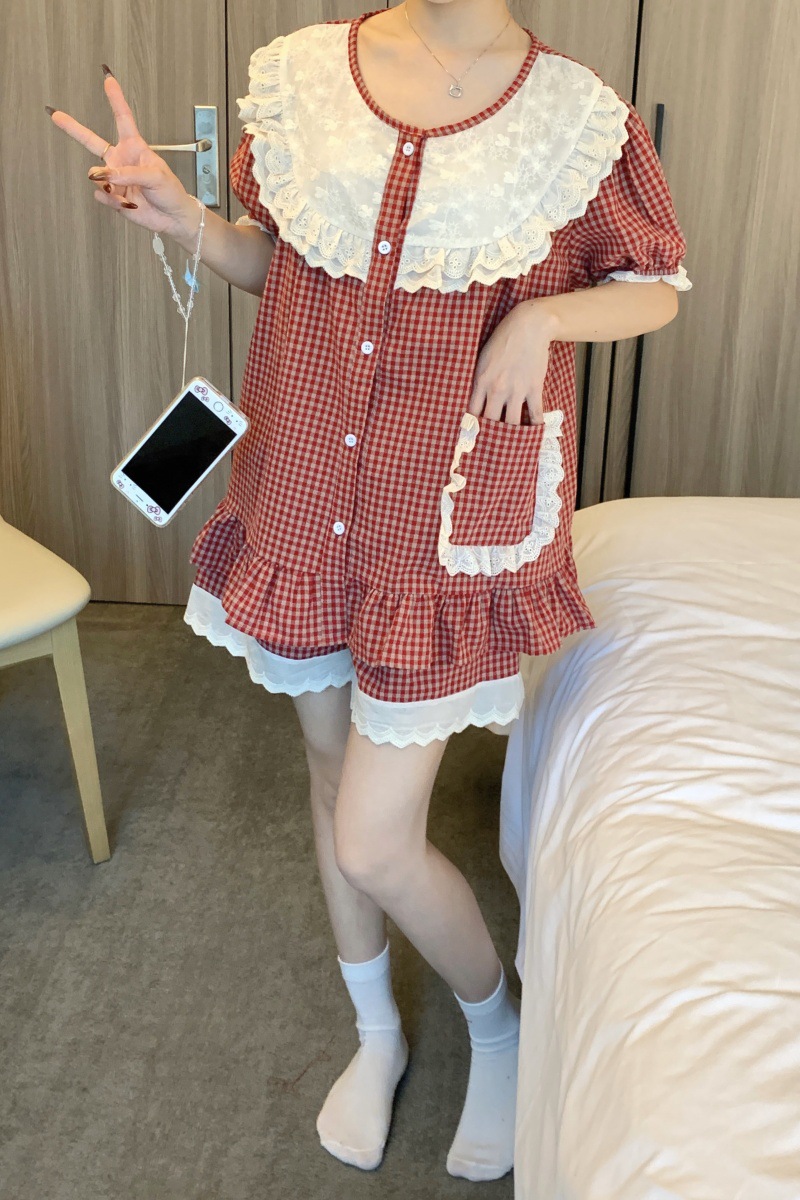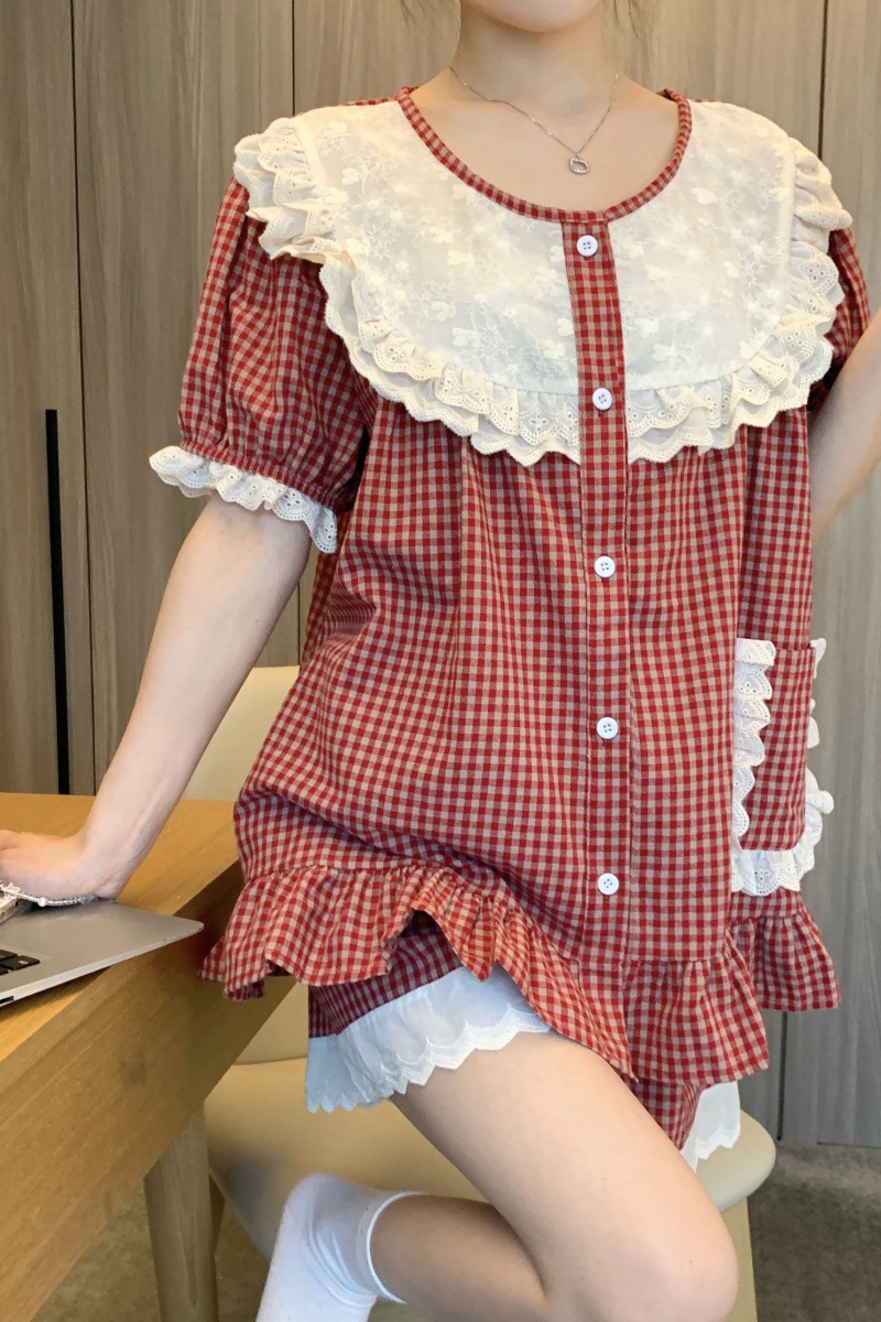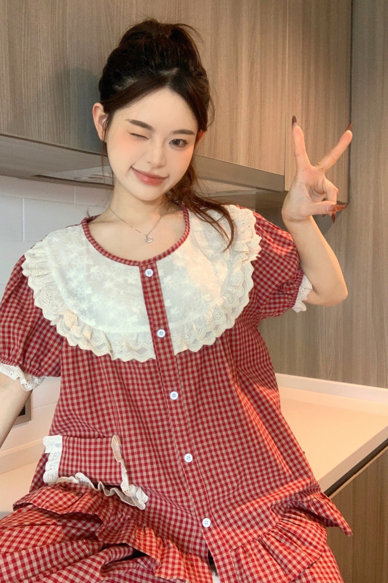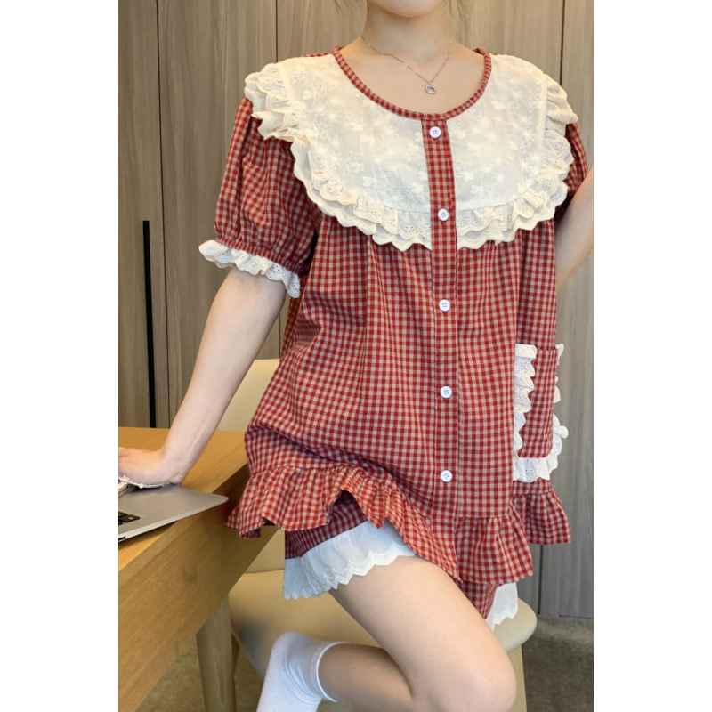 국경 전용 여성 한국식 달콤한 공주 스타일 작은 붉은 격자 대비 자수 중공업 레이스 긴 소매 홈 의류 세트