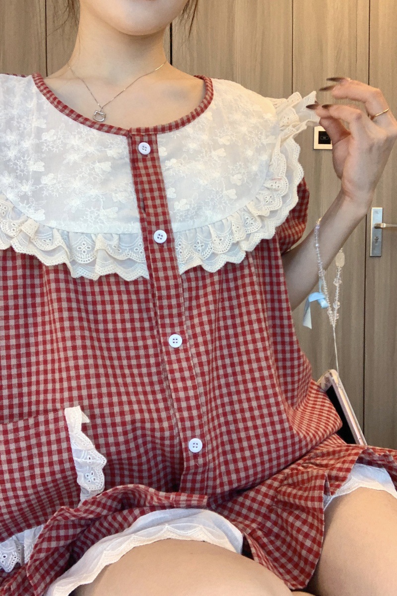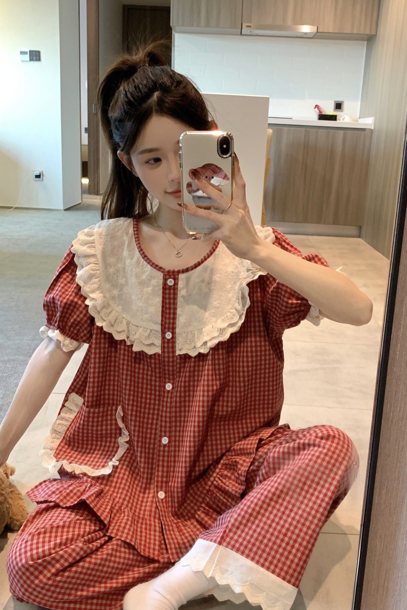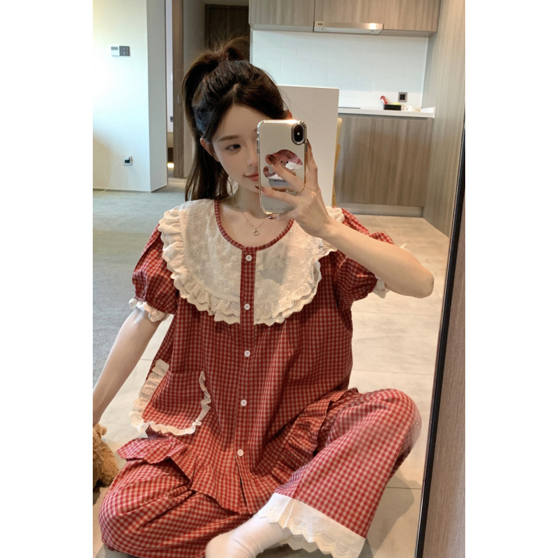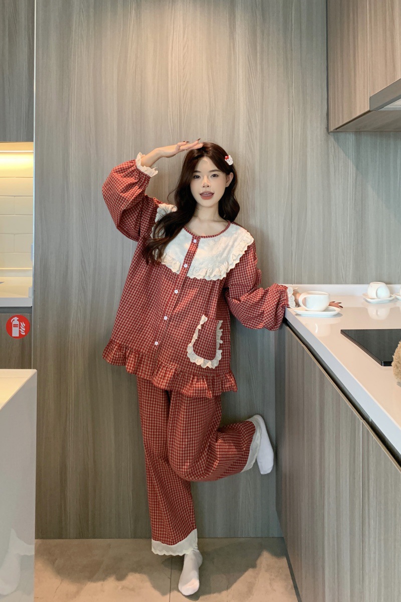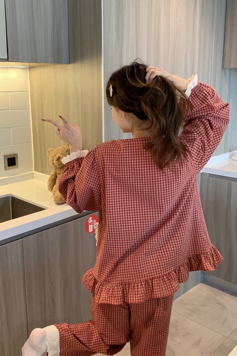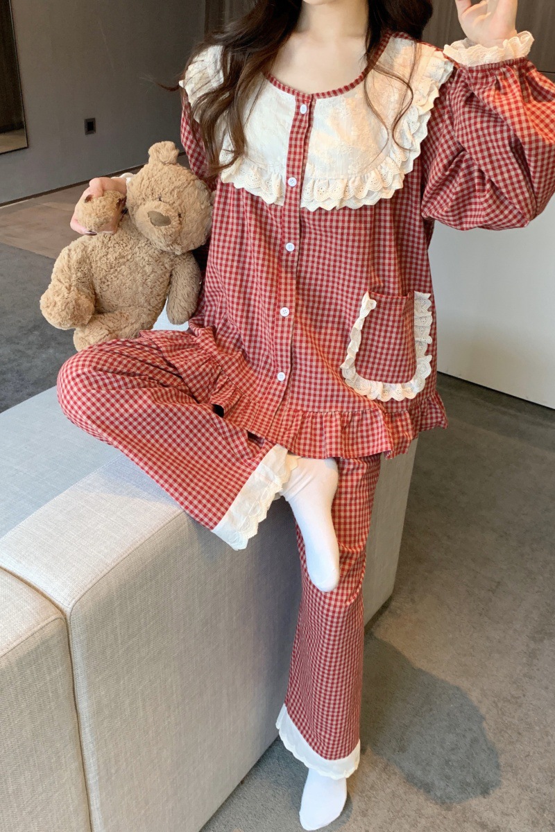 국경 전용 여성 한국식 달콤한 공주 스타일 작은 붉은 격자 대비 자수 중공업 레이스 긴 소매 홈 의류 세트스토어 가기