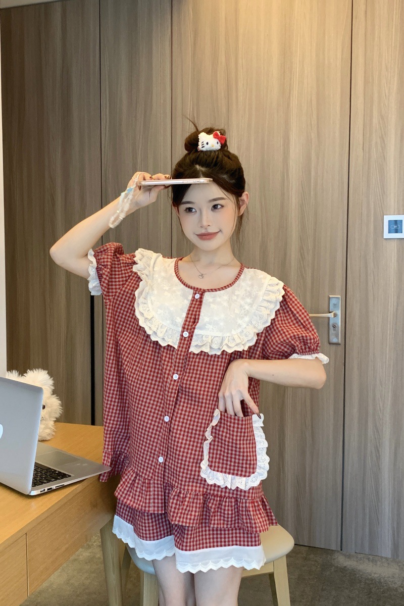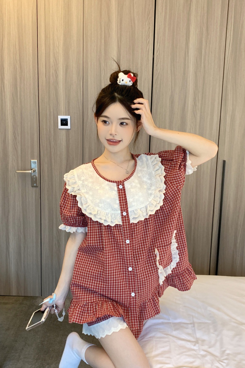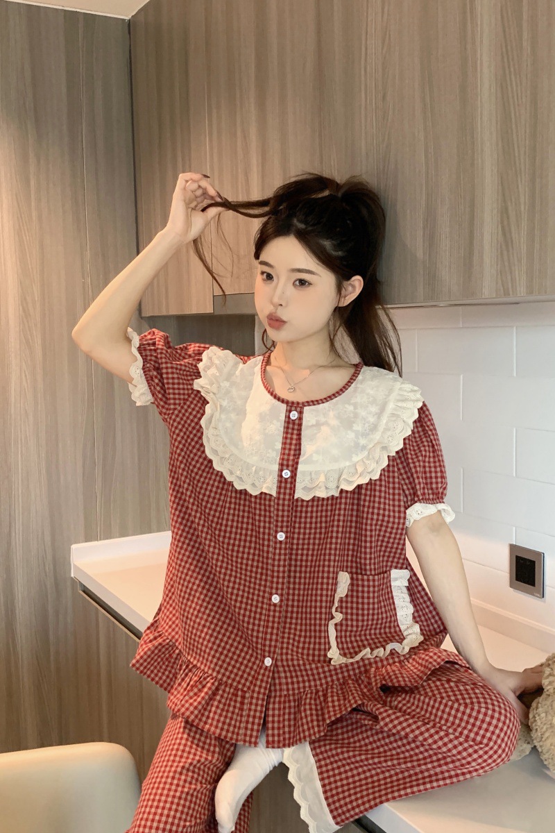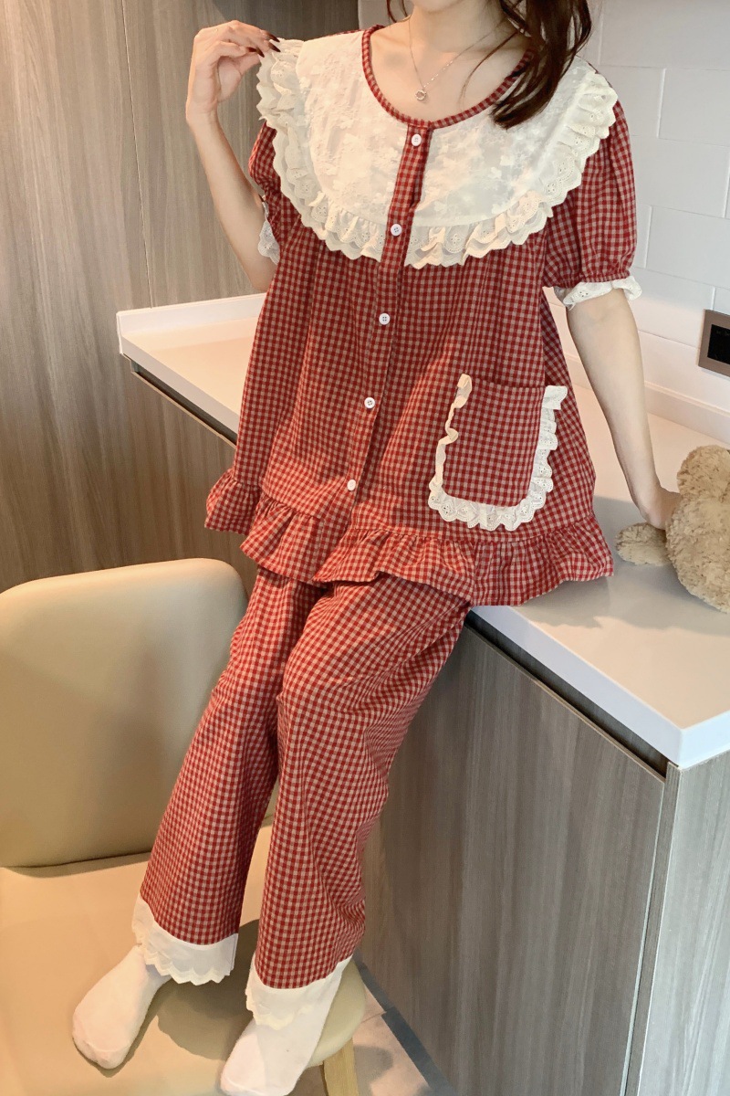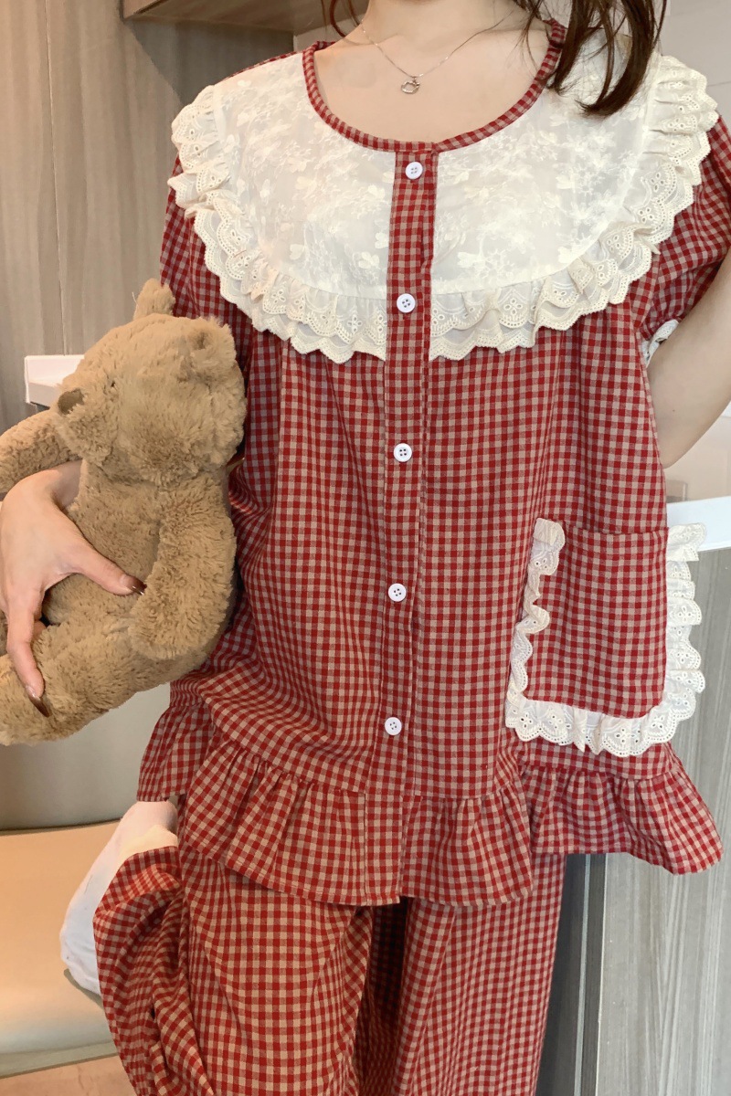 국경 전용 여성 한국식 달콤한 공주 스타일 작은 붉은 격자 대비 자수 중공업 레이스 긴 소매 홈 의류 세트스토어 가기