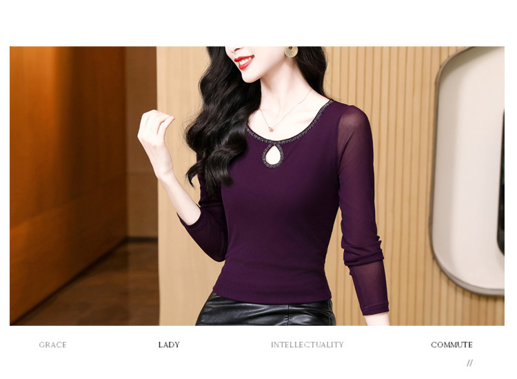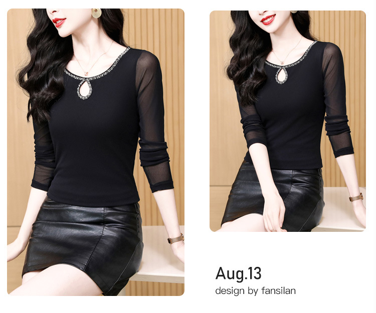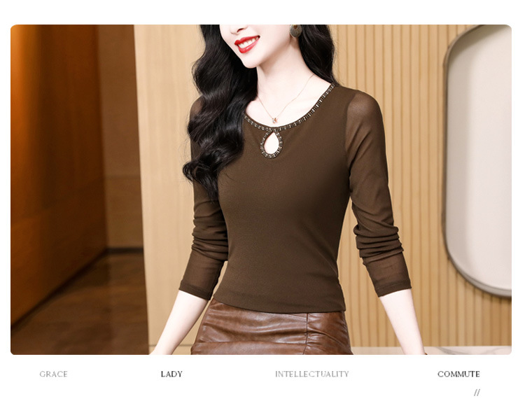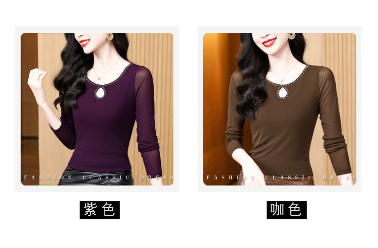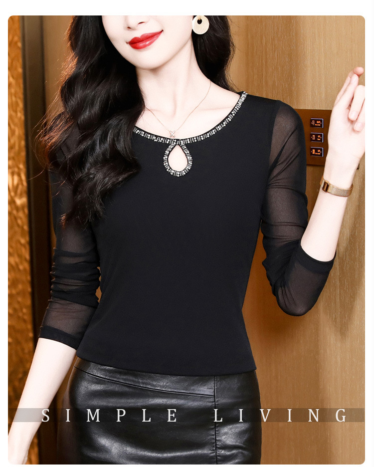 봄 2023 새로운 라운드 넥 올 매치 할로우 구슬 단색 긴 소매 메쉬베이스 셔츠 여성용 슬림 핏 슬리밍 티셔츠스토어 가기