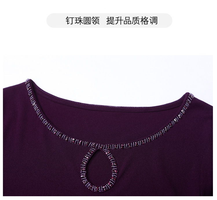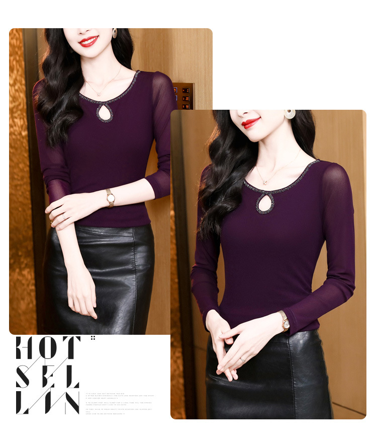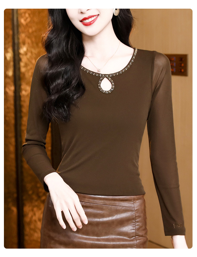 봄 2023 새로운 라운드 넥 올 매치 할로우 구슬 단색 긴 소매 메쉬베이스 셔츠 여성용 슬림 핏 슬리밍 티셔츠