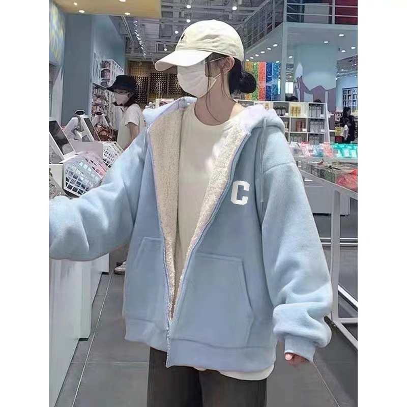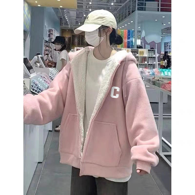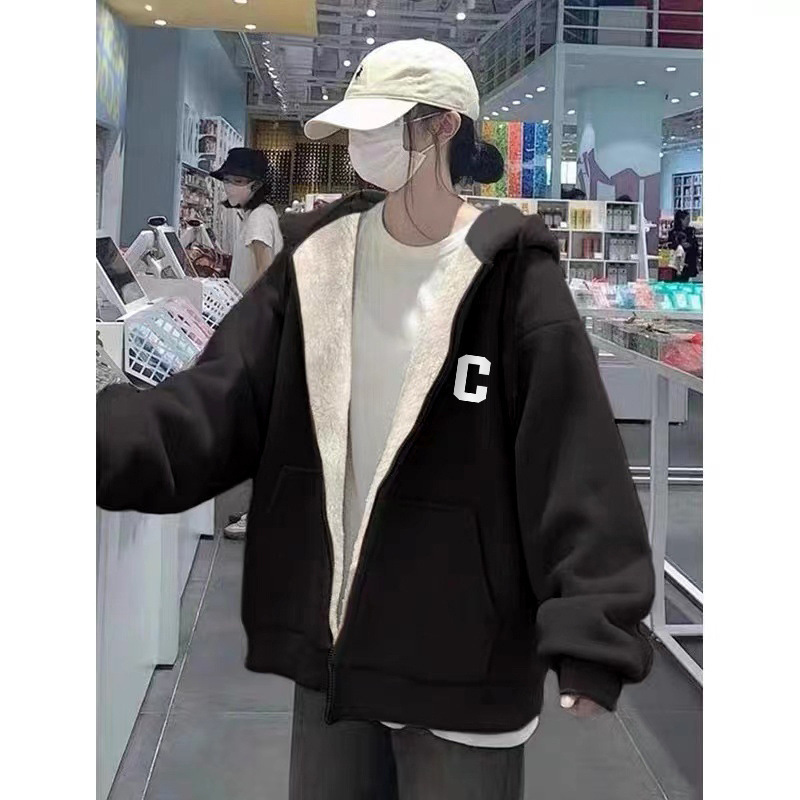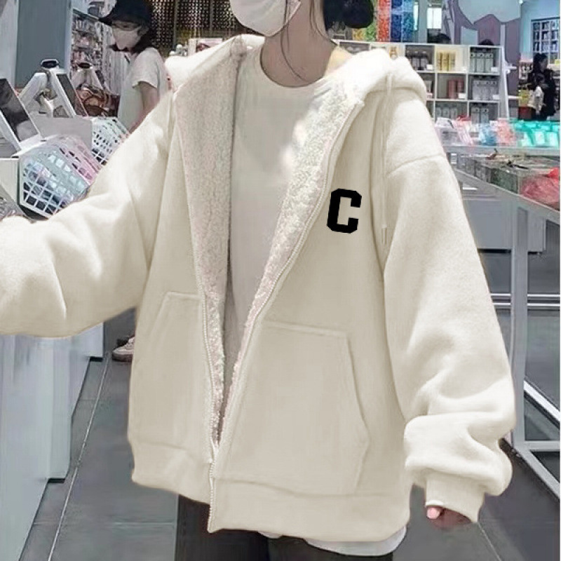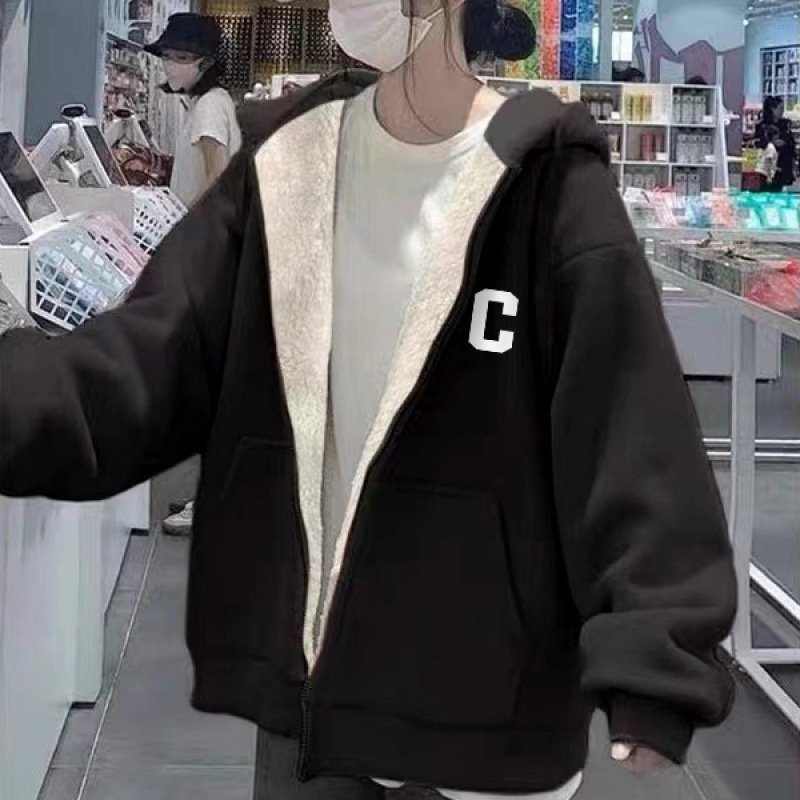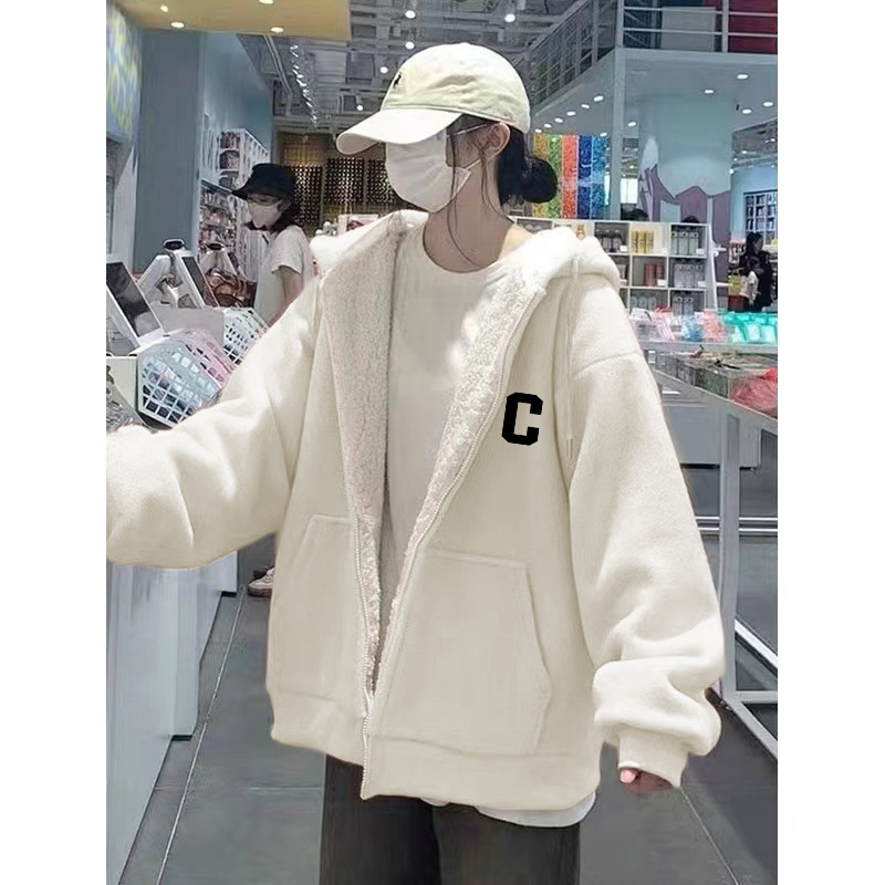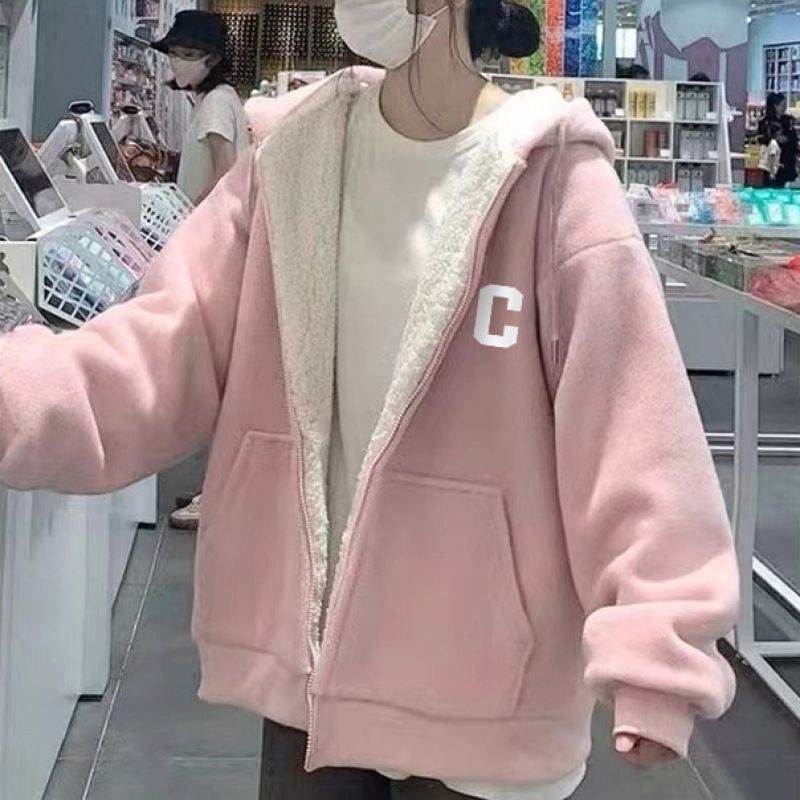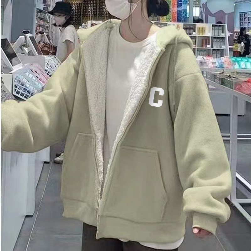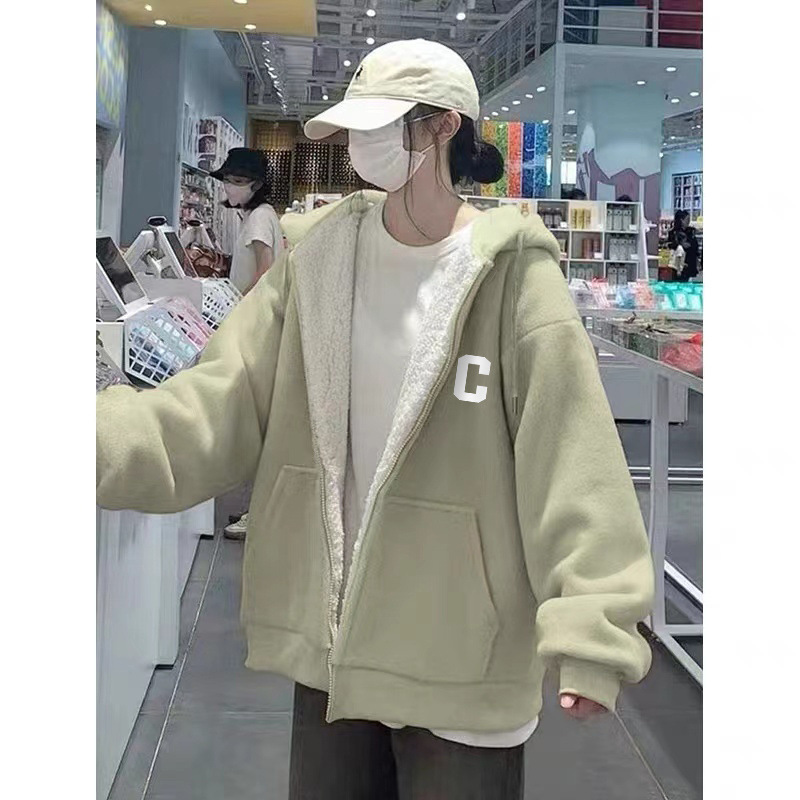 그린 후드 슈퍼 두꺼운 양모 양가죽 스웨터 코트 여자 겨울 2024 새로운 도착 기모 두꺼운 지퍼 트렌디 카디건스토어 가기