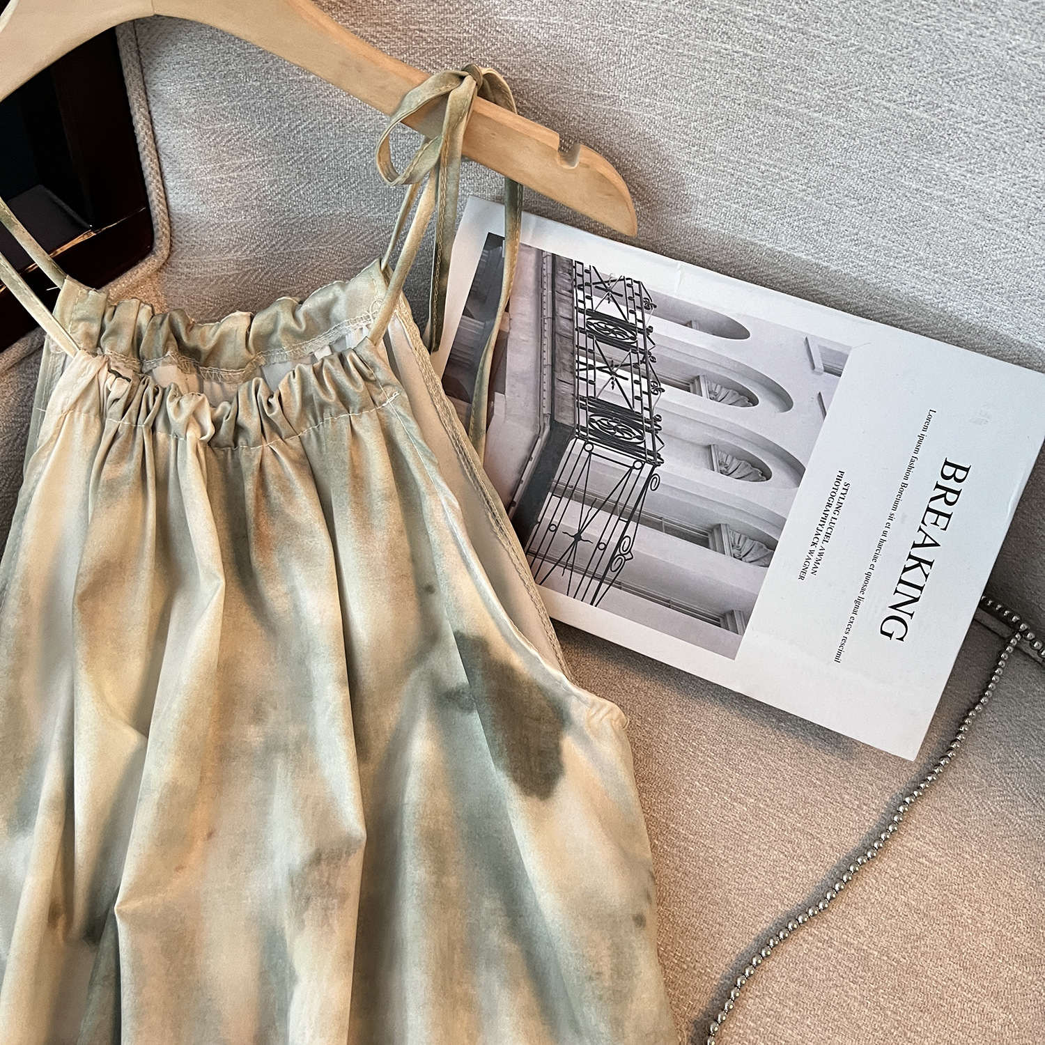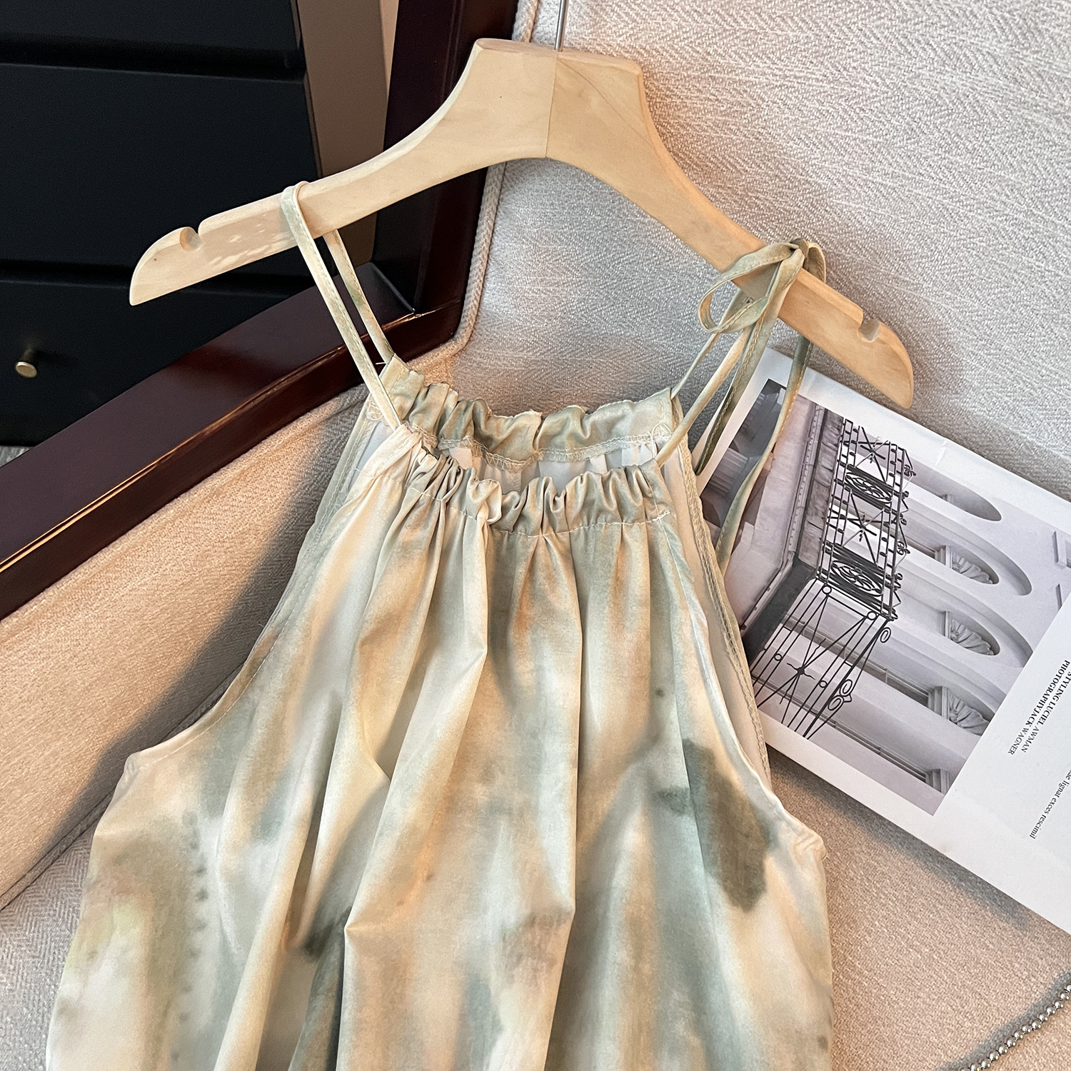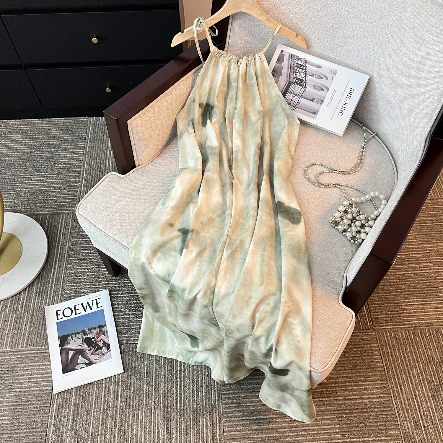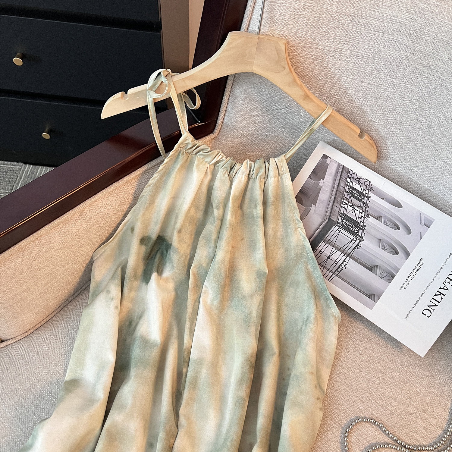 새로운 중국 스타일 민소매 헤일로 인쇄 교수형 목 여성 원피스 원피스 여름 해변 낭만적 인 휴가 우아한 긴 치마