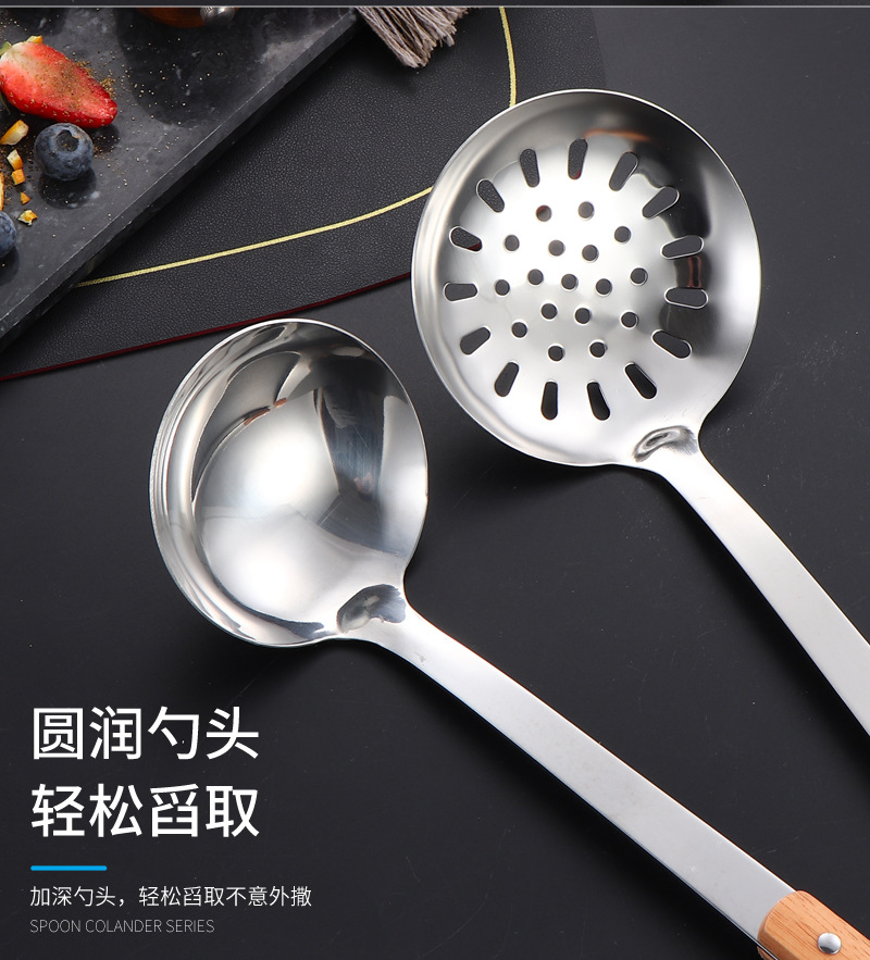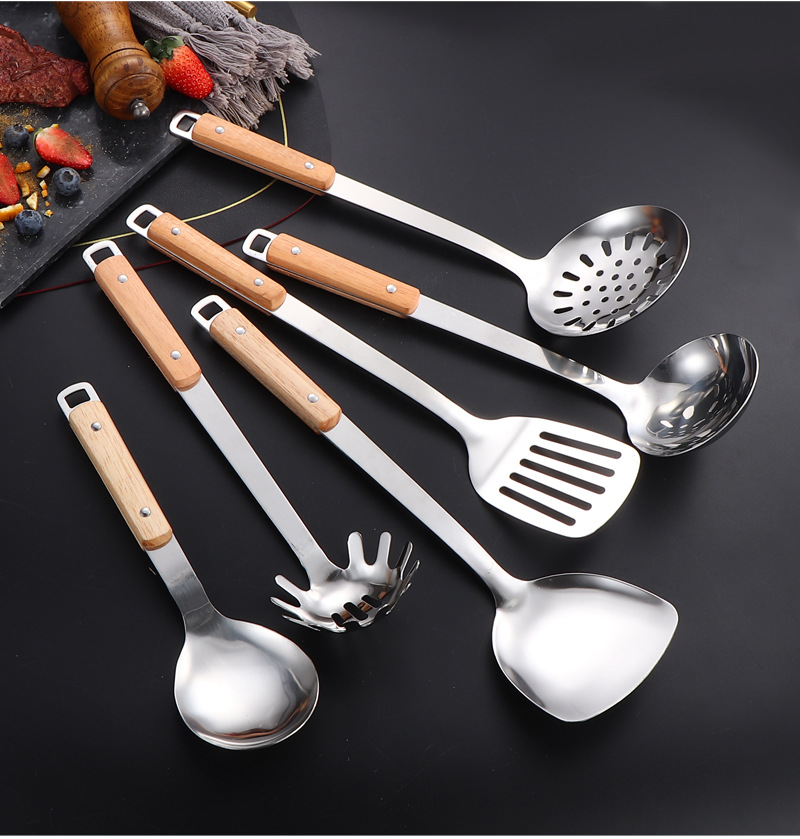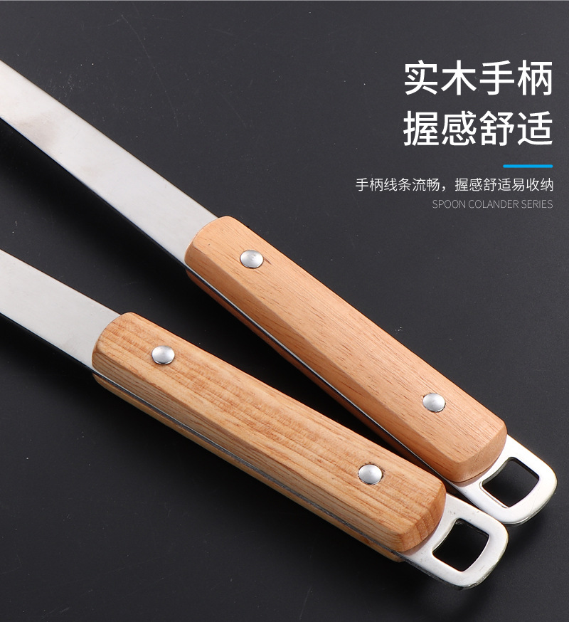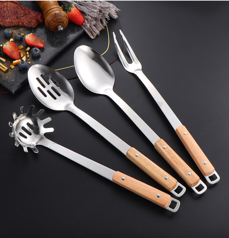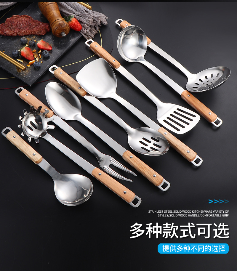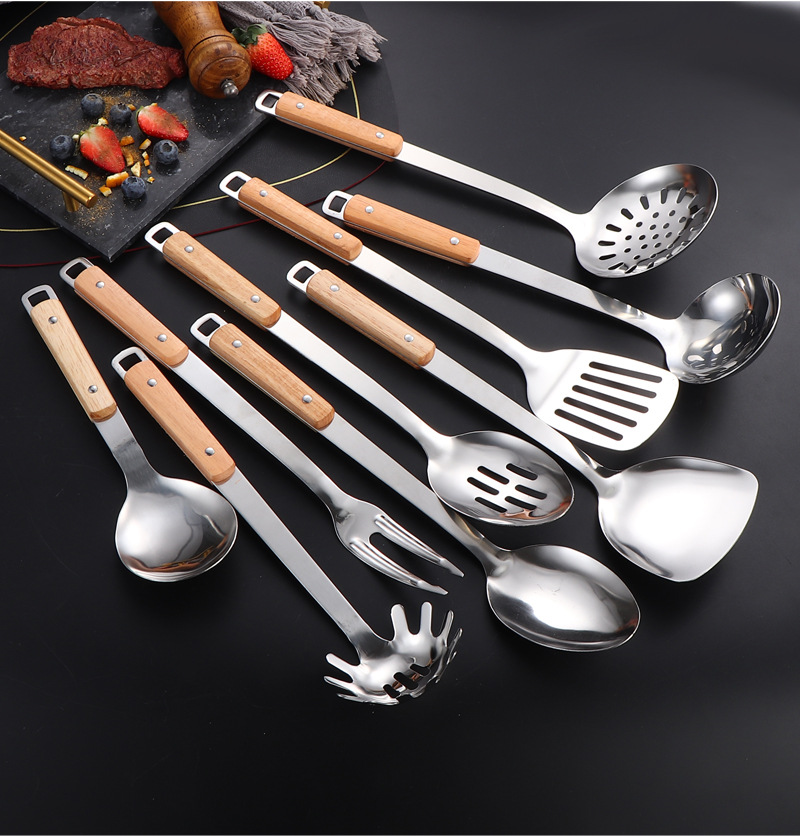 국경 간 스테인레스 주방 용품 두꺼운 나무 손잡이 주걱 튀김 주걱 수프 스푼 국수 고기 포크 요리 도구 9 피스 세트스토어 가기