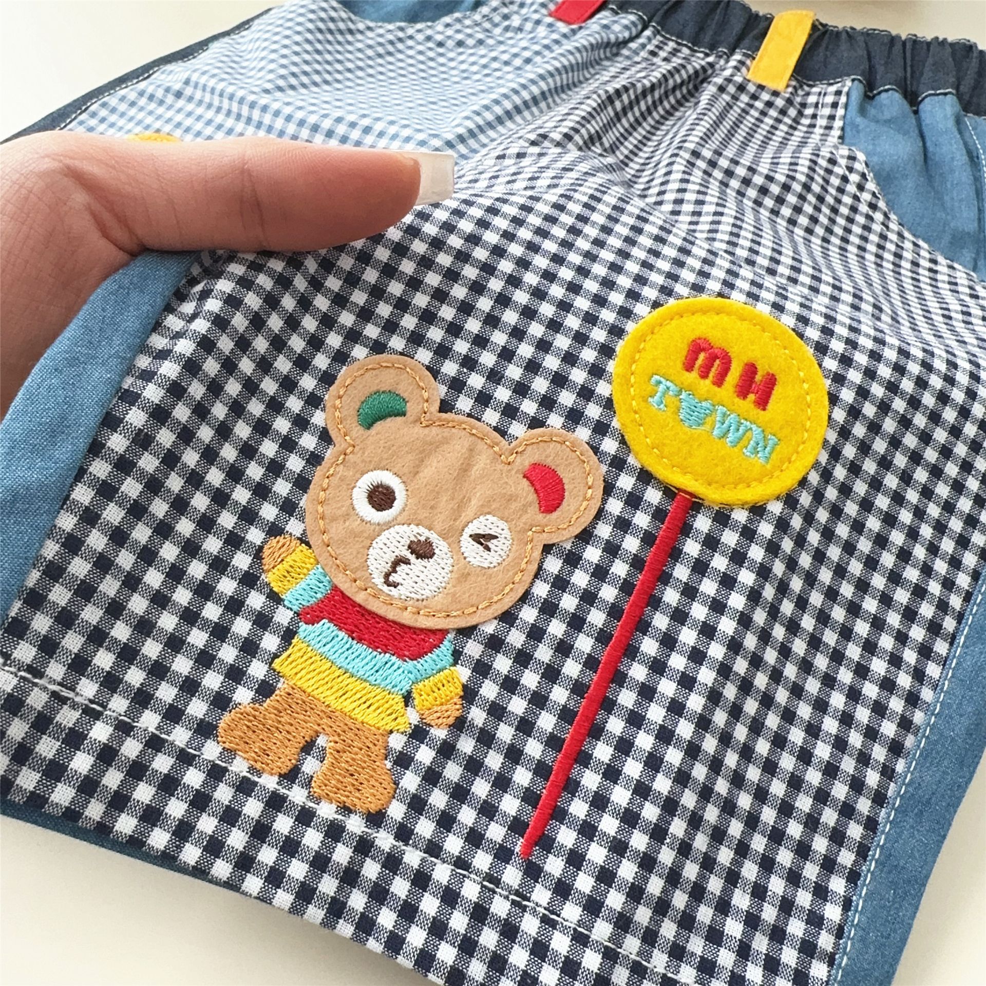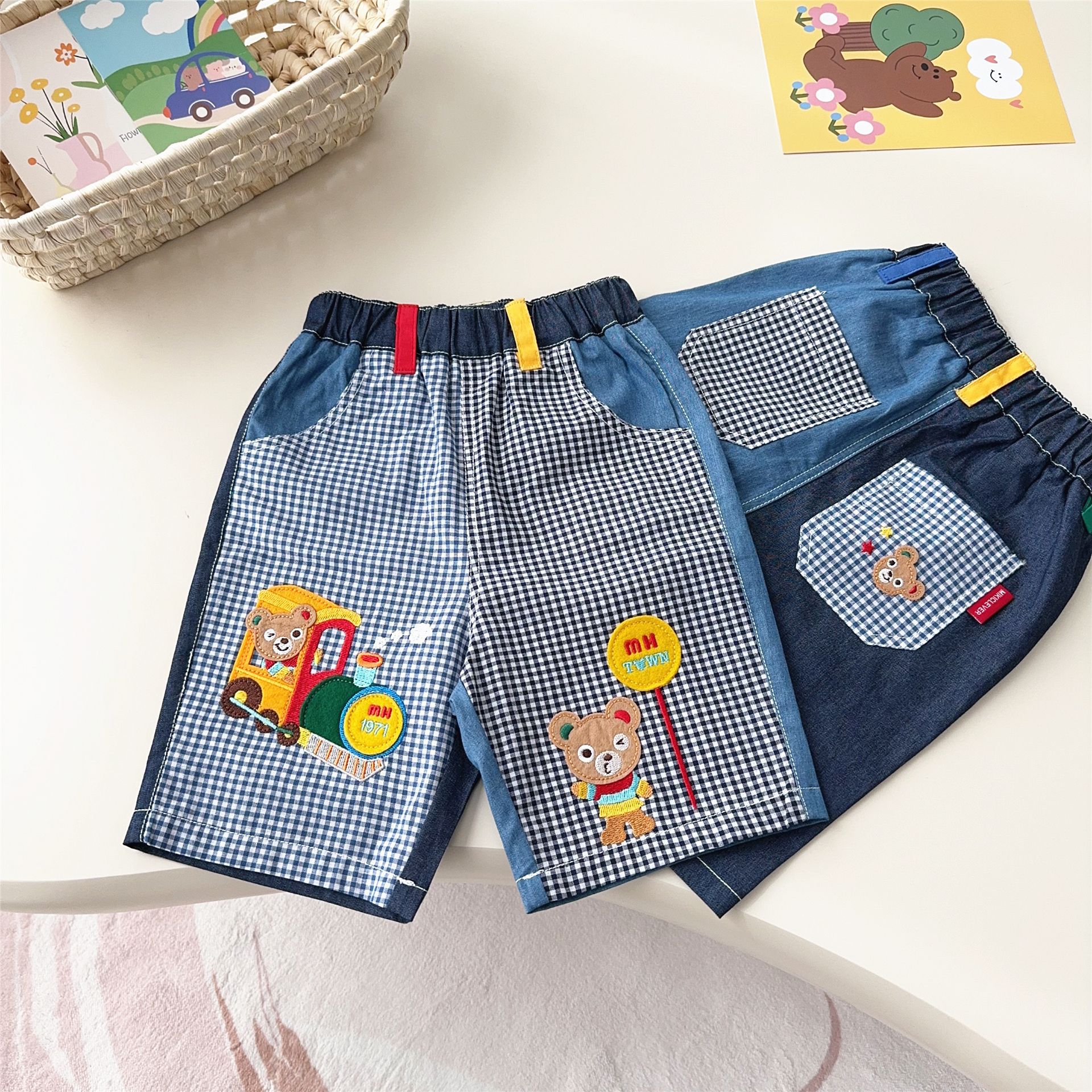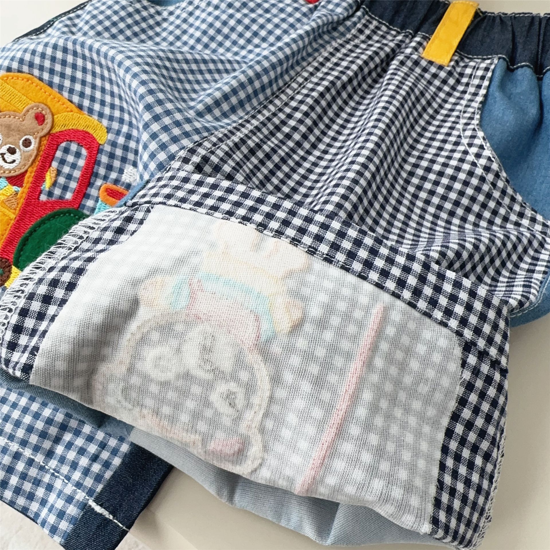 대외 무역 일본 아동복 25 Xia Xin 귀여운 곰 기차 자수 접합 격자 무늬 6점 반바지 7051