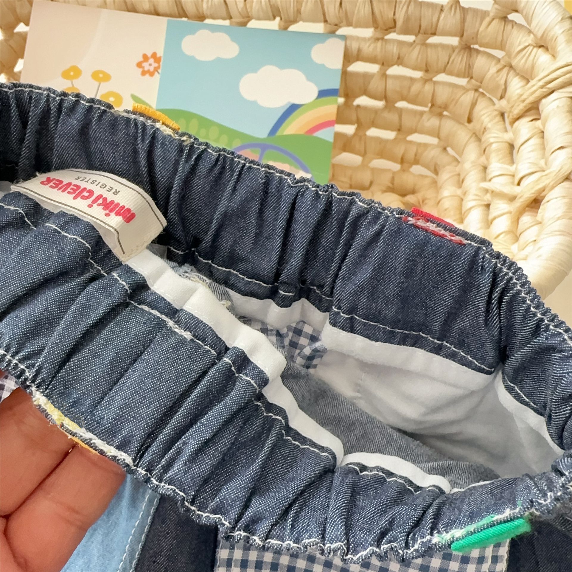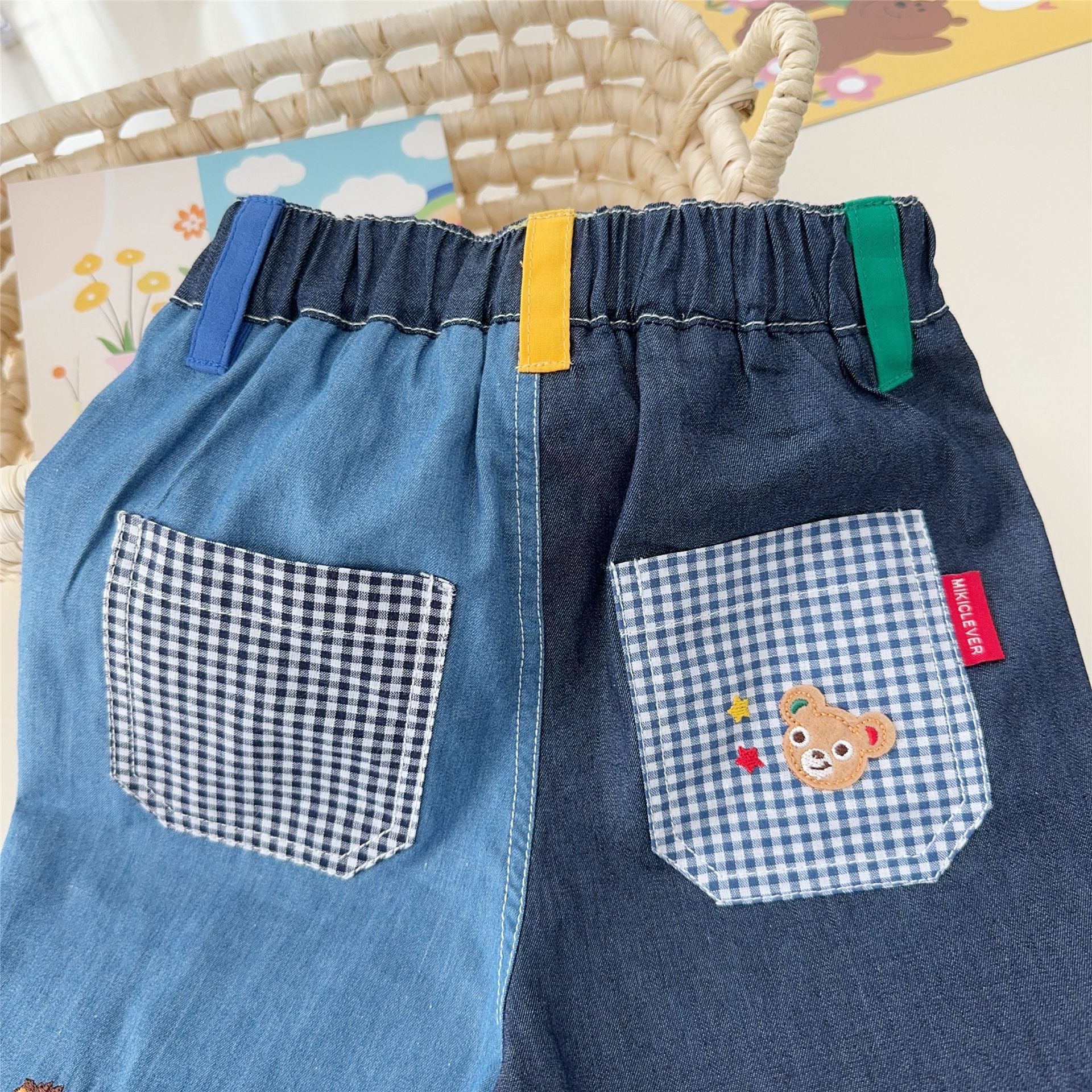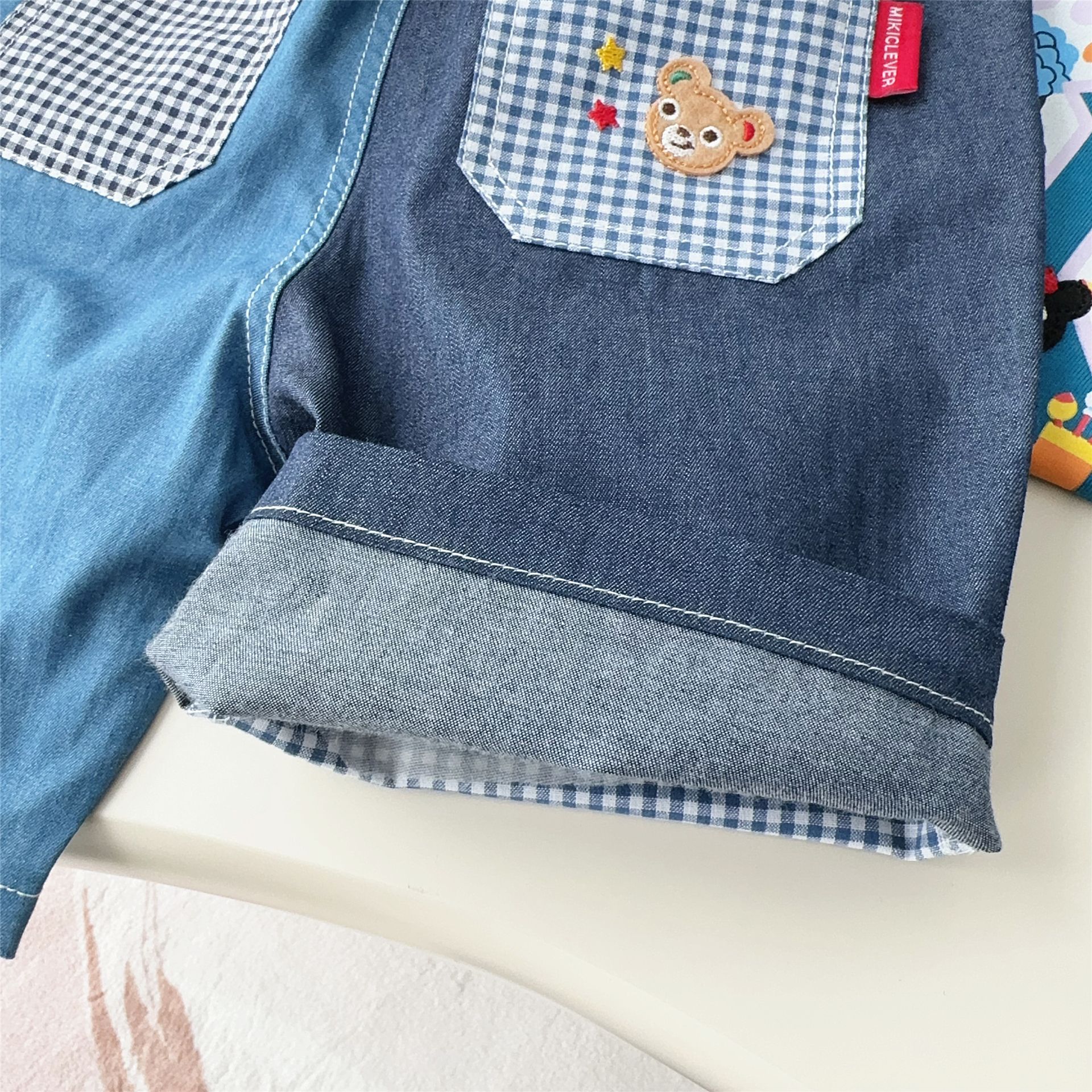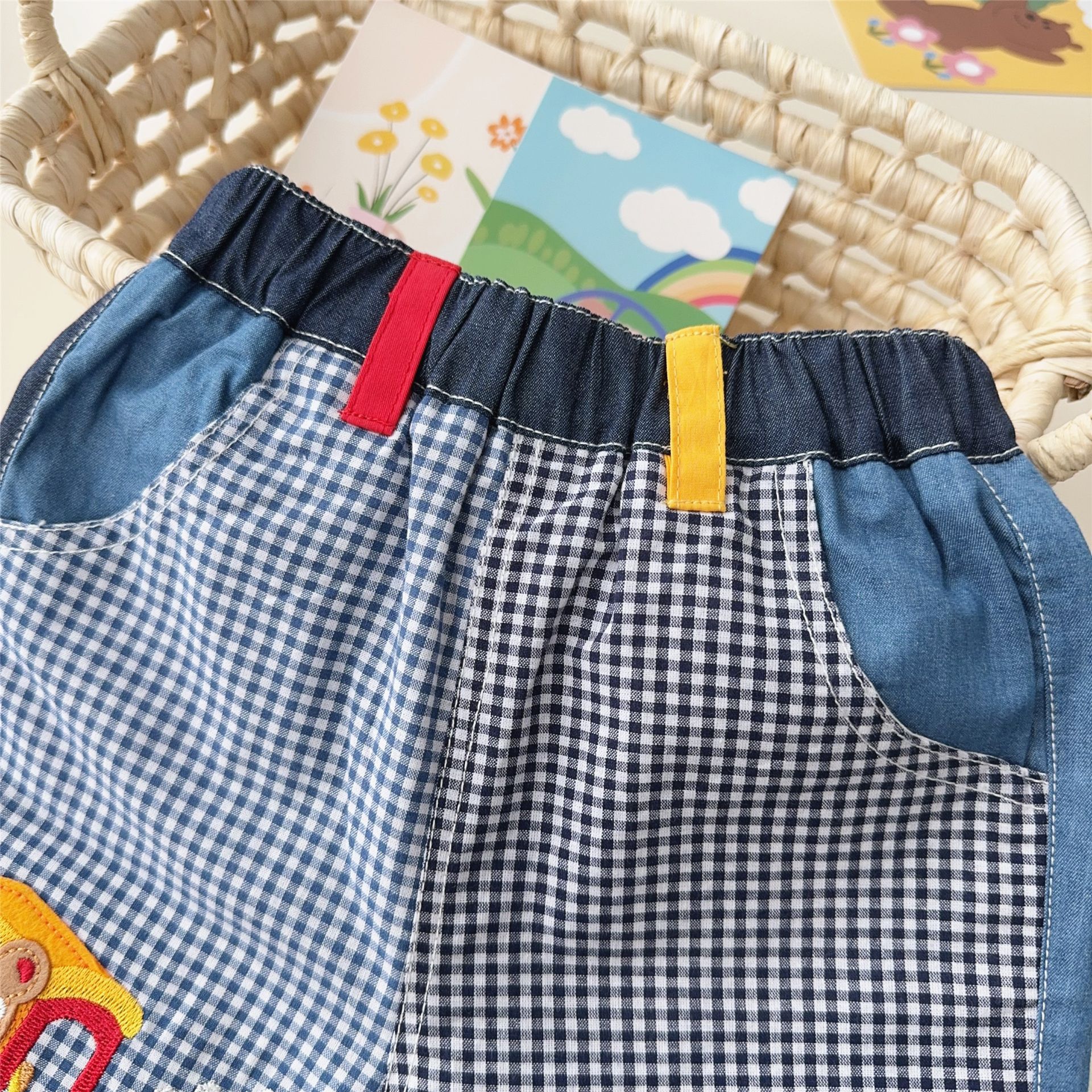 대외 무역 일본 아동복 25 Xia Xin 귀여운 곰 기차 자수 접합 격자 무늬 6점 반바지 7051
