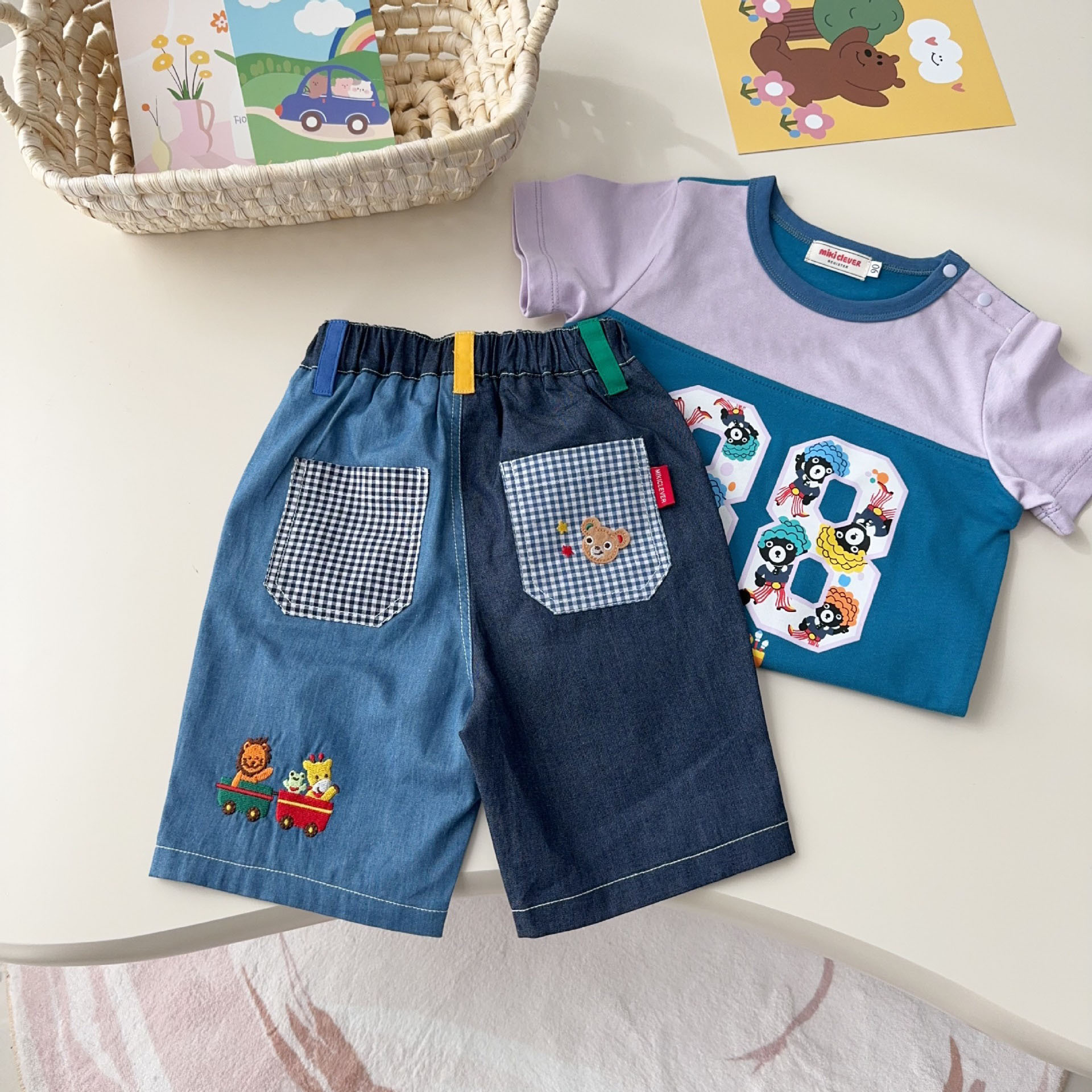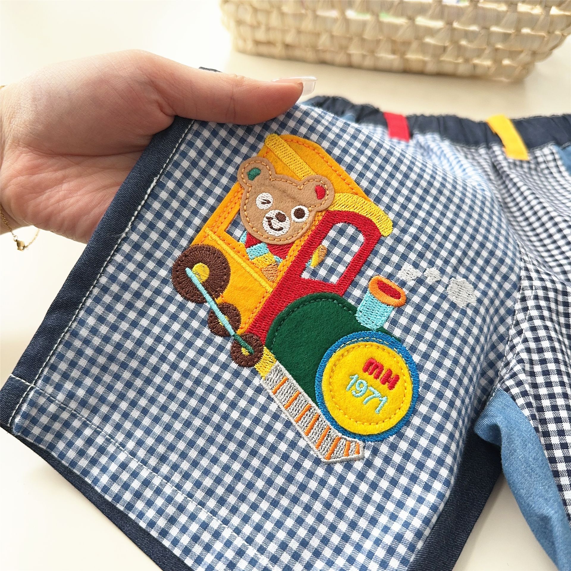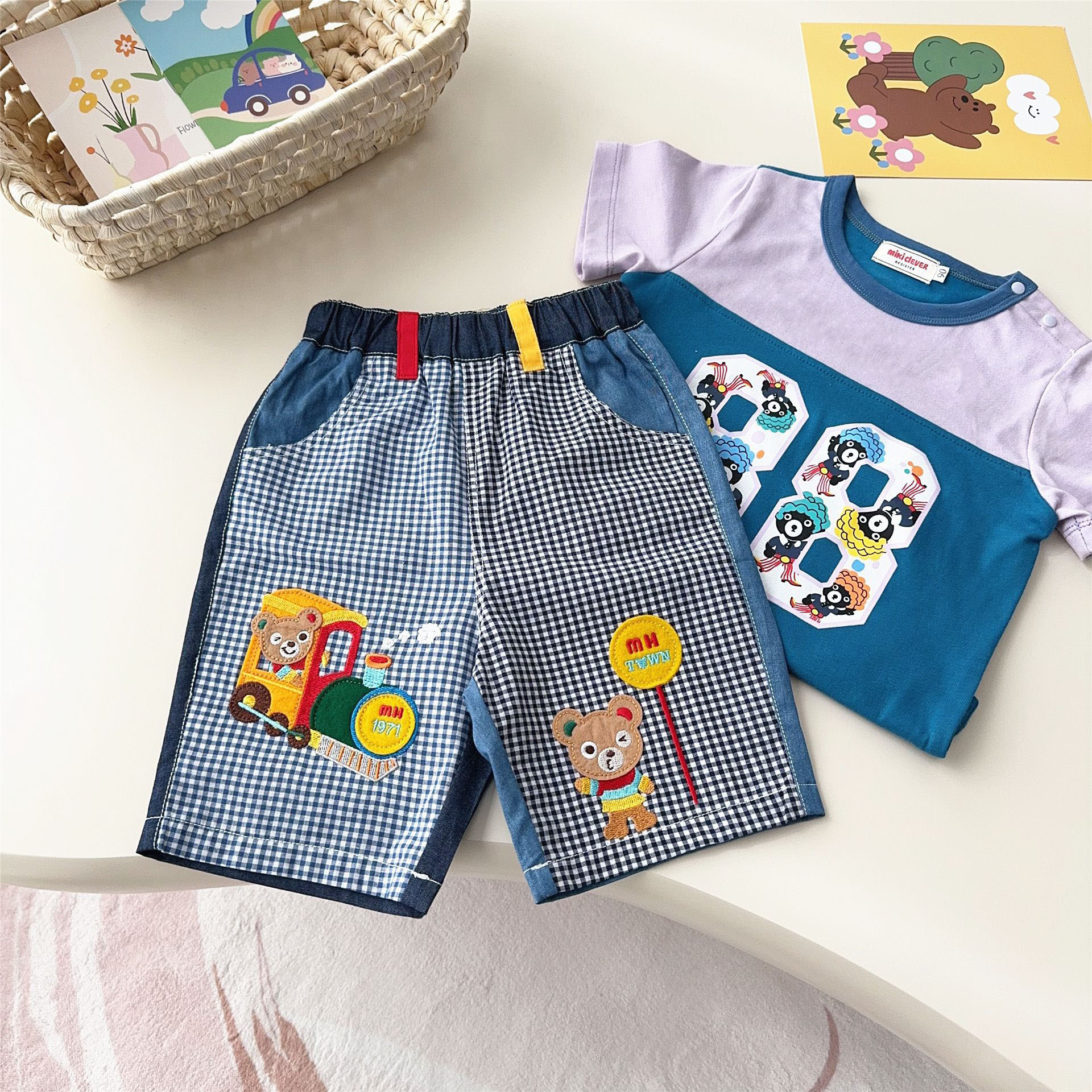 대외 무역 일본 아동복 25 Xia Xin 귀여운 곰 기차 자수 접합 격자 무늬 6점 반바지 7051스토어 가기