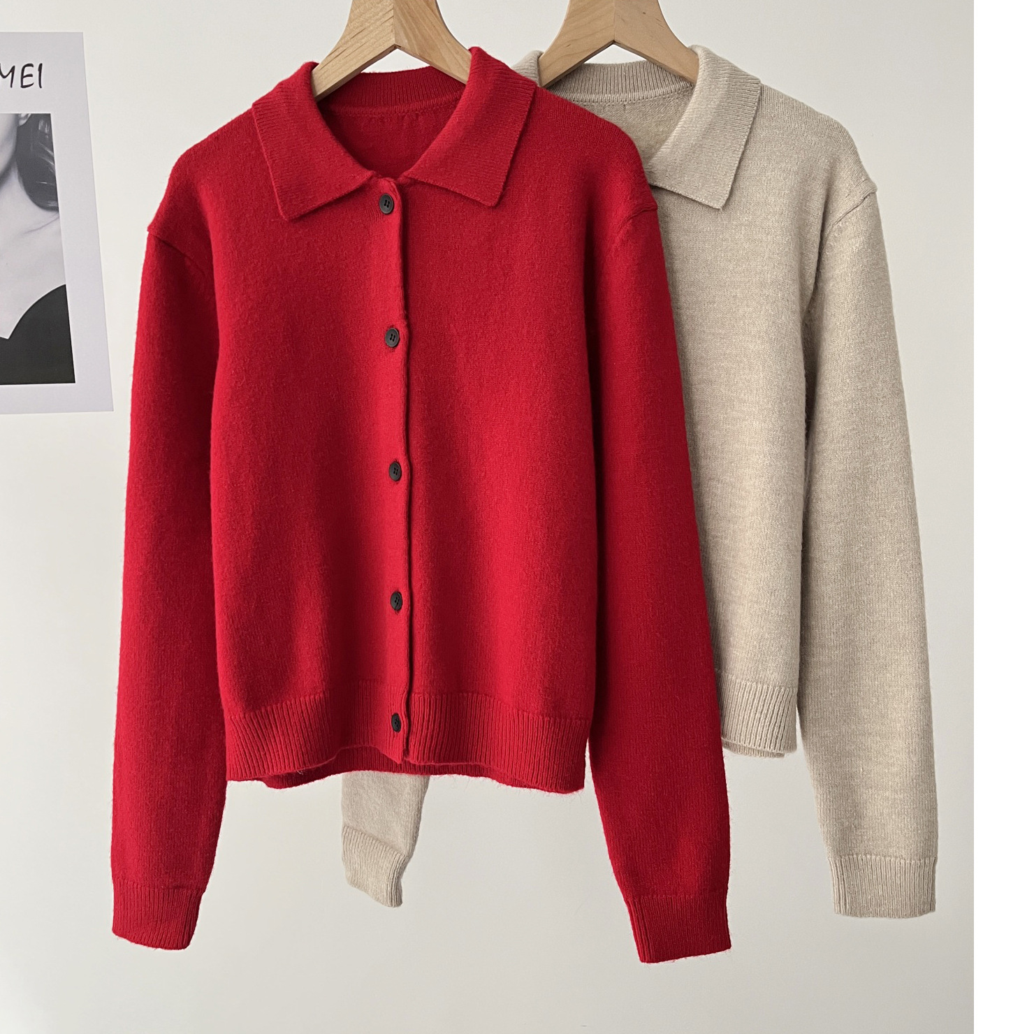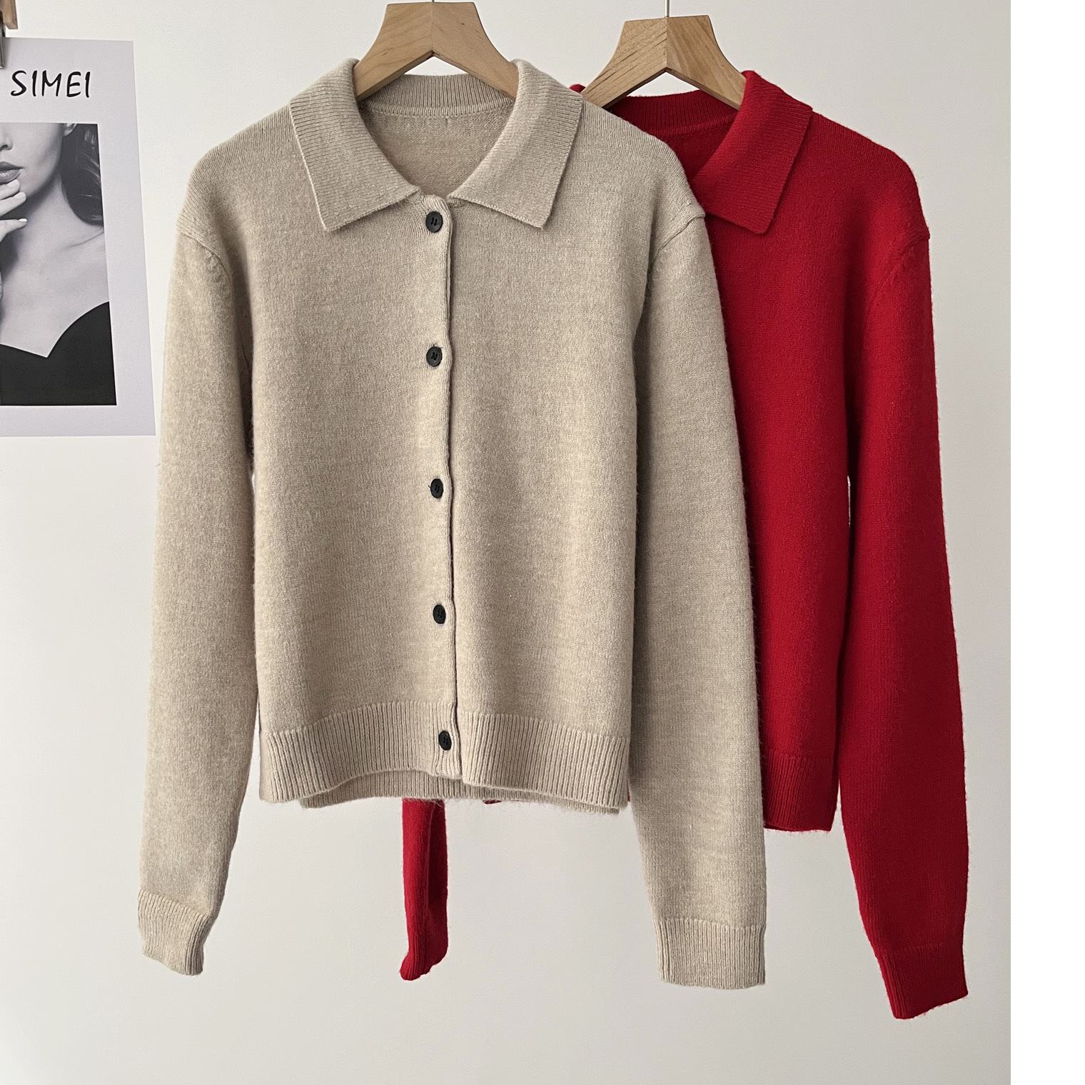 여자 재고 M 스타일 간단한 올 매치 울 블렌드 폴로 넥 싱글 브레스트 니트 카디건 스웨터