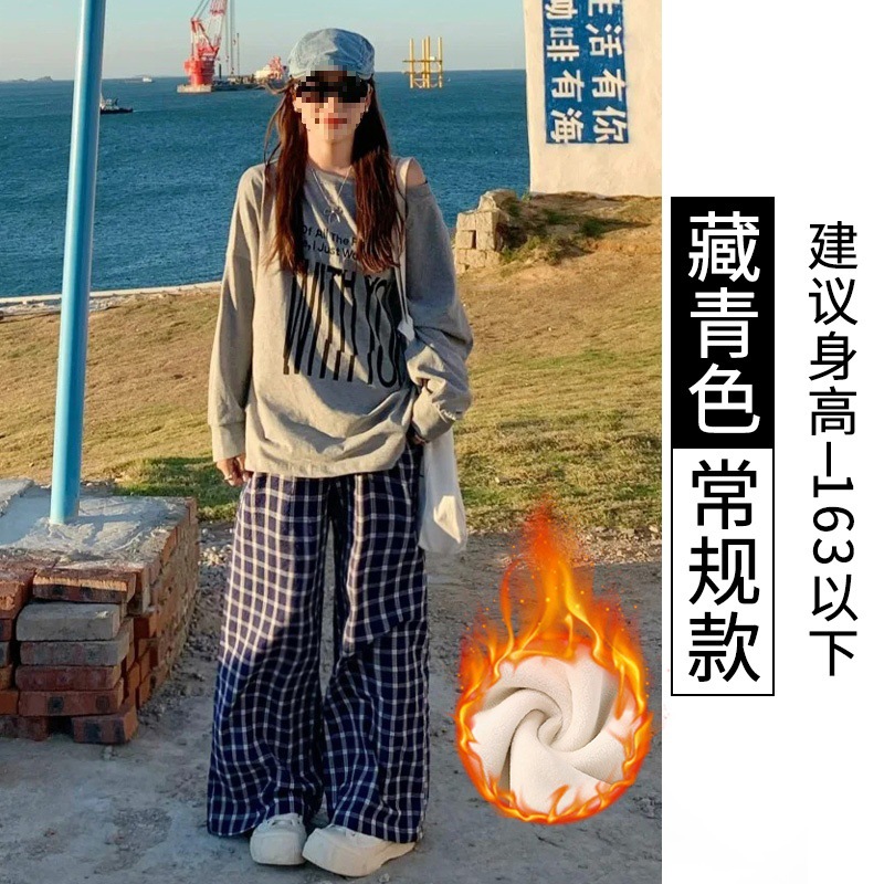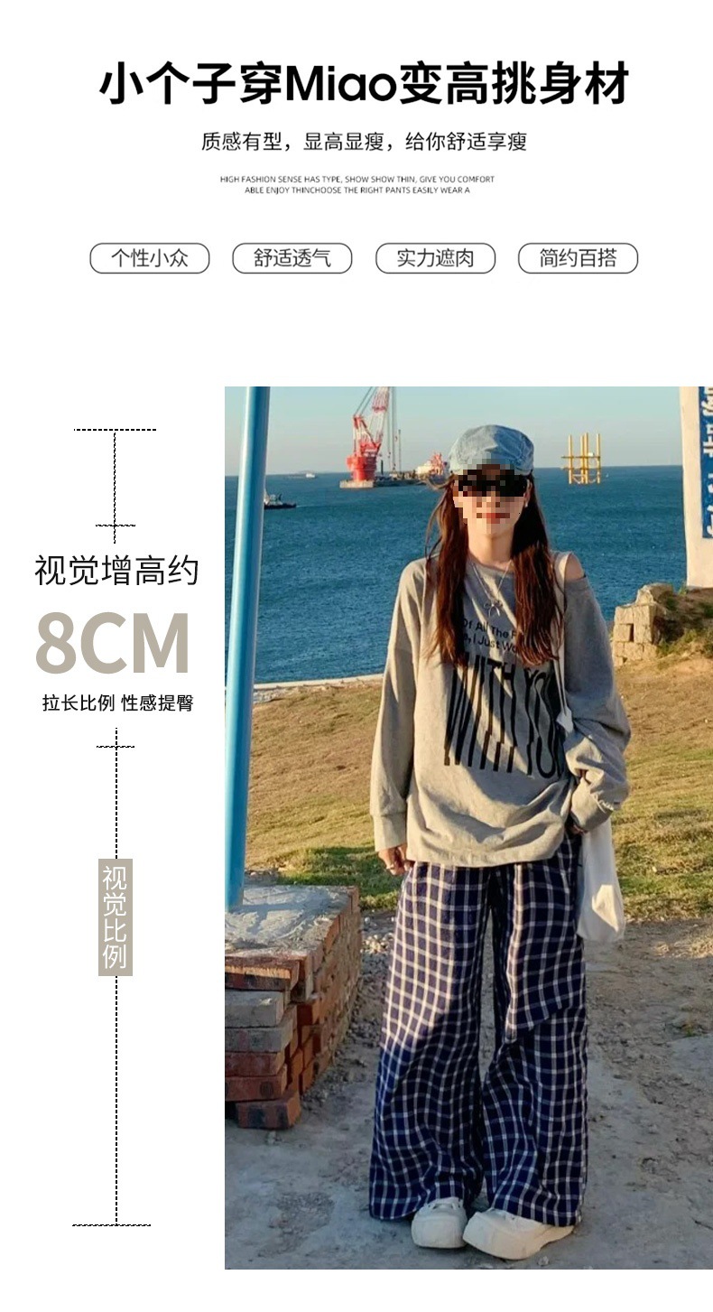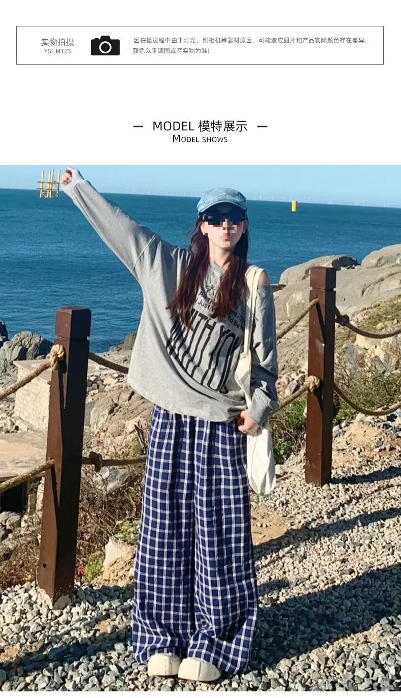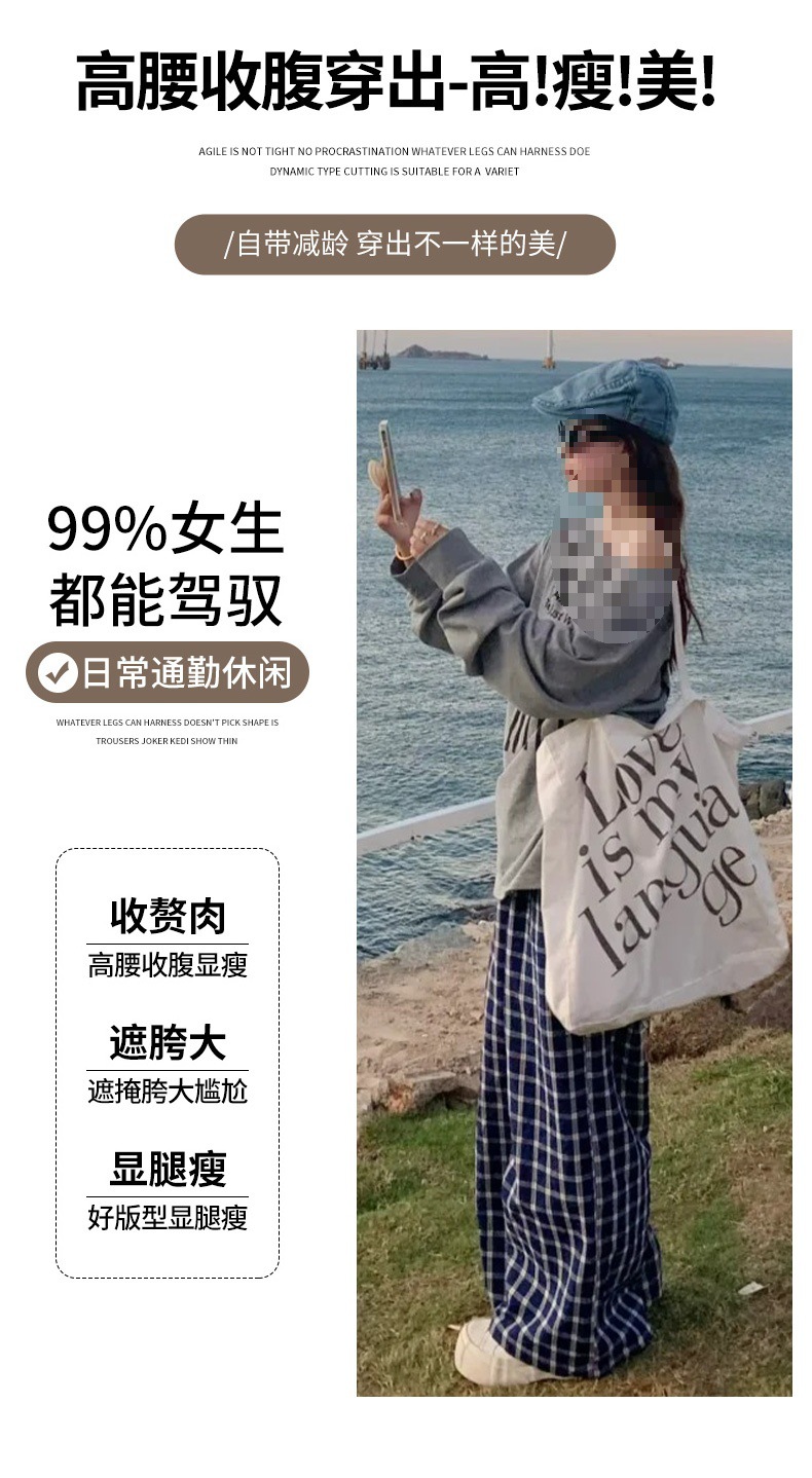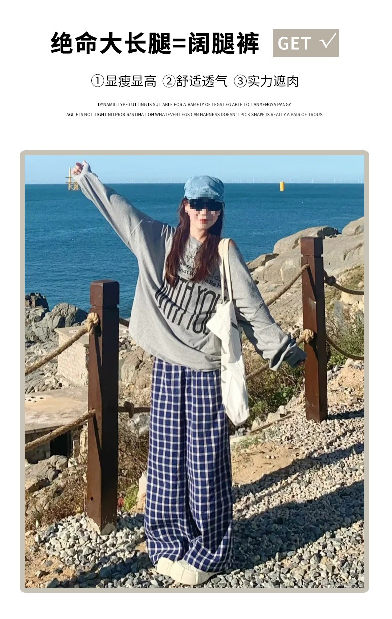 자오 루시 격자 무늬 바지 여성의 봄과 가을 2024 새로운 파란색 게으른 느슨한 직선 걷기 캐주얼 와이드 다리 바지스토어 가기