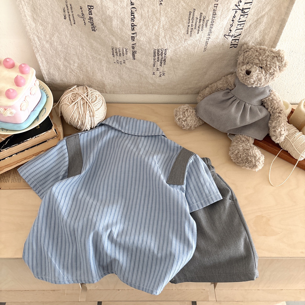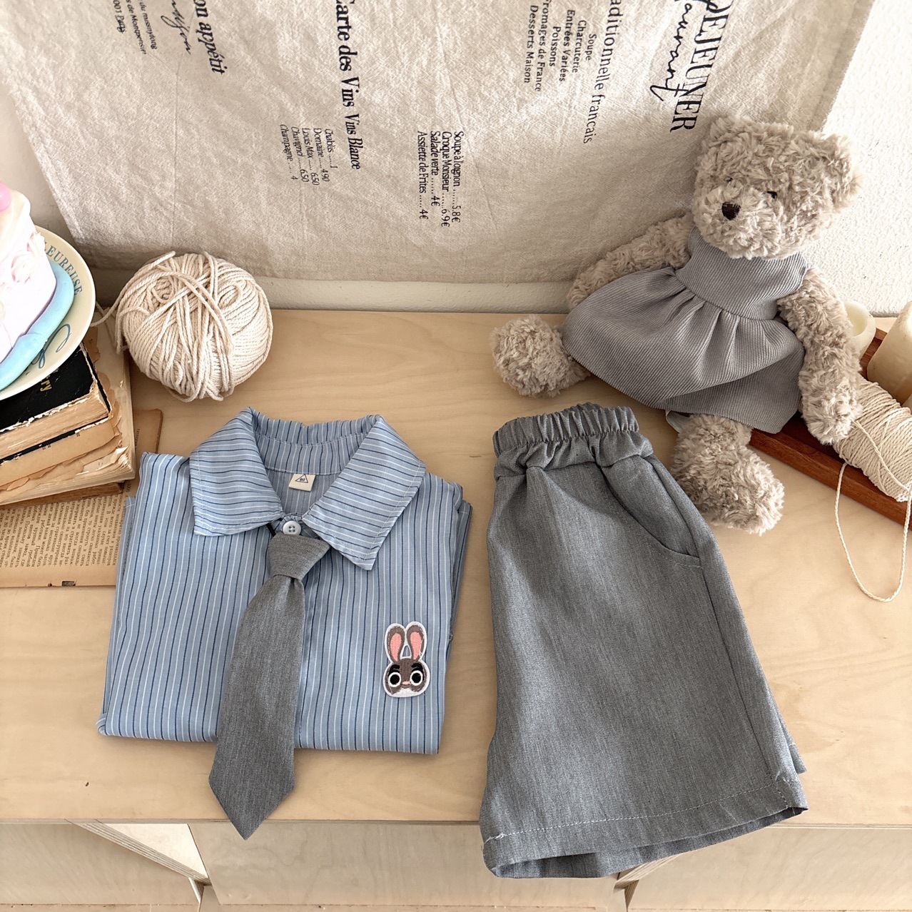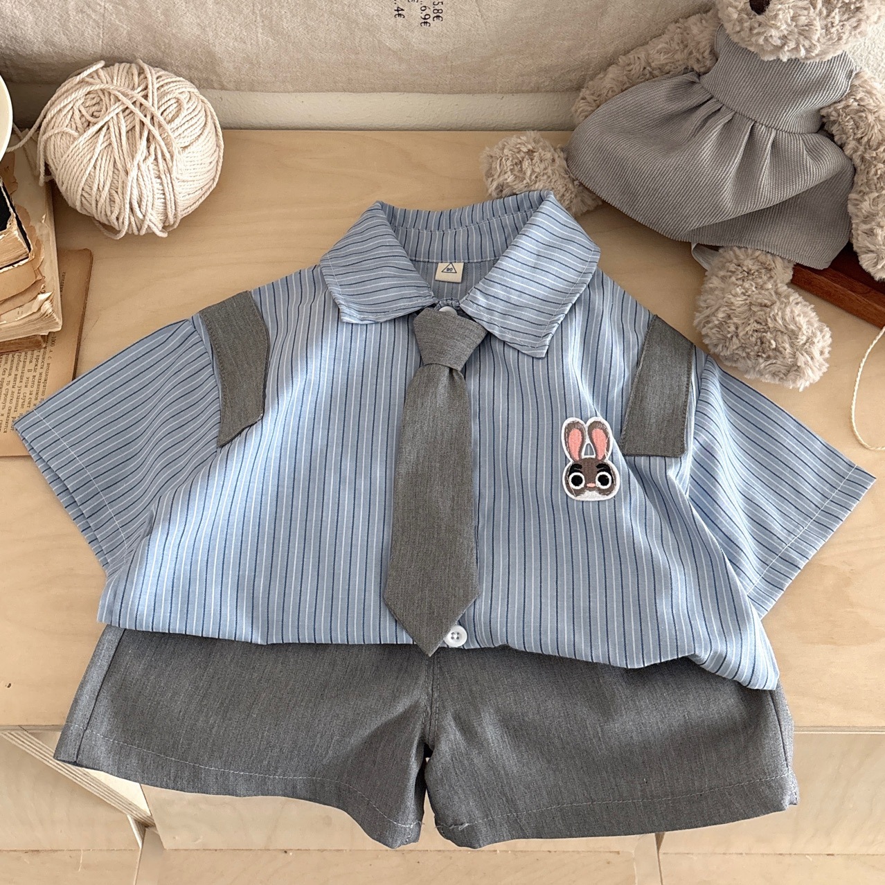 • 토끼 스트라이프 셔츠 + 반바지 투피스 세트, 프리 타이