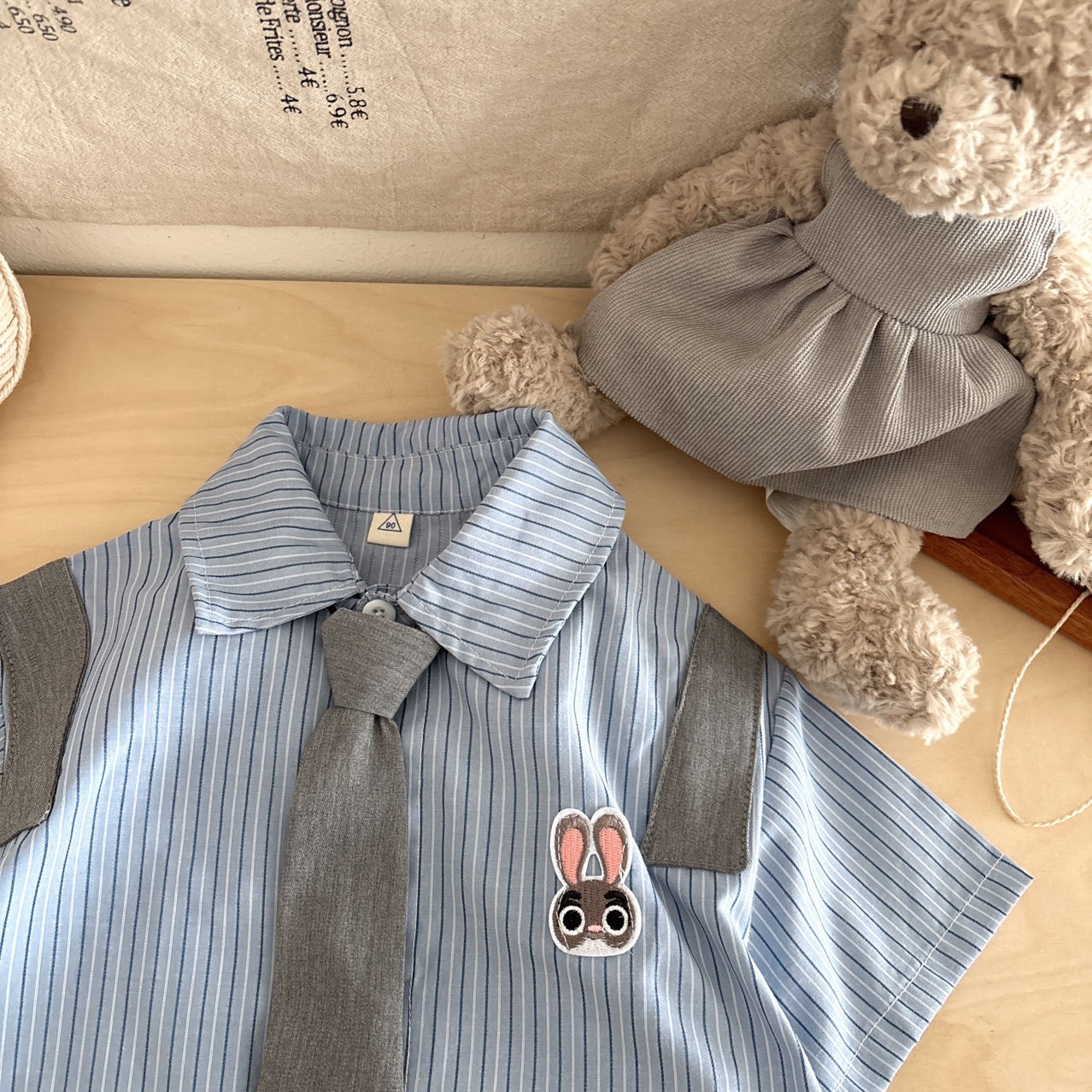 토끼 경찰관] 소년의 셔츠 세트 2025 년 여름 새 줄무늬 간단한 대학 토끼 자수 2 피스 세트스토어 가기