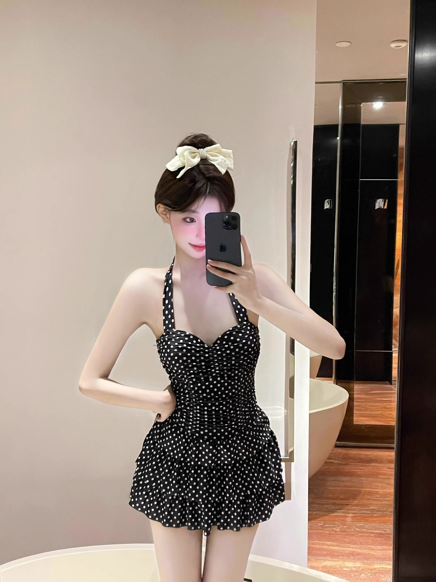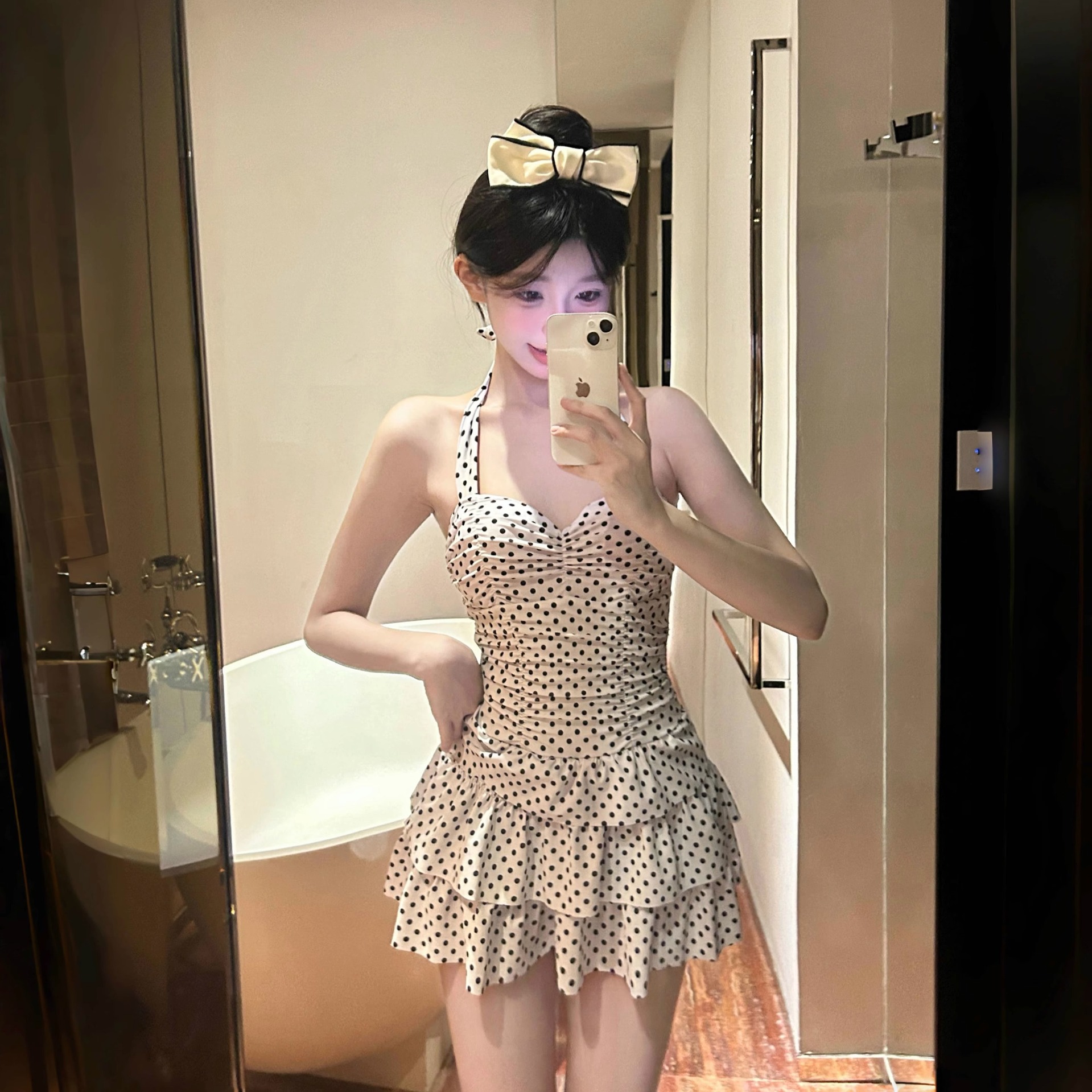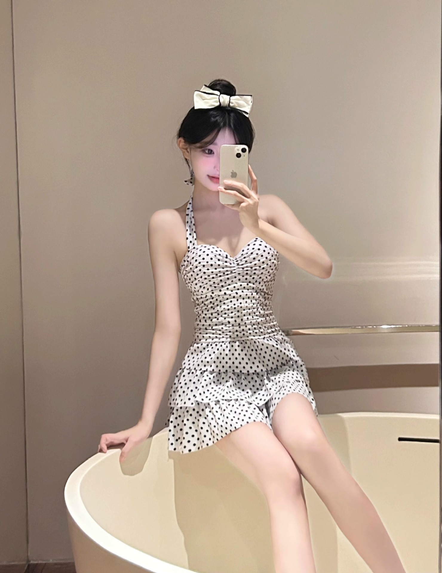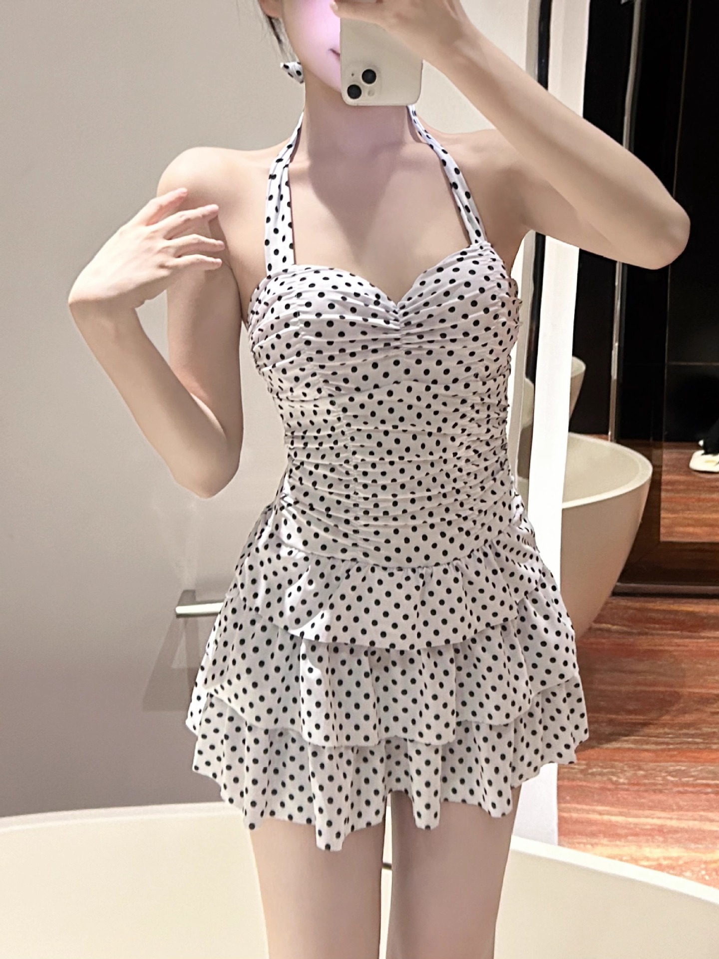 2025 새로운 원피스 스커트 스타일 폴로 도트 수영복 여성 온천-보수적 인 슬림 모양의 고기로 덮인 섹시한 큰 가슴 수집 수영복스토어 가기