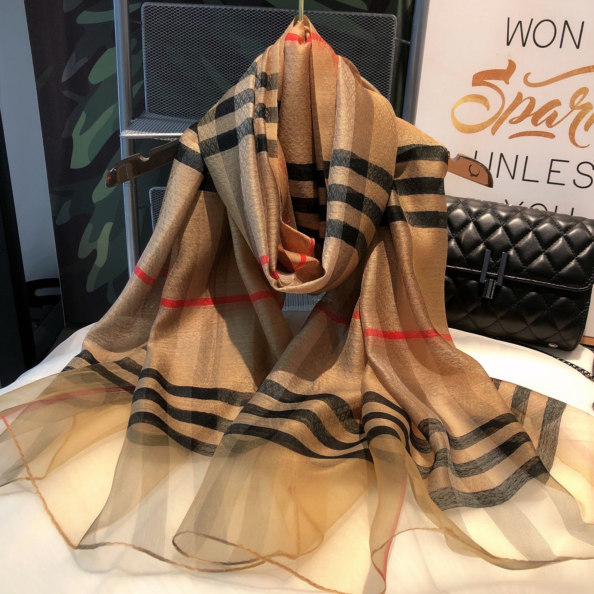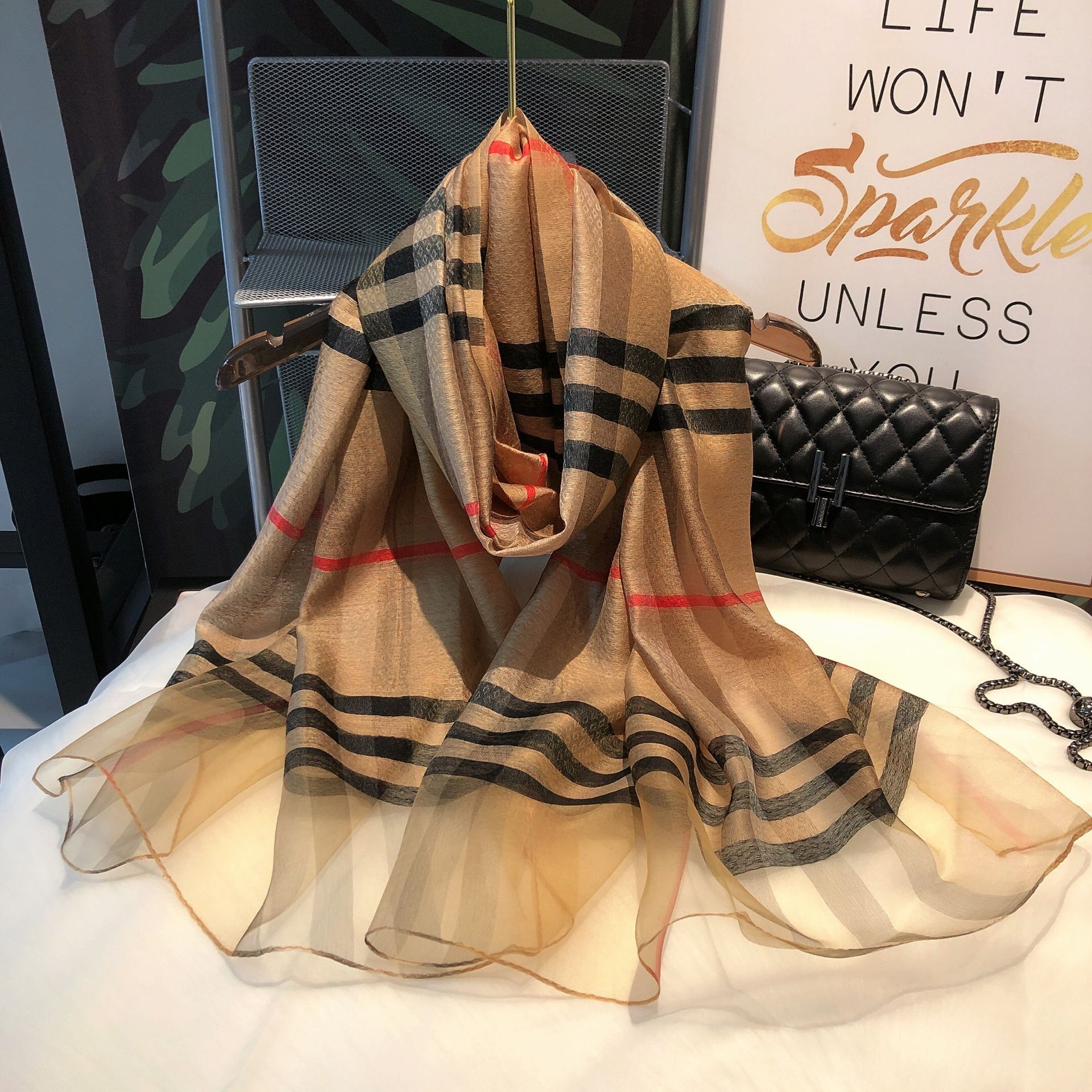고급 격자 무늬 40% 진짜 실크 뽕나무 실크 60% 양모 스카프 얇은 가을과 겨울 줄무늬 실크 스카프 금실 큰 목도리스토어 가기