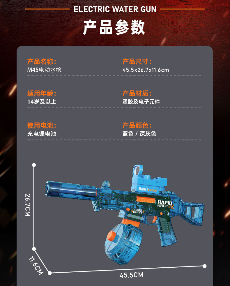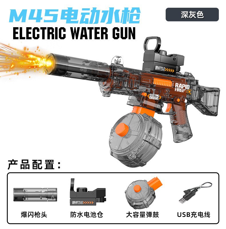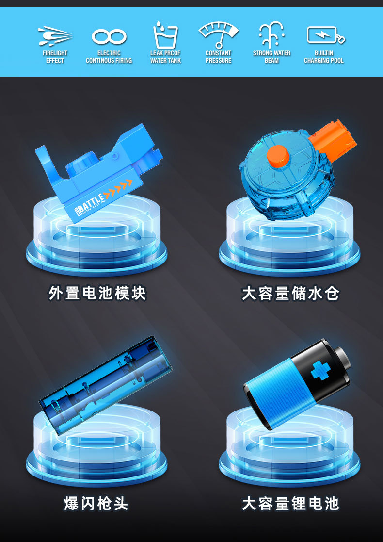 电动玩具水枪的乐趣,还在于它为亲子互动和社交活动增添了无限活力。和孩子一起在户外玩水枪,看着他们天真无邪的笑容,感受着亲子间的亲密无间;和朋友们组织一场水枪大战,在水花四溅中嬉笑打闹,友谊也在这欢乐的氛围中愈发深厚。