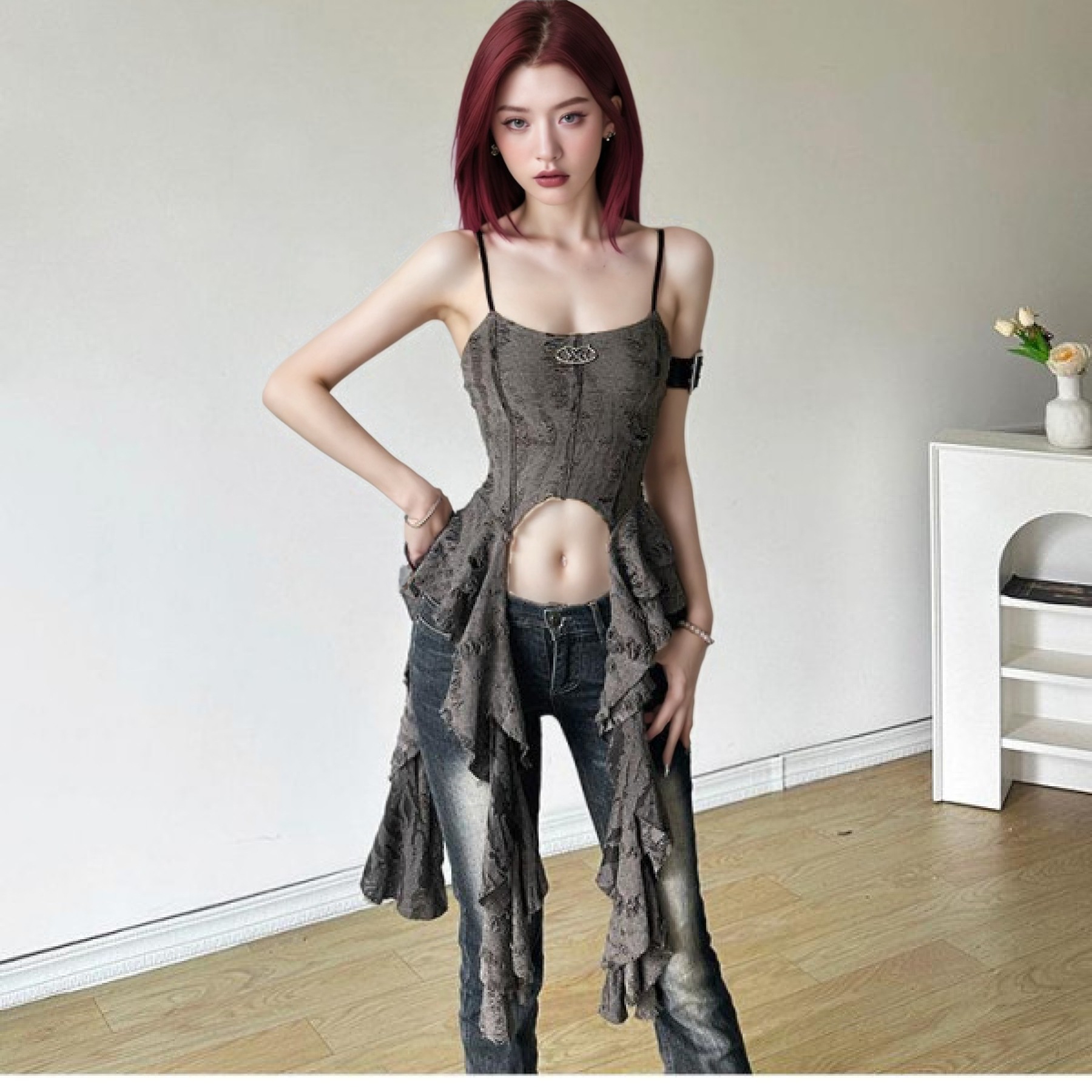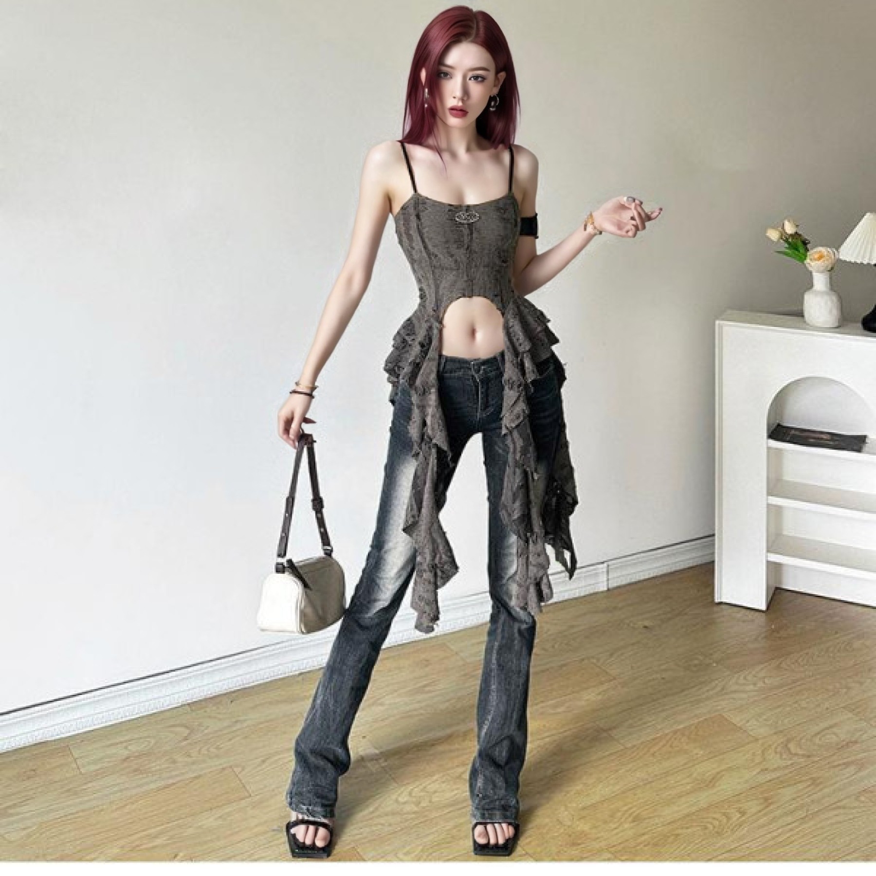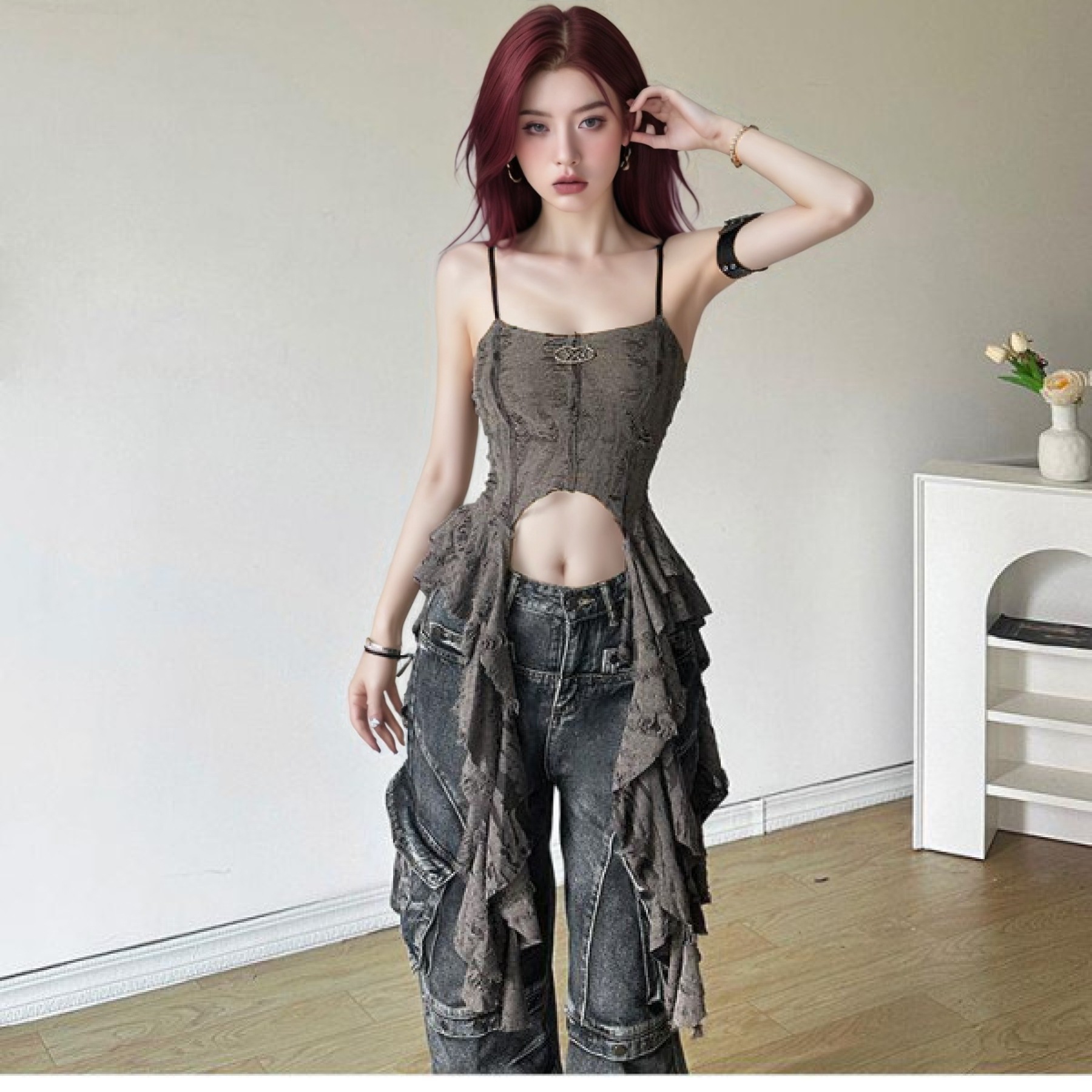 국경을 넘는 대외 무역 폐기물 스타일 올드 카미 솔 여성의 여름 러플 쇼트 탑 스파이스 걸스 네이벨에서 슬리밍