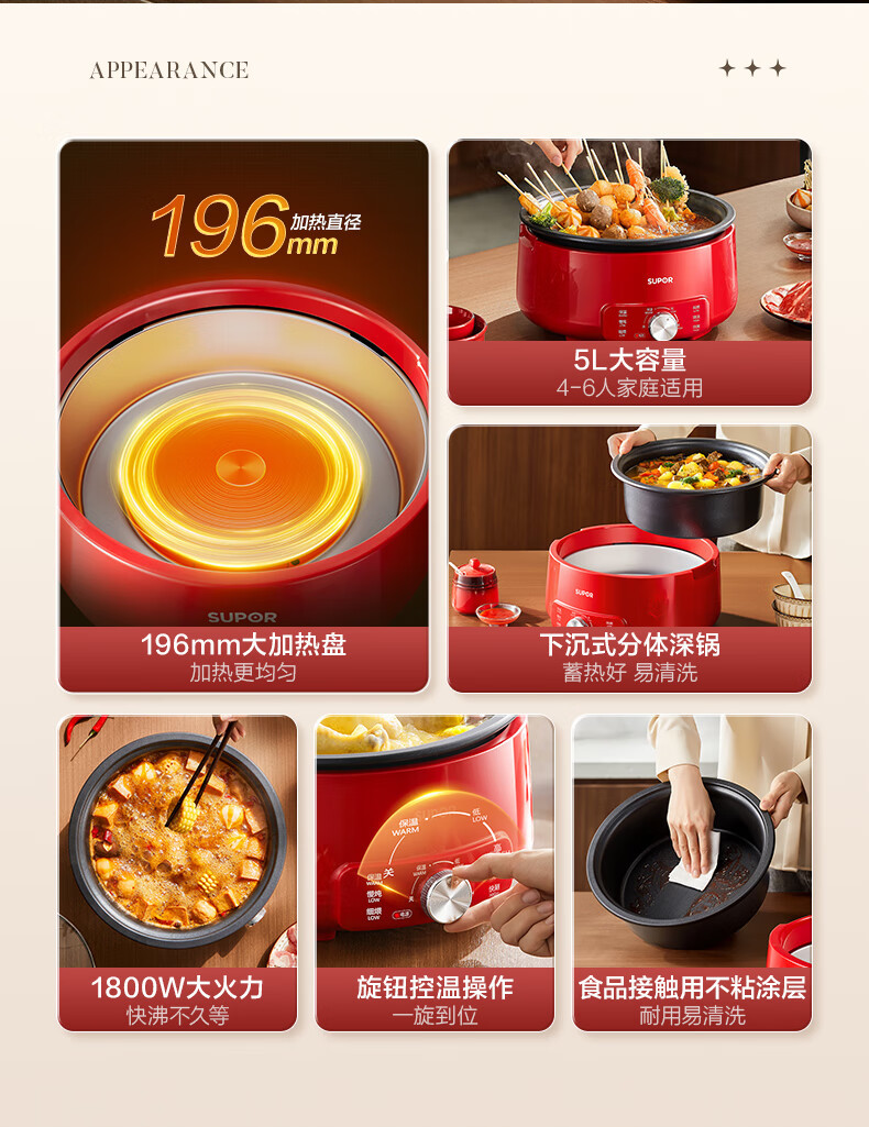 슈바 고기 비 스틱 스플릿 이동식 및 세척 가능한 전기 핫 포트 H50YK787 용 전기 핫 포트 5L 전기 요리 포트