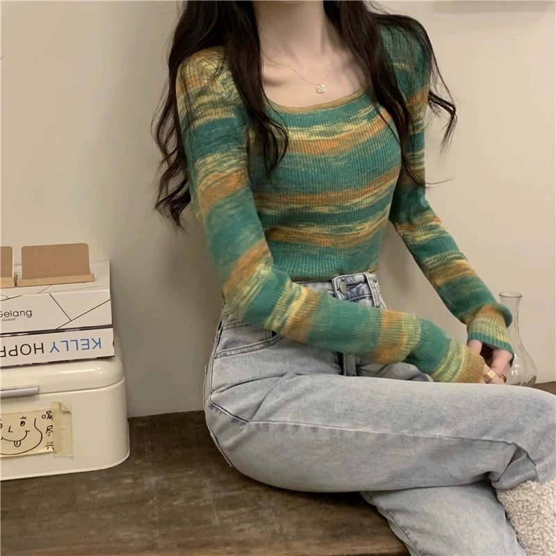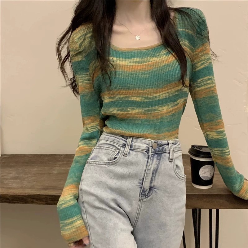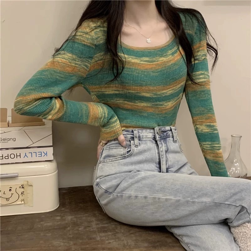 2024 가을과 겨울 새 광장 칼라 스트라이프 긴팔 니트베이스 셔츠 여성용 슬림핏 슬리밍 스파이스 걸 쇼트탑스토어 가기