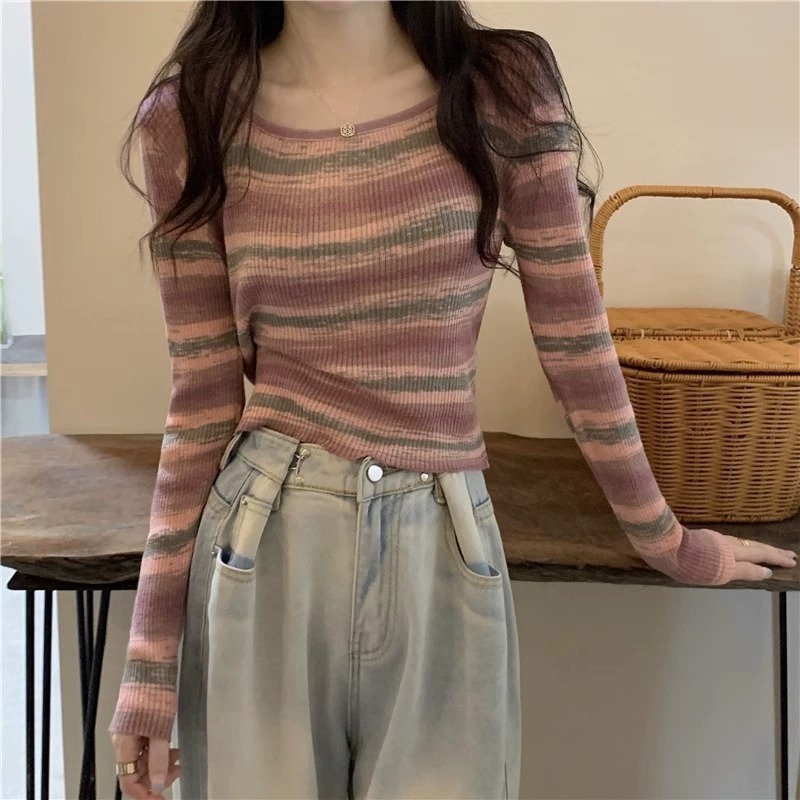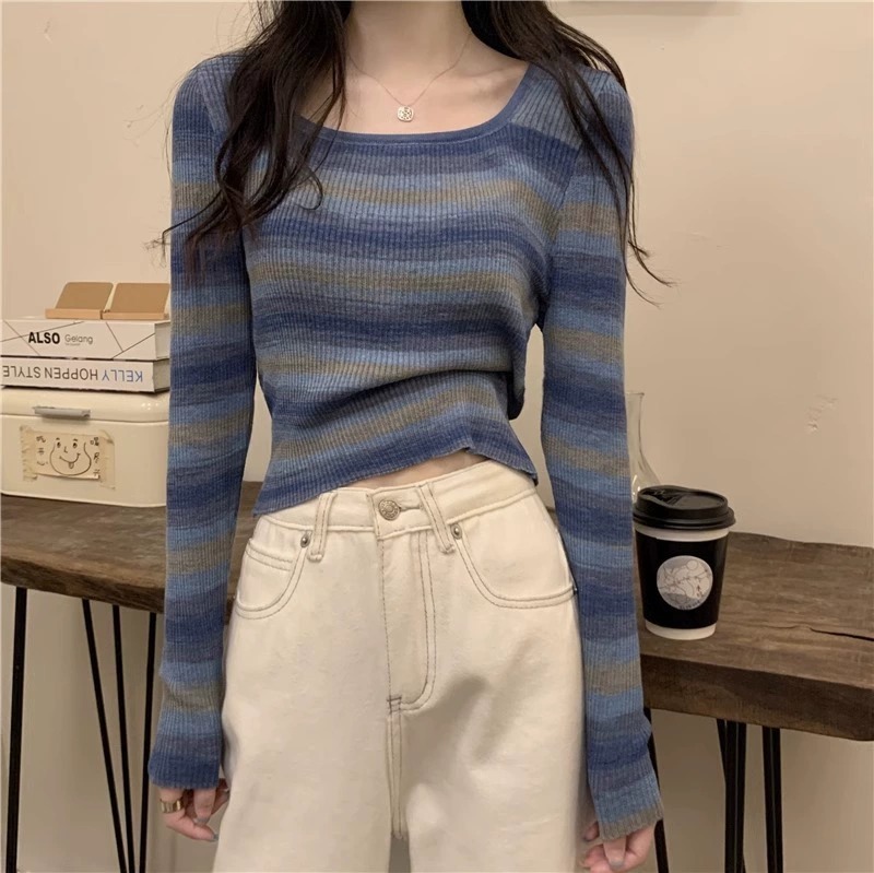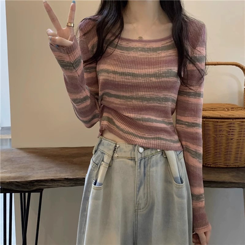 2024 가을과 겨울 새 광장 칼라 스트라이프 긴팔 니트베이스 셔츠 여성용 슬림핏 슬리밍 스파이스 걸 쇼트탑