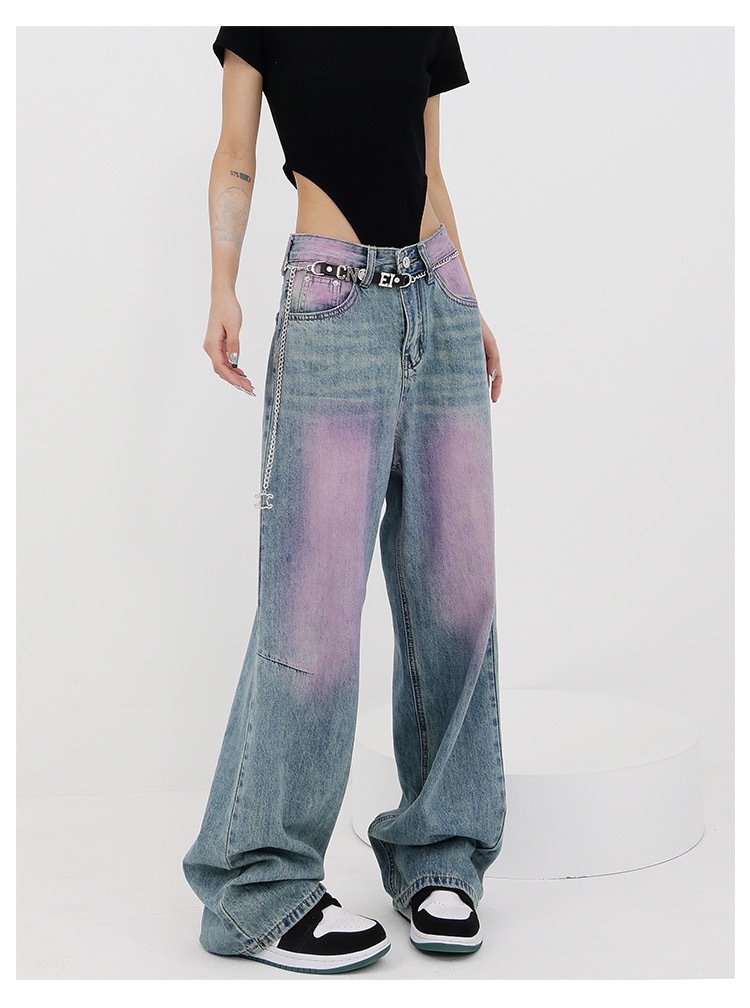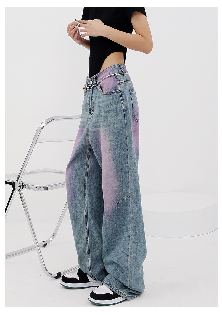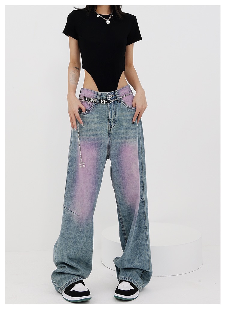독특한 파란색과 보라색 대비 캐주얼 청바지 여성 여름 새로운 높은 허리 느슨한 슬리밍 스트레이트 올 매치 와이드 레그 바지스토어 가기