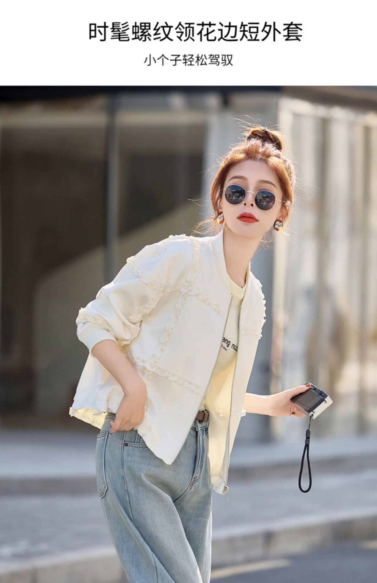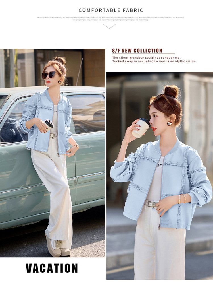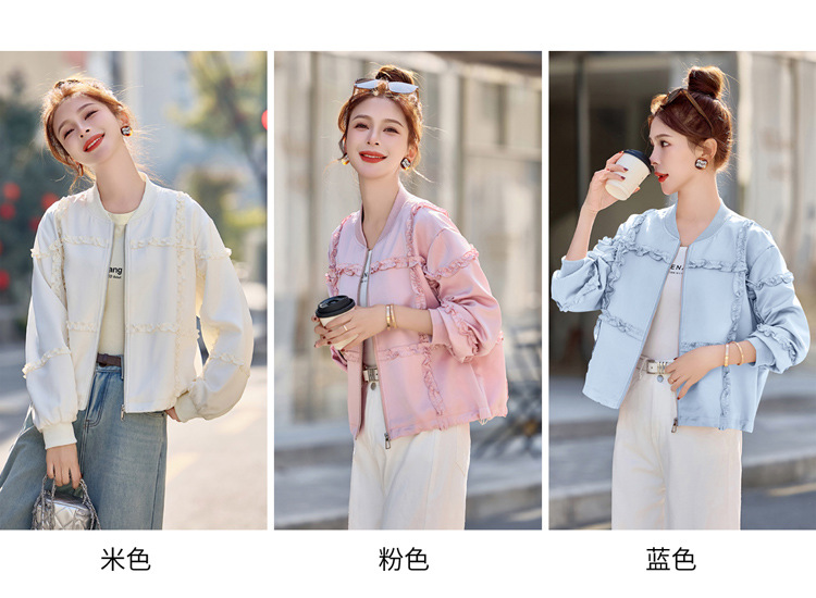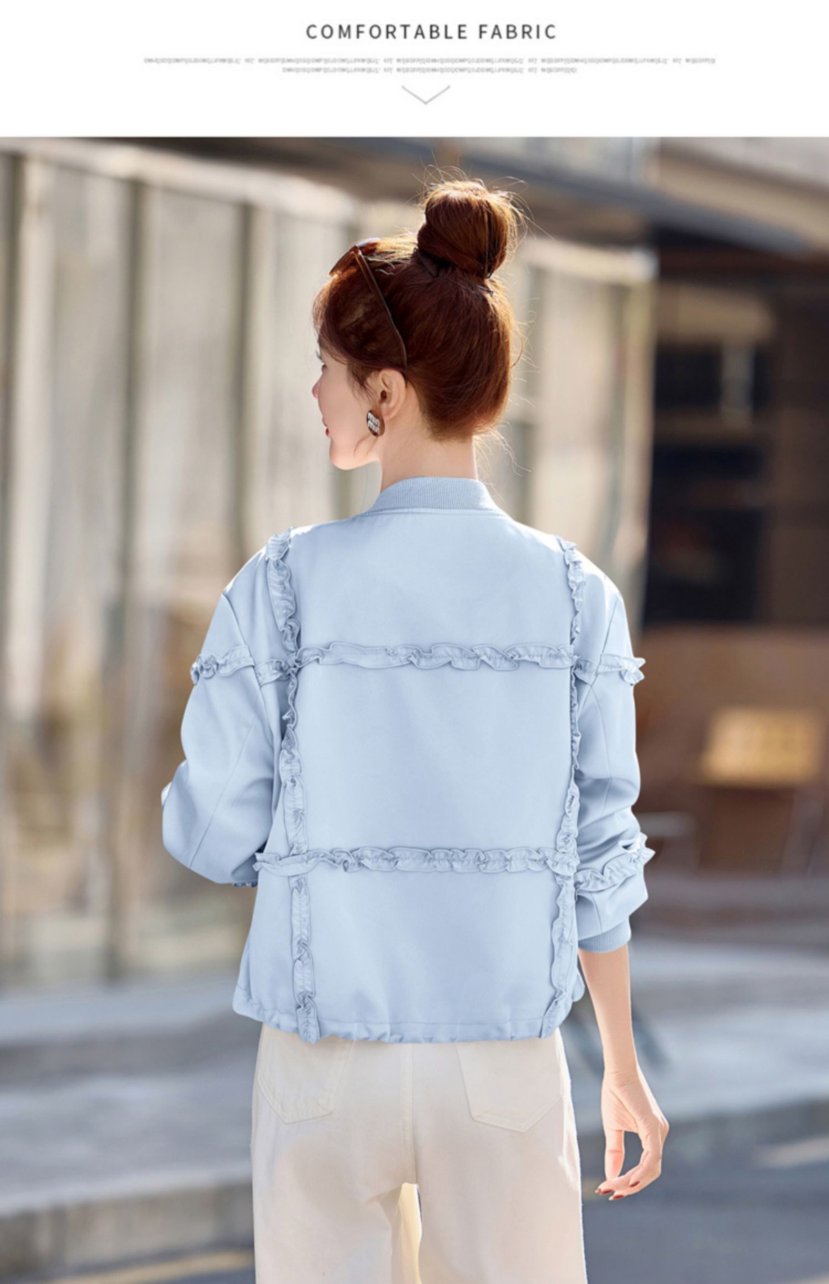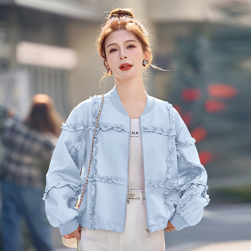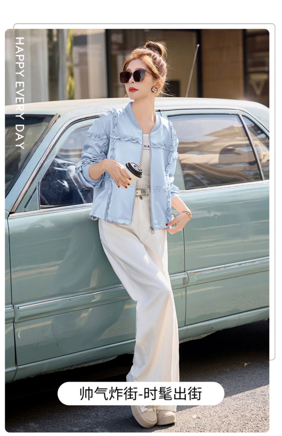 블루 캐주얼 코트 여자 2025 봄과 가을 새로운 도착 귀 테두리 느슨한 나이 감소 작은 야구 세트 재킷 탑