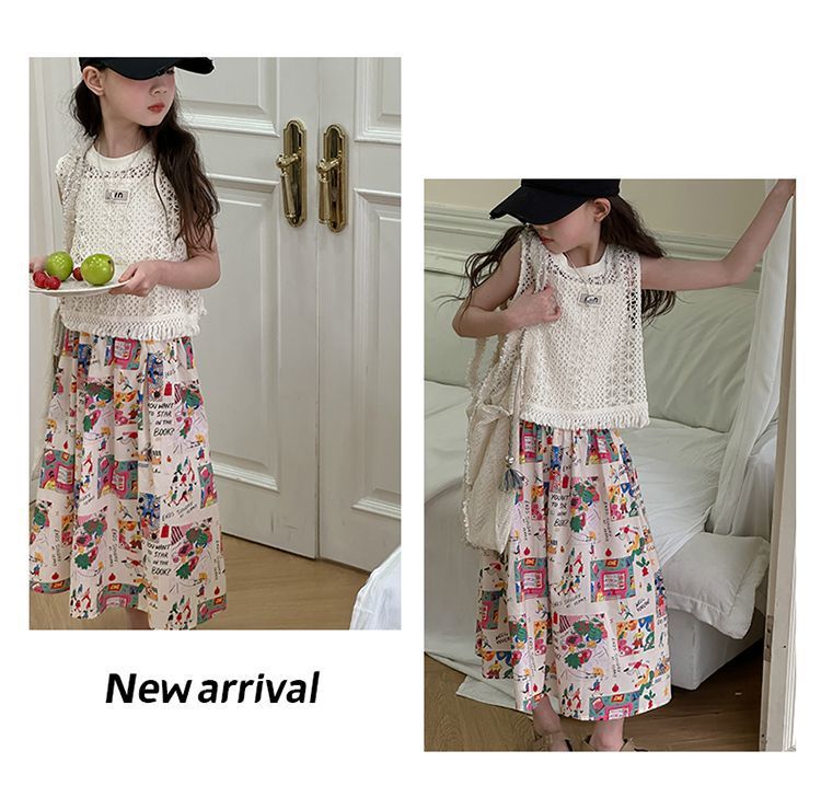 소녀 여름 2024 새로운 스타일 한국 스타일 세트 중공 조끼 슬링 깨진 시메아 스커트 여름 3 피스 세트스토어 가기